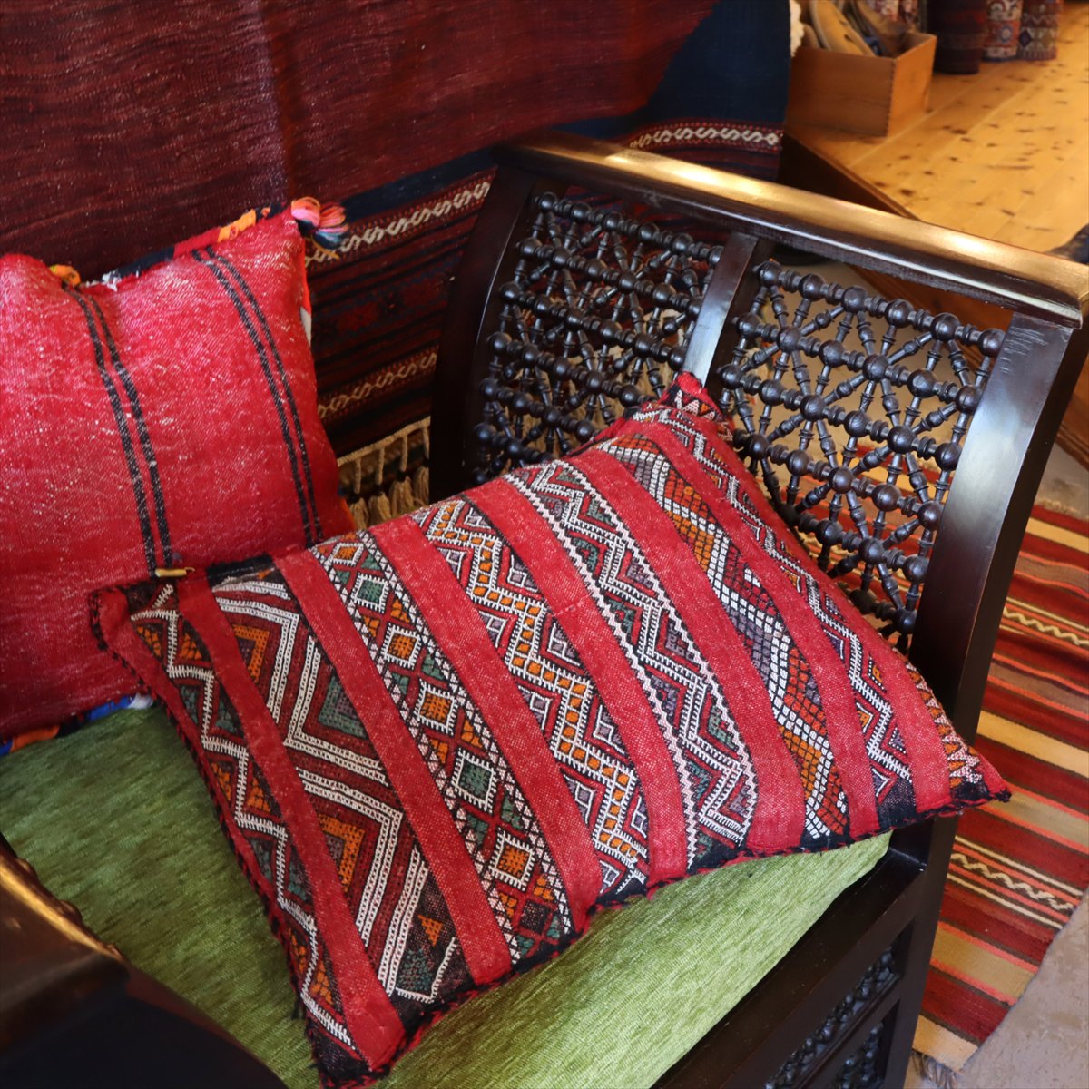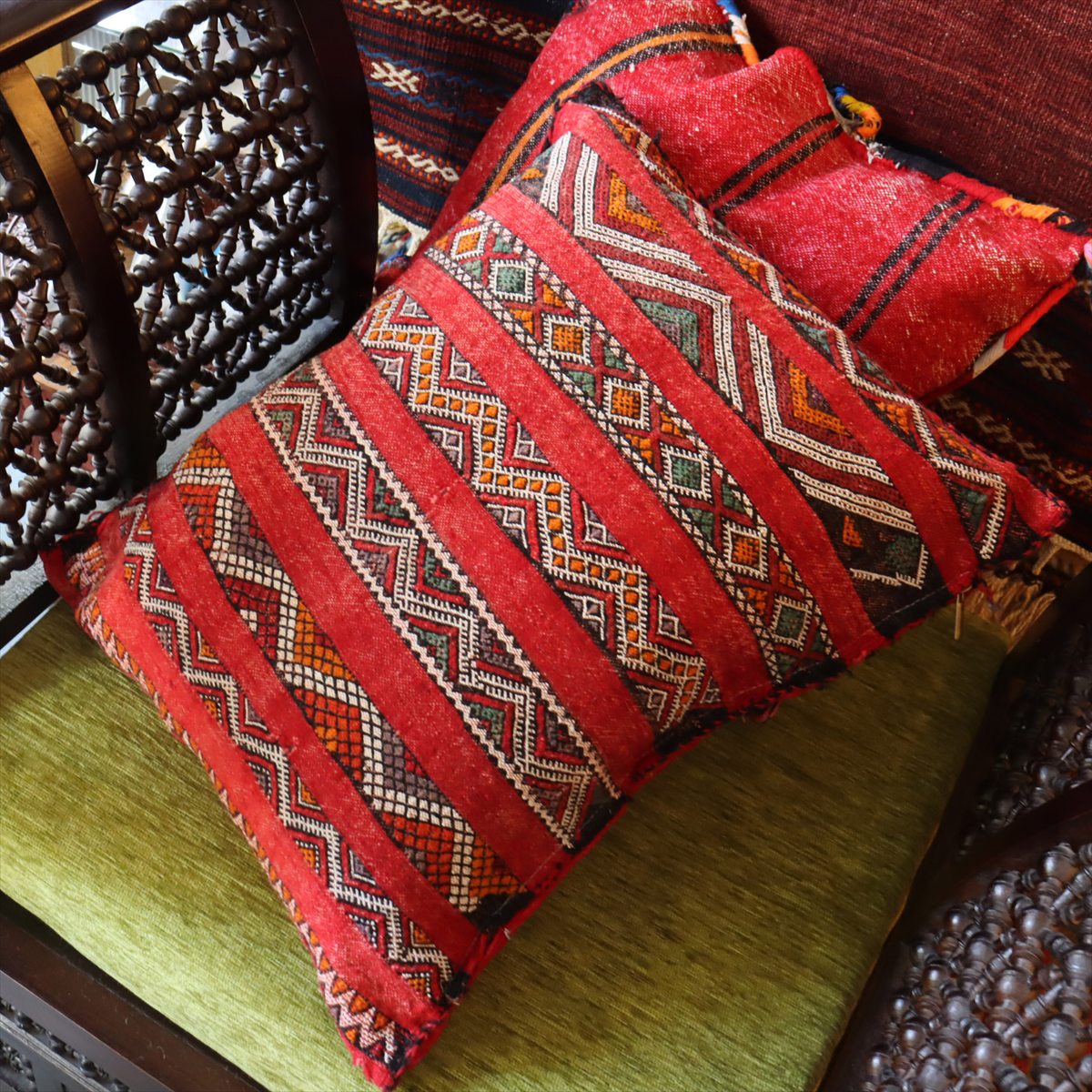 ゼンモール族の伝統的な色使いで織られた赤と黒のキリムが使われ、クラシックなモロカンスタイルにぴったりのクッション。裏面はカジュアルなストライプで、また違った雰囲気が楽しめます。