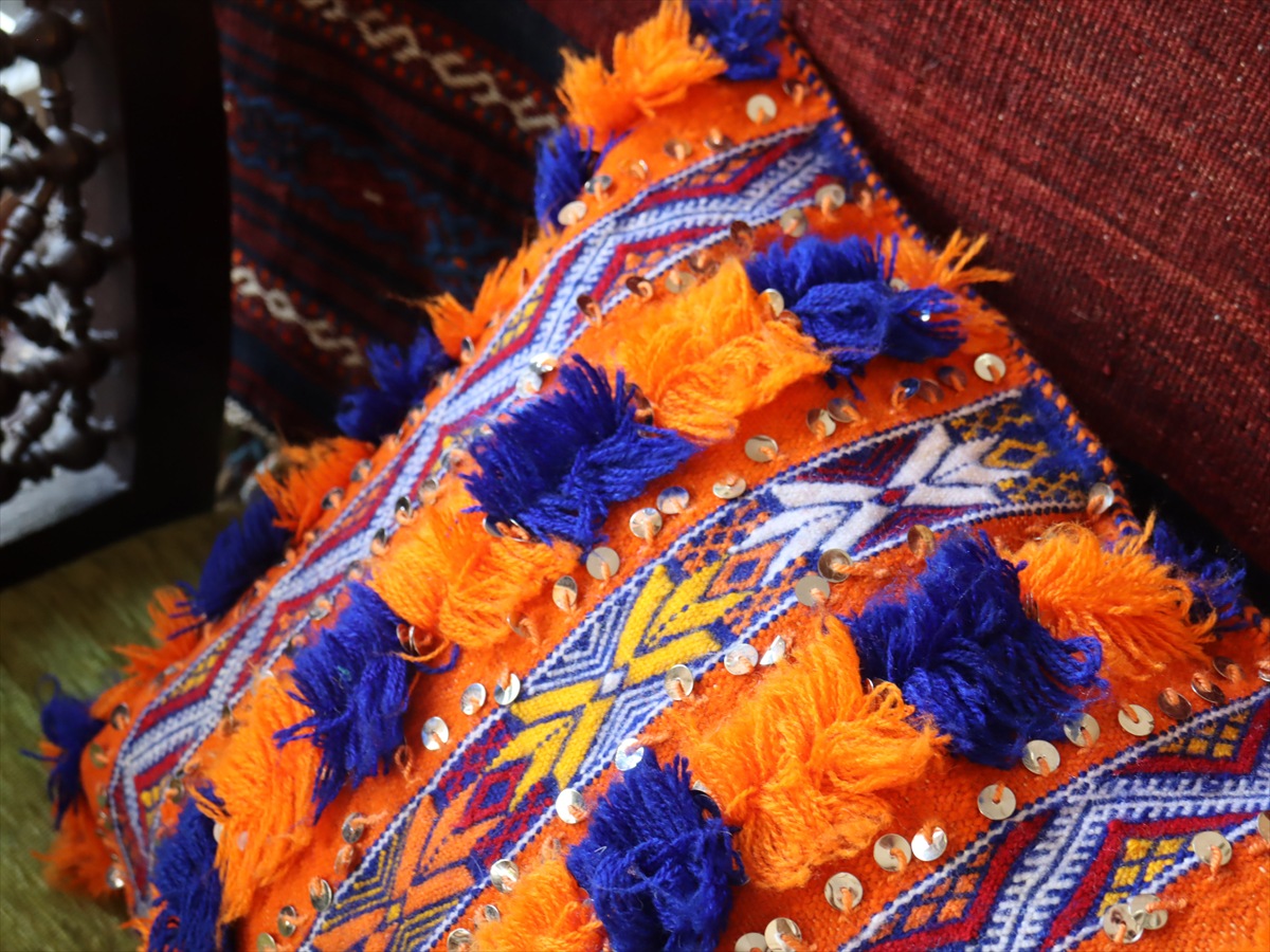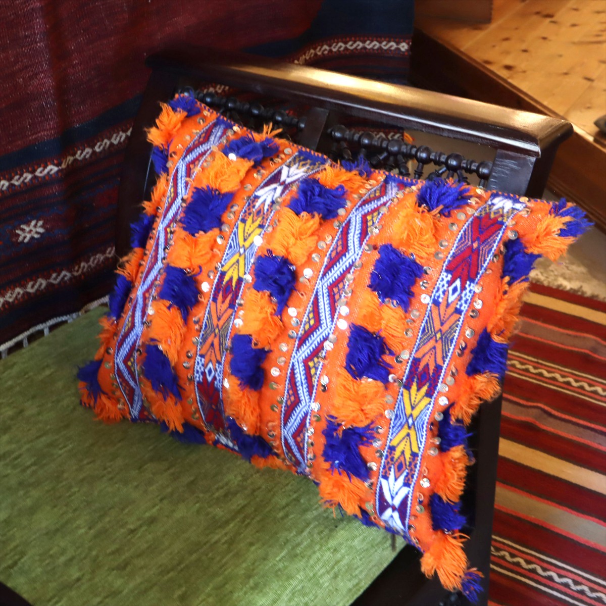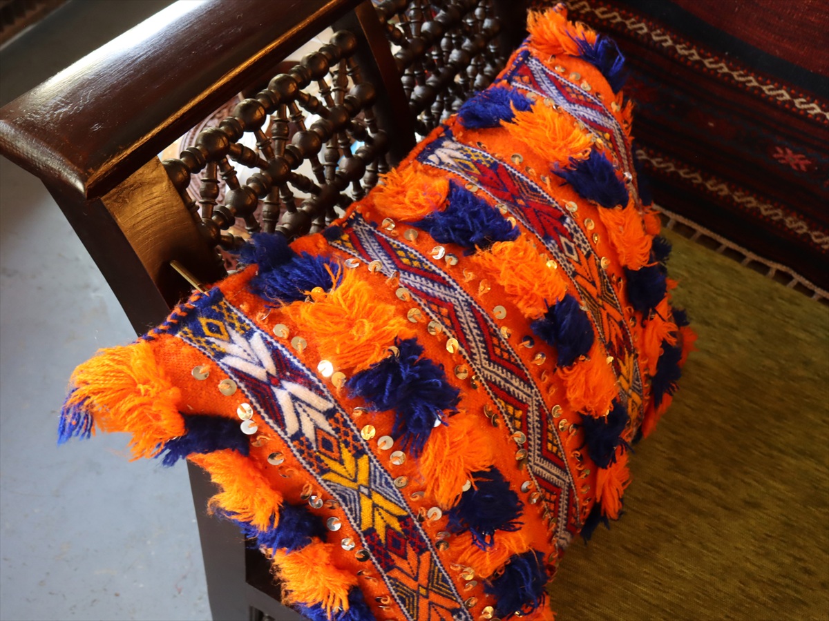 オールドキリムクッション モロッコ オリジナル46×38cm ベルベル族 ポンポンとスパンコール オレンジ