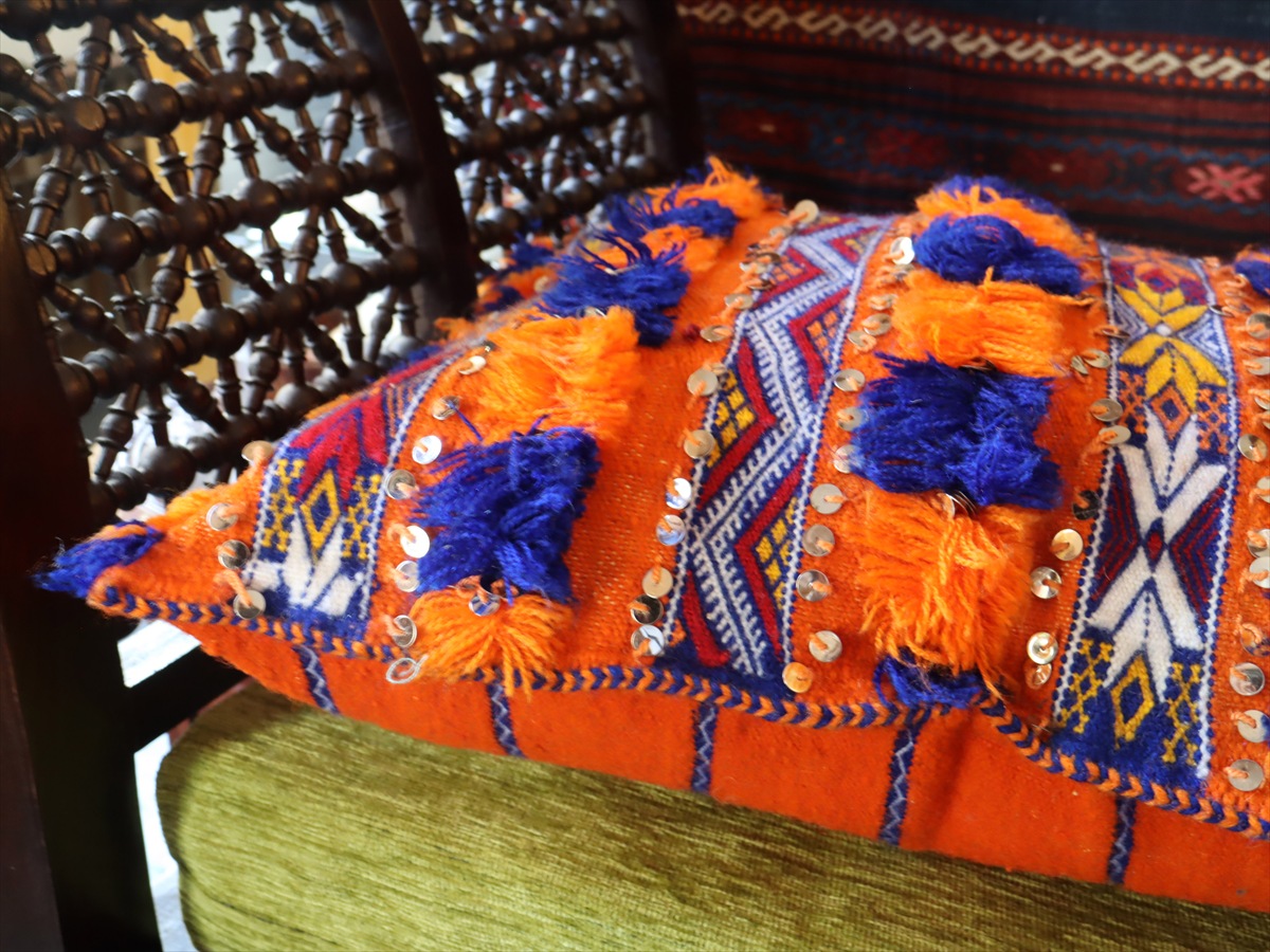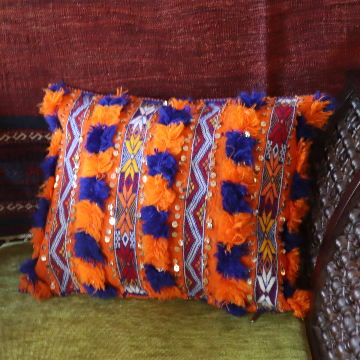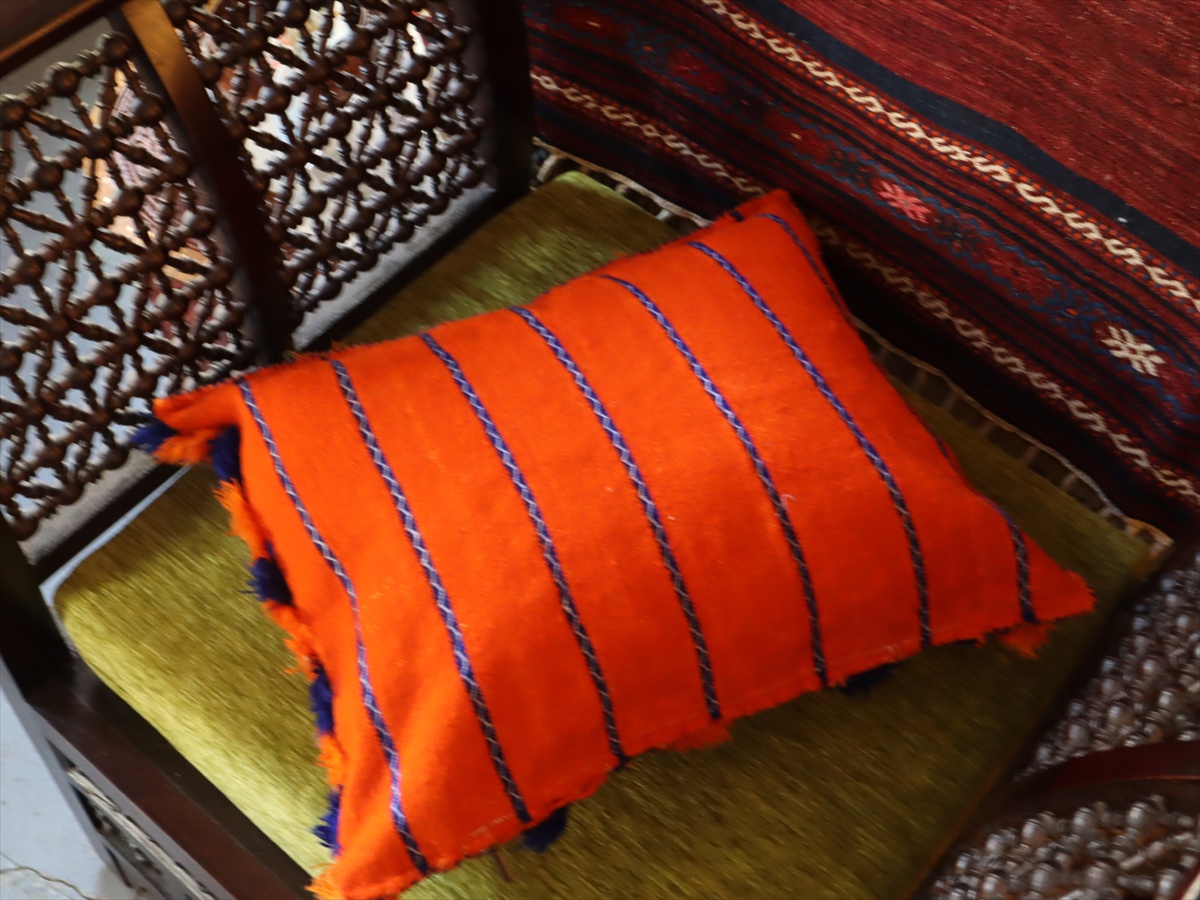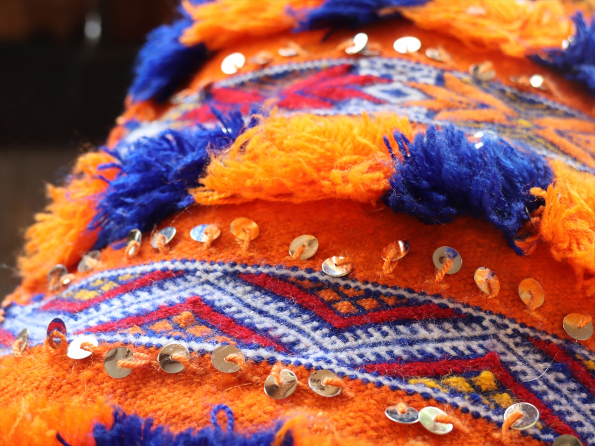 オールドキリムクッション モロッコ オリジナル46×38cm ベルベル族 ポンポンとスパンコール オレンジ