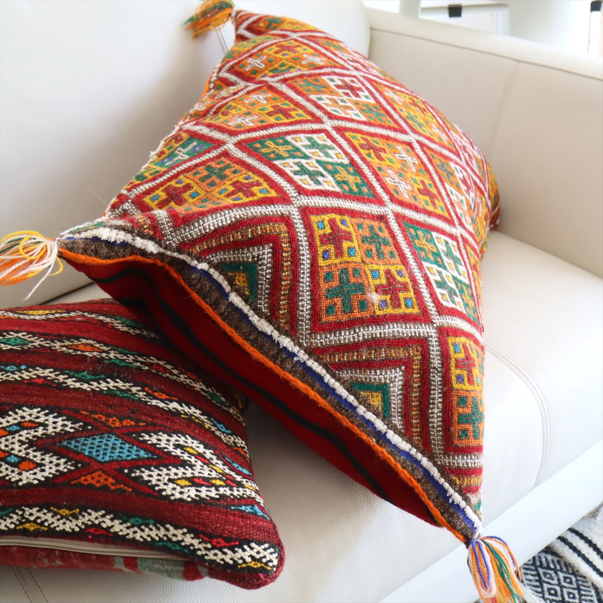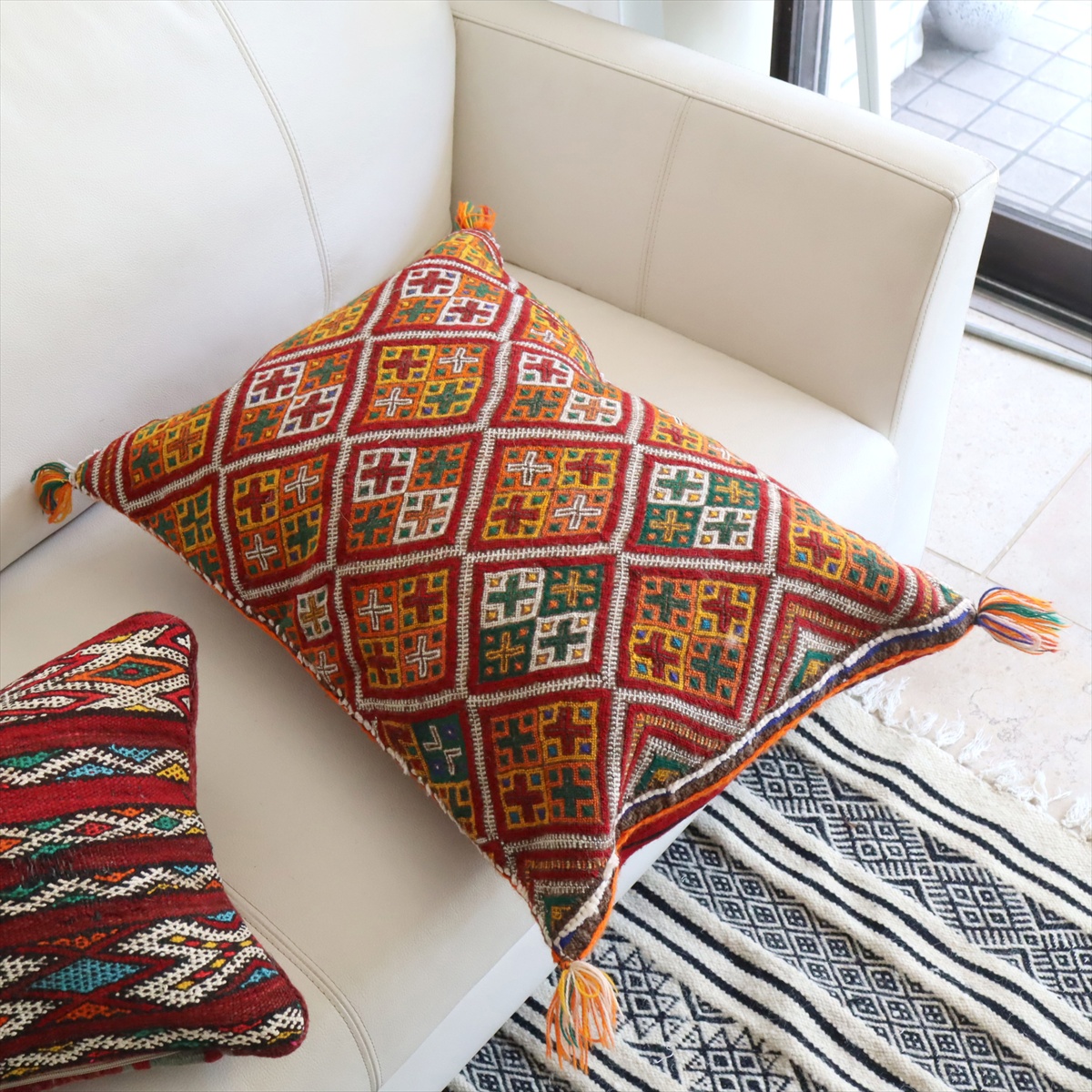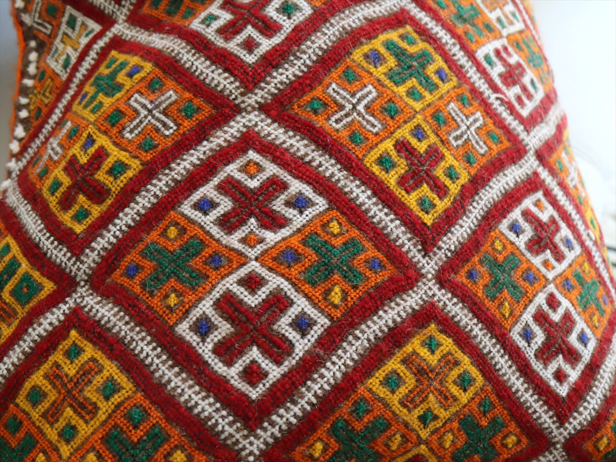 もともとクッションとして使うために織られたもので、表と裏はつながった一枚のキリムです。表面は飾り糸をからめながら織るジジム織りで、立体感のあるテクスチャが特徴です。
