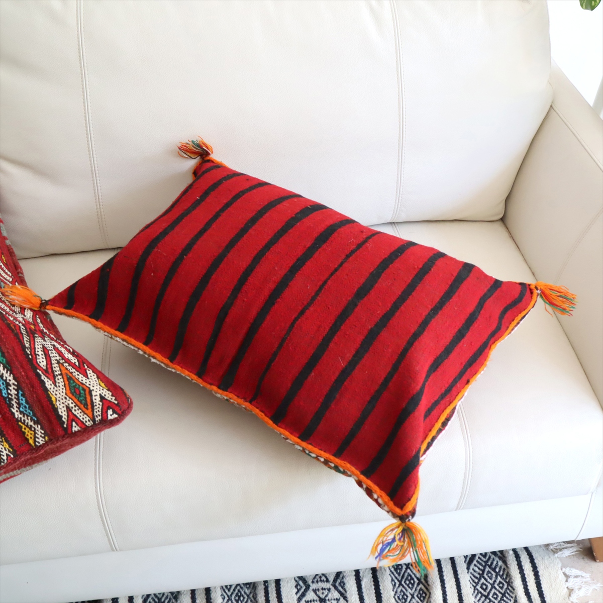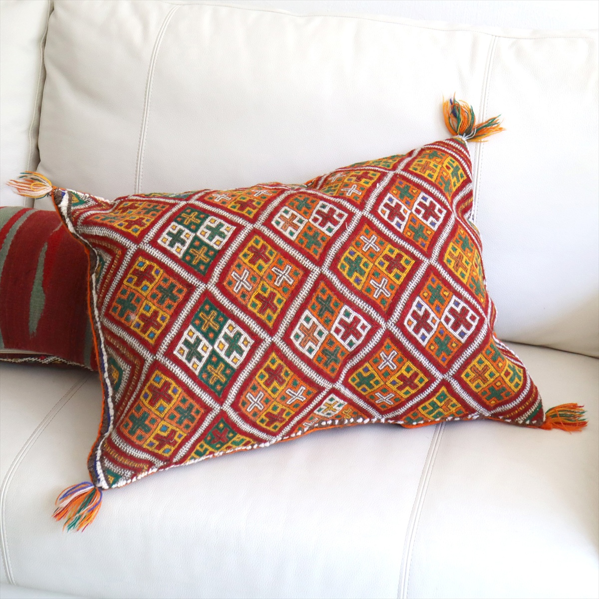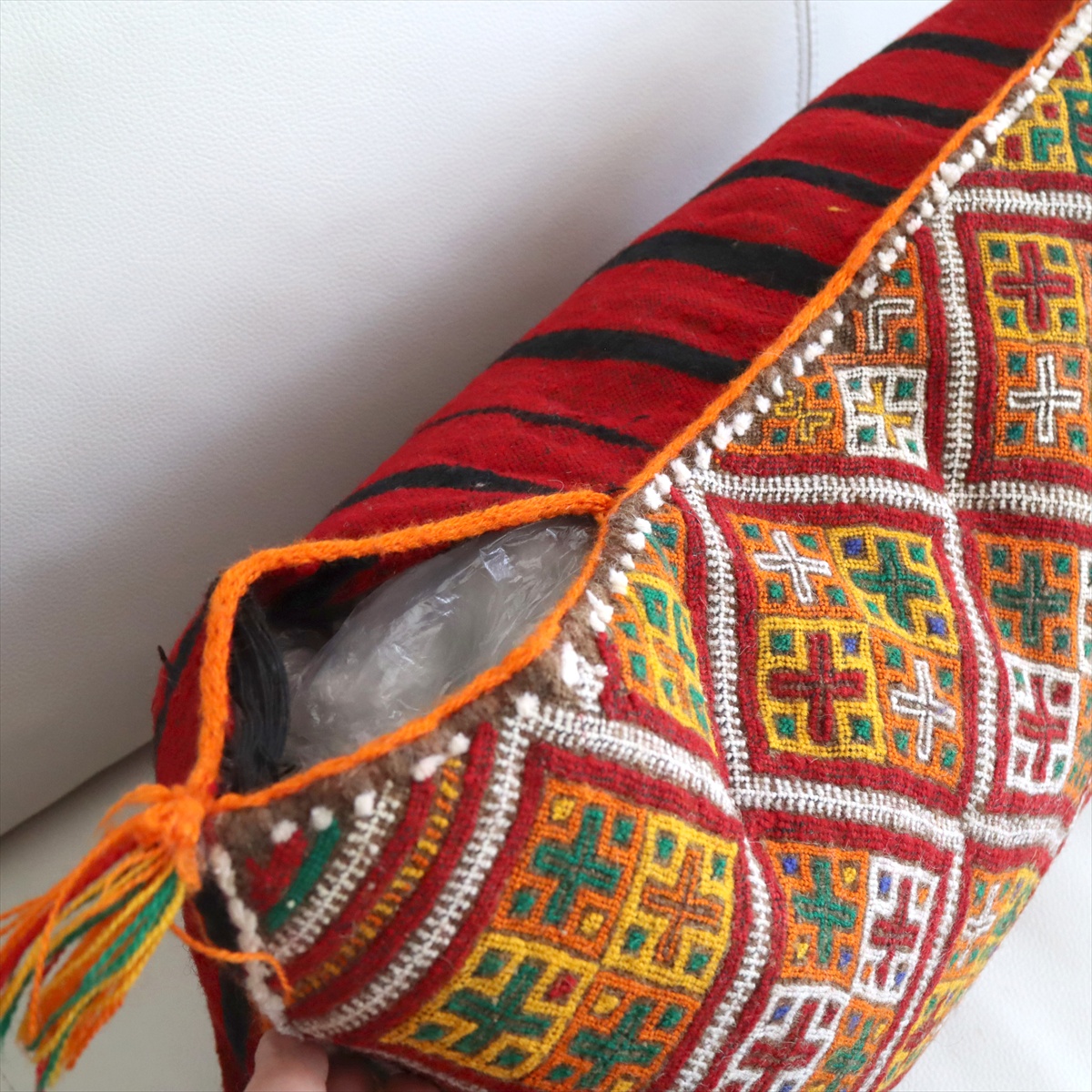 もともとクッションとして使うために織られたもので、表と裏はつながった一枚のキリムです。表面は飾り糸をからめながら織るジジム織りで、立体感のあるテクスチャが特徴です。
