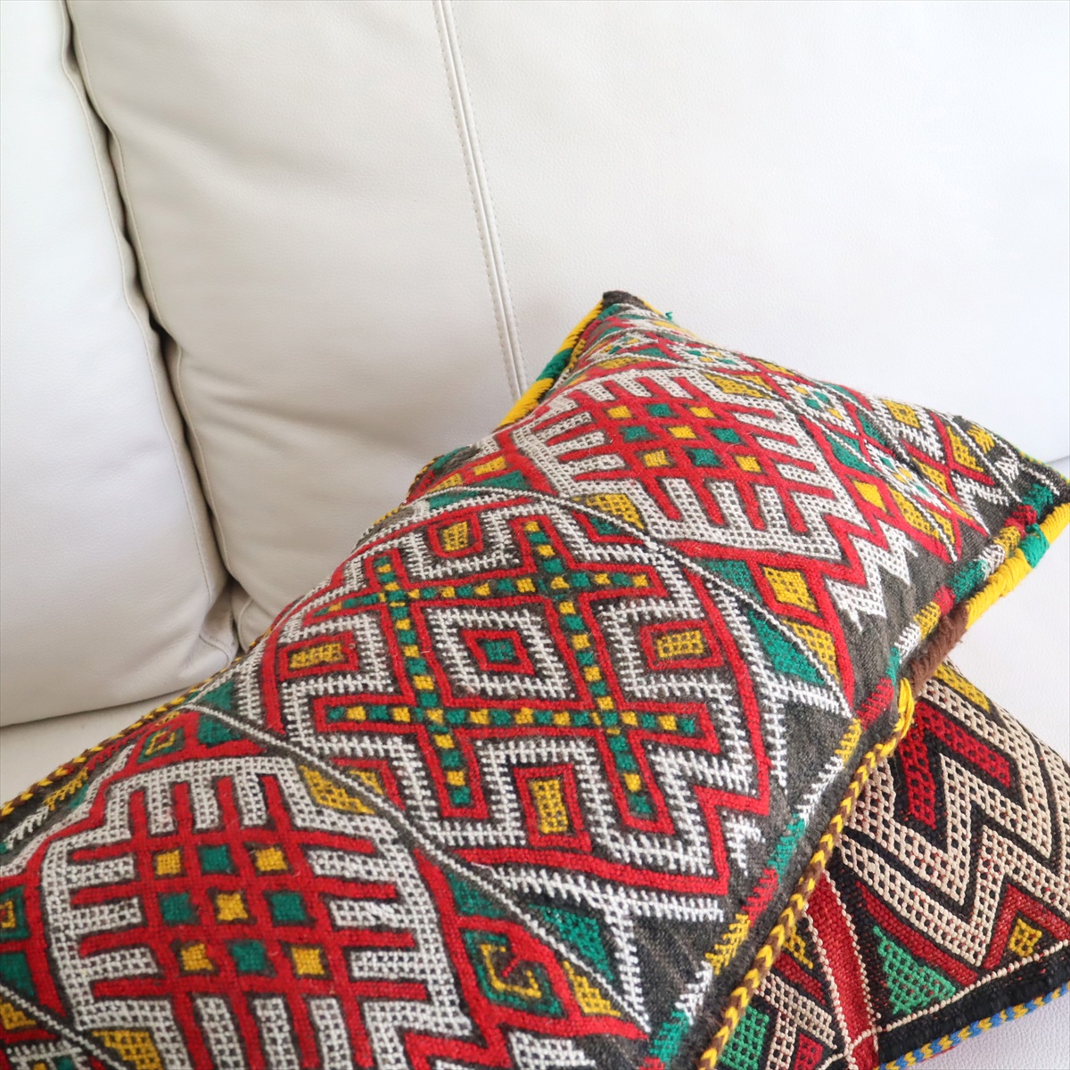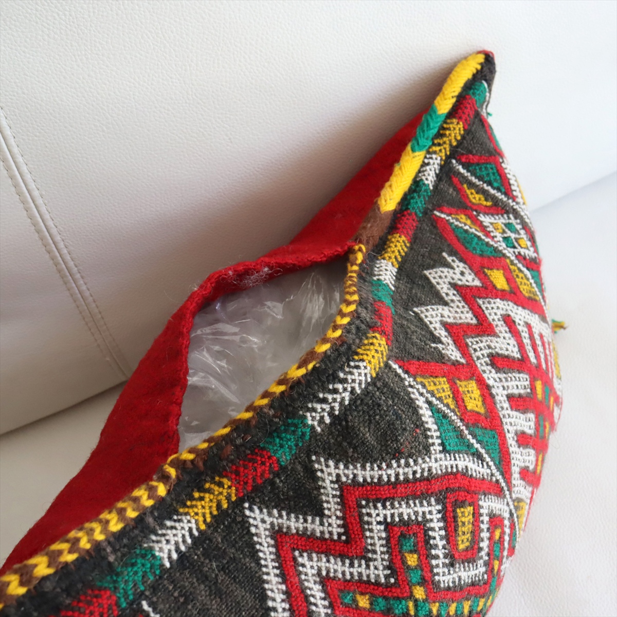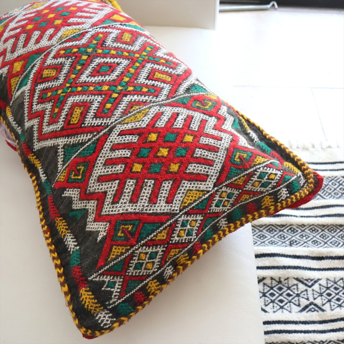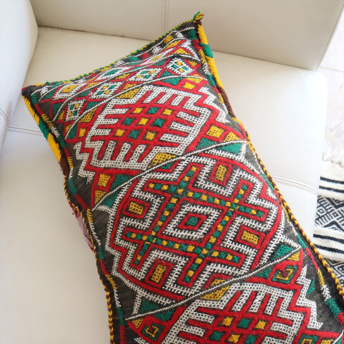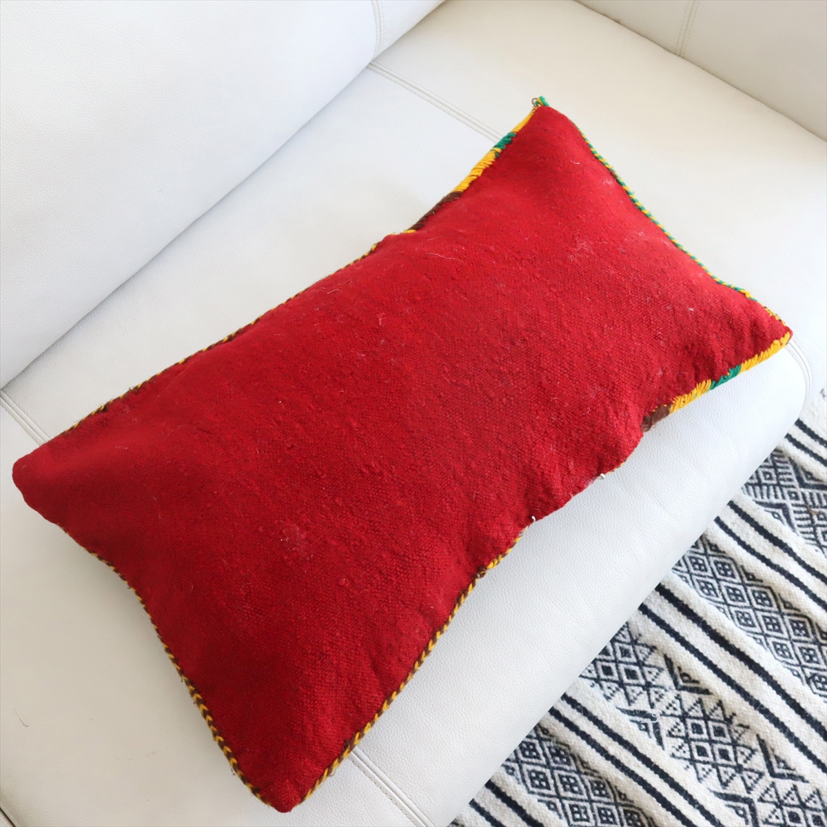 もともとクッションとして使うために織られたもので、表と裏はつながった一枚のキリムです。表面は飾り糸をからめながら織るジジム織りで、立体感のあるテクスチャが特徴です。