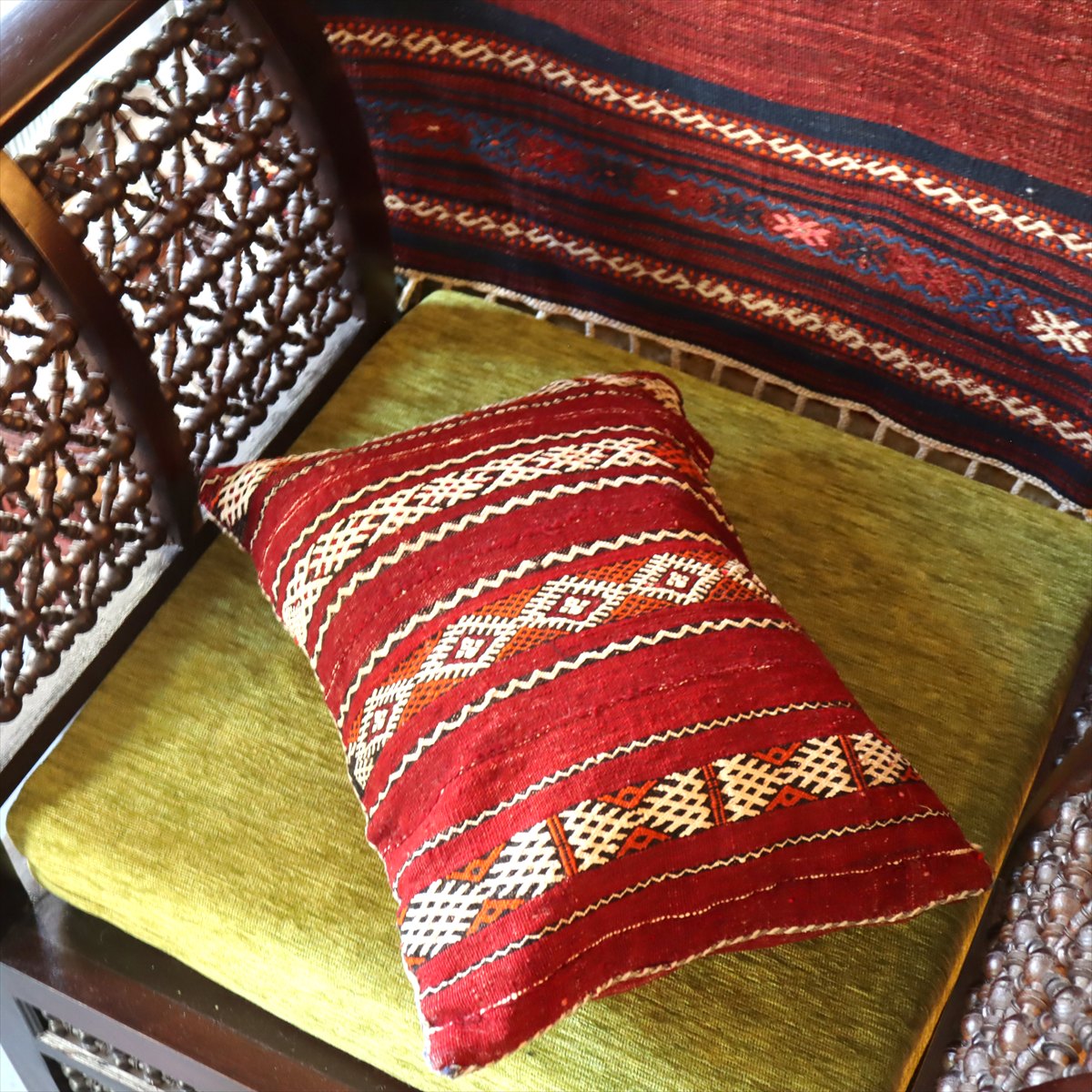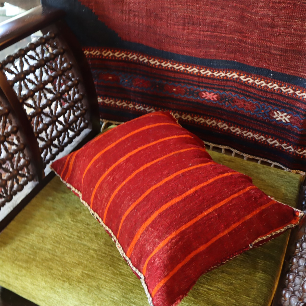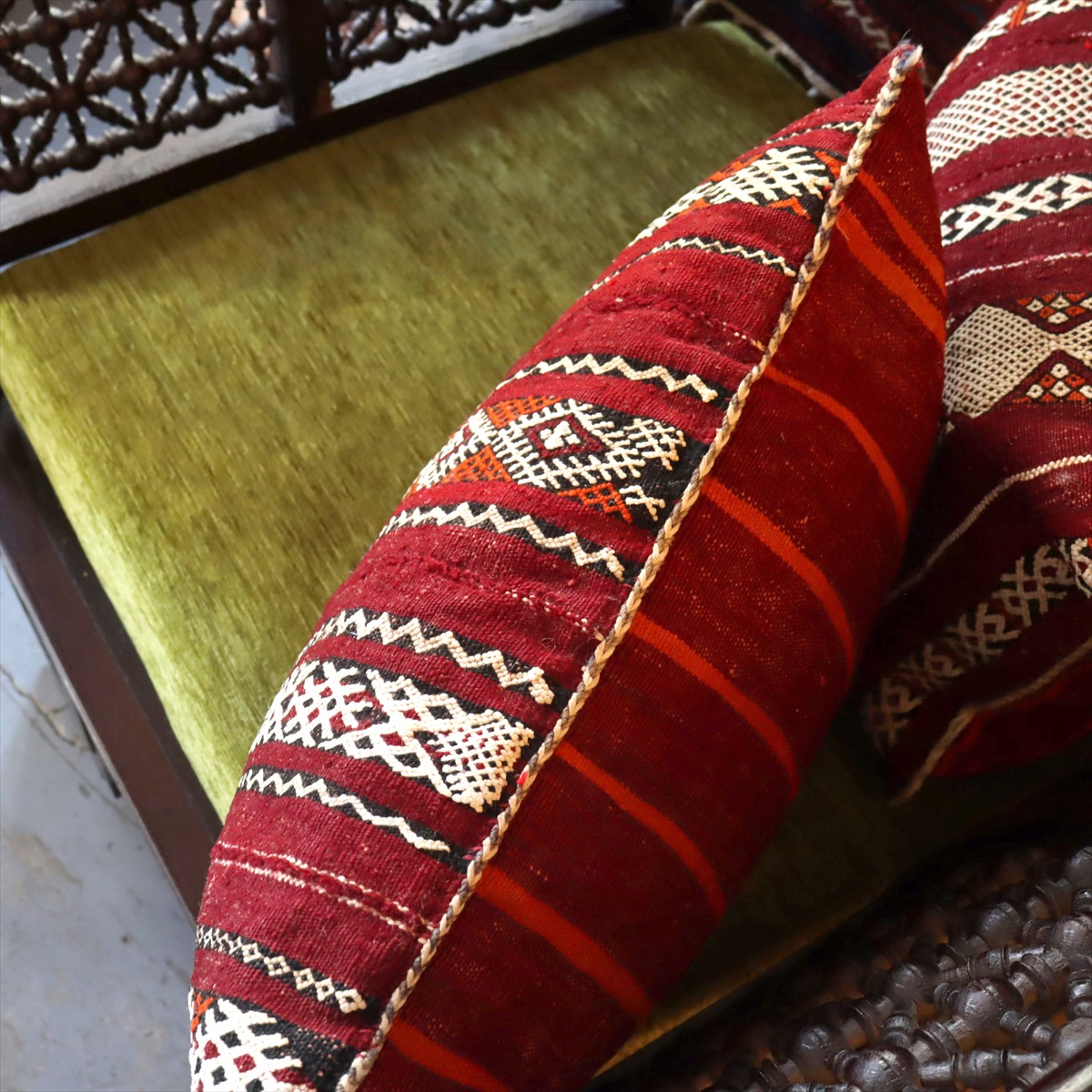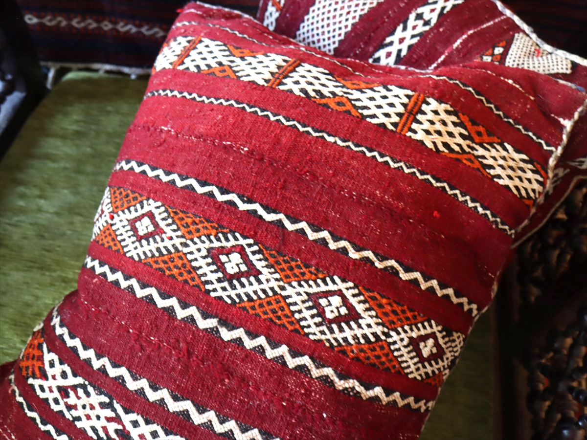 ゼンモール族の伝統的な色使いで織られた赤と黒のキリムが使われ、クラシックなモロカンスタイルにぴったりのクッション。裏面はカジュアルなストライプで、また違った雰囲気が楽しめます。
