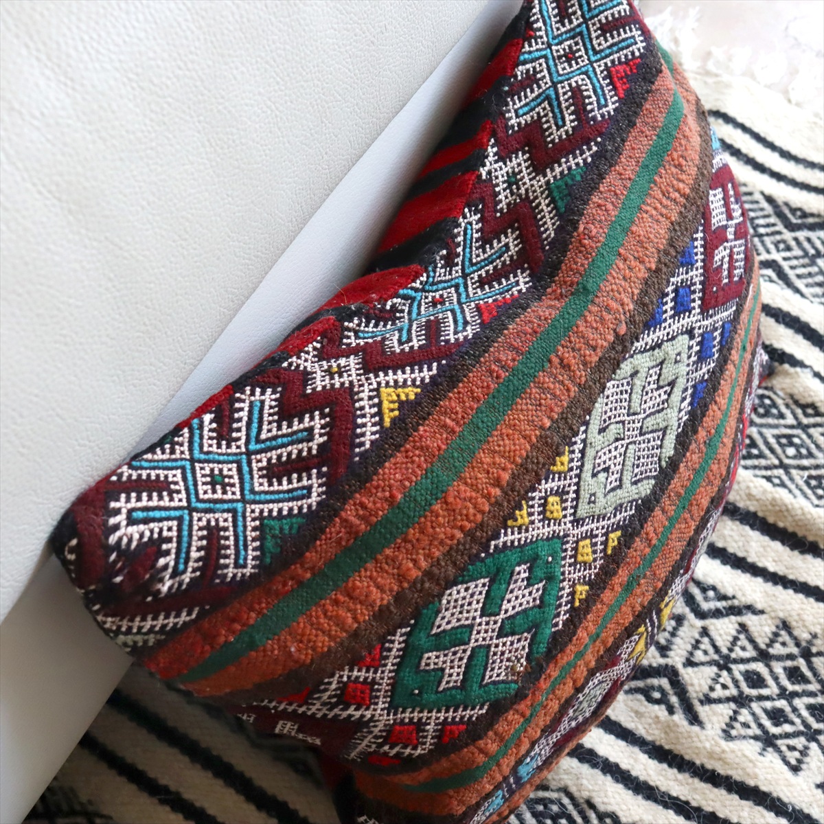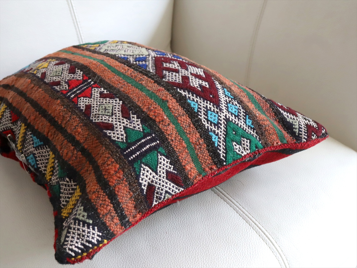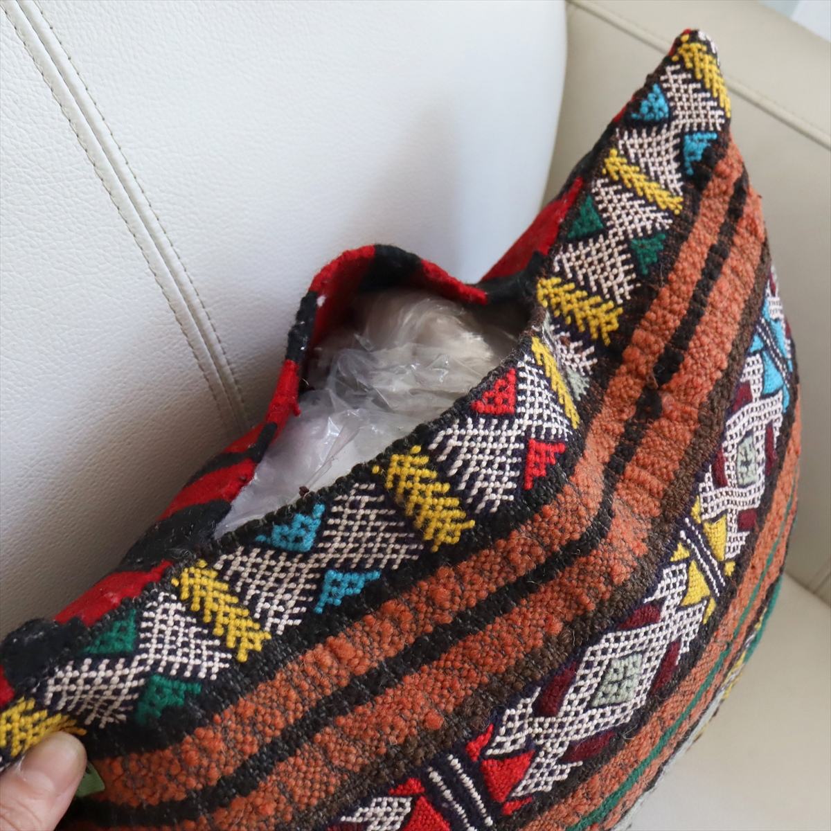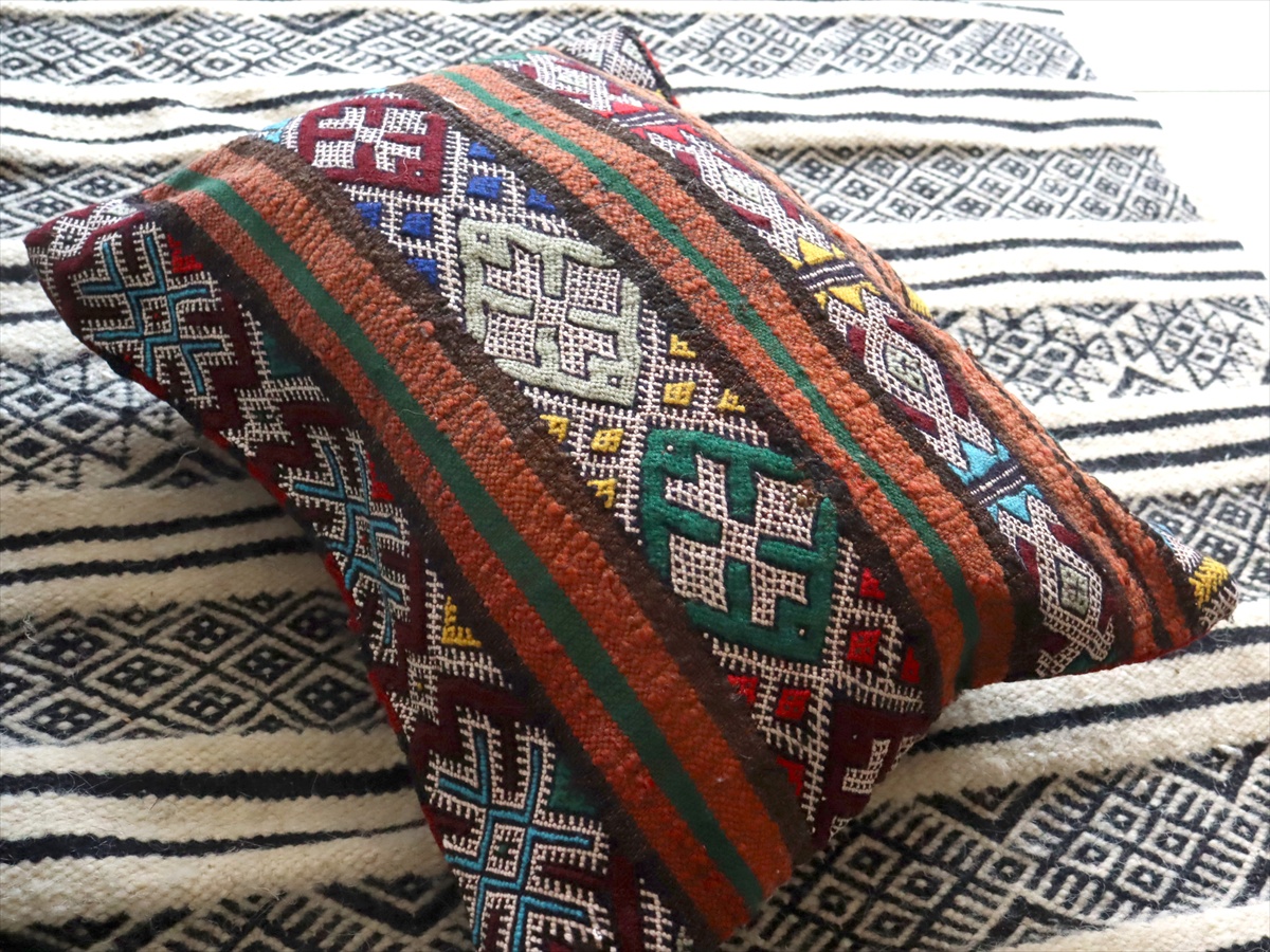 もともとクッションとして使うために織られたもので、表と裏はつながった一枚のキリムです。表面は飾り糸をからめながら織るジジム織りで、立体感のあるテクスチャが特徴です。