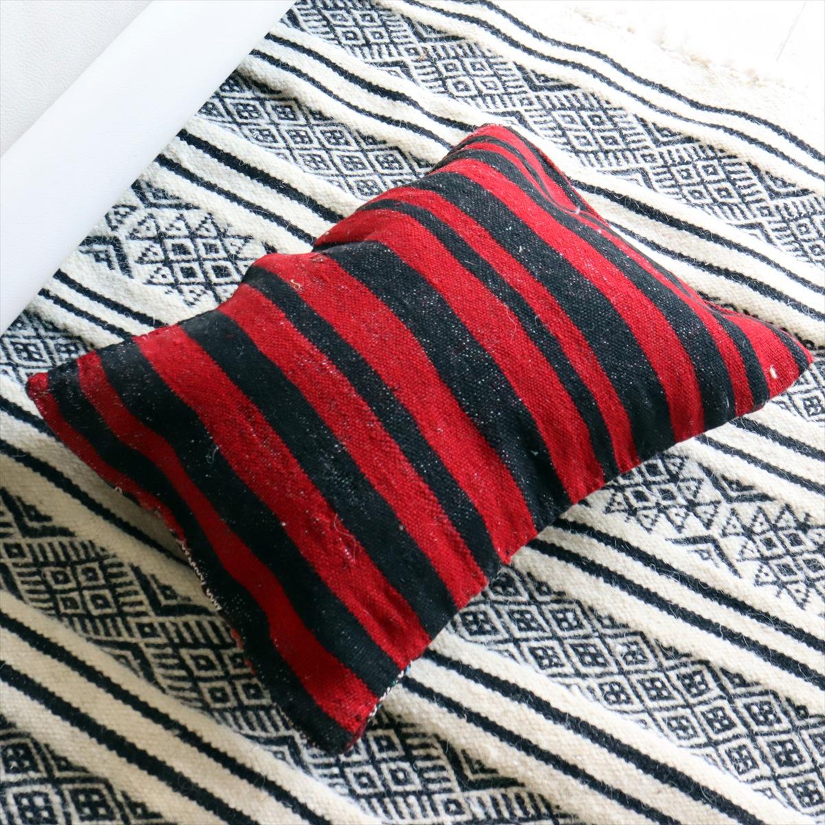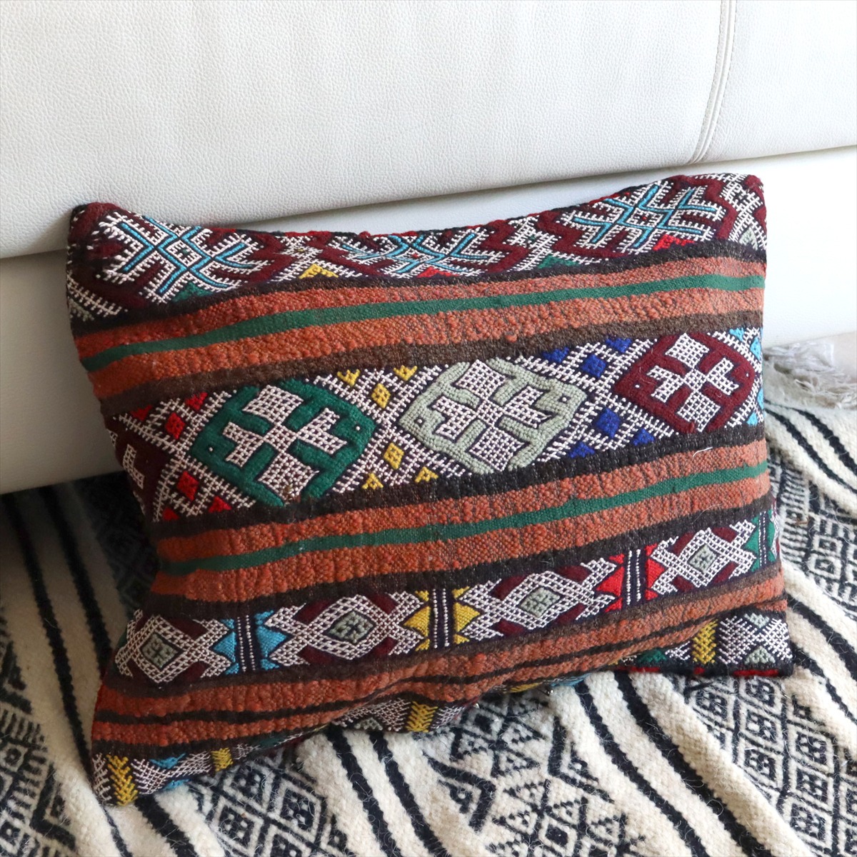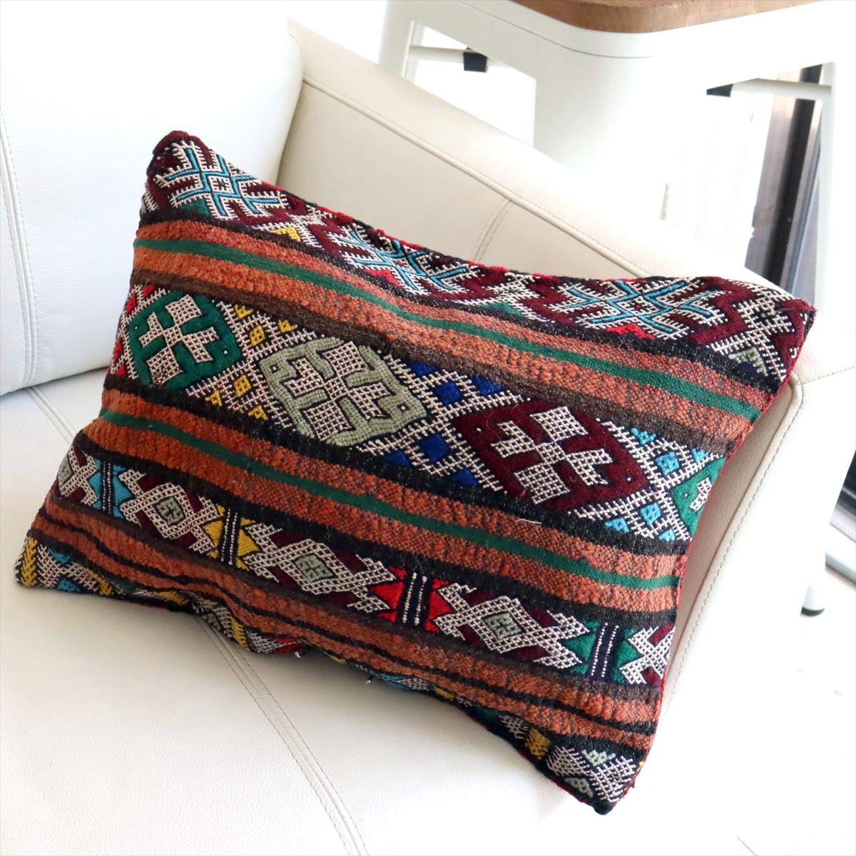 もともとクッションとして使うために織られたもので、表と裏はつながった一枚のキリムです。表面は飾り糸をからめながら織るジジム織りで、立体感のあるテクスチャが特徴です。