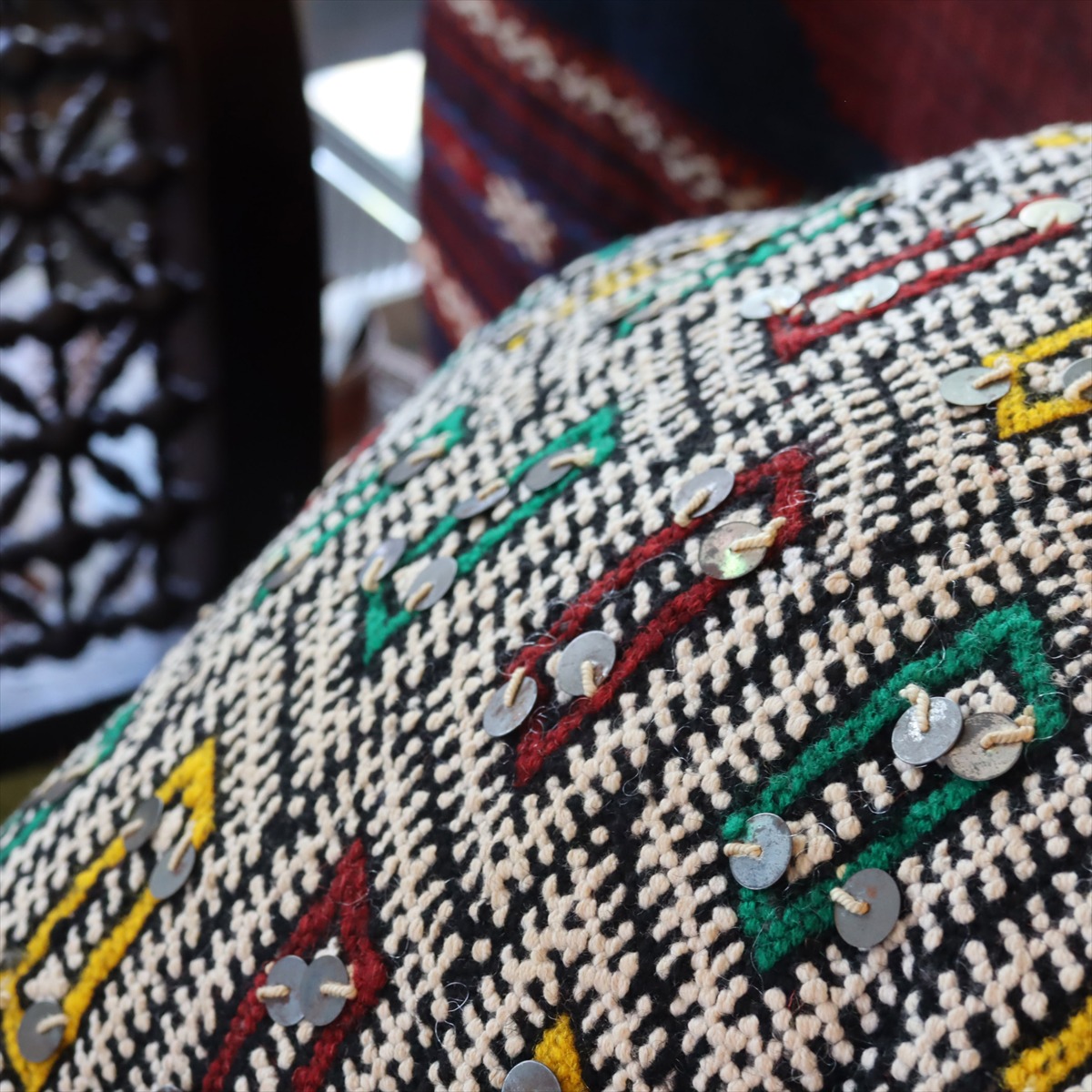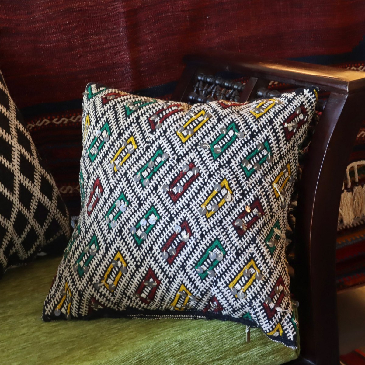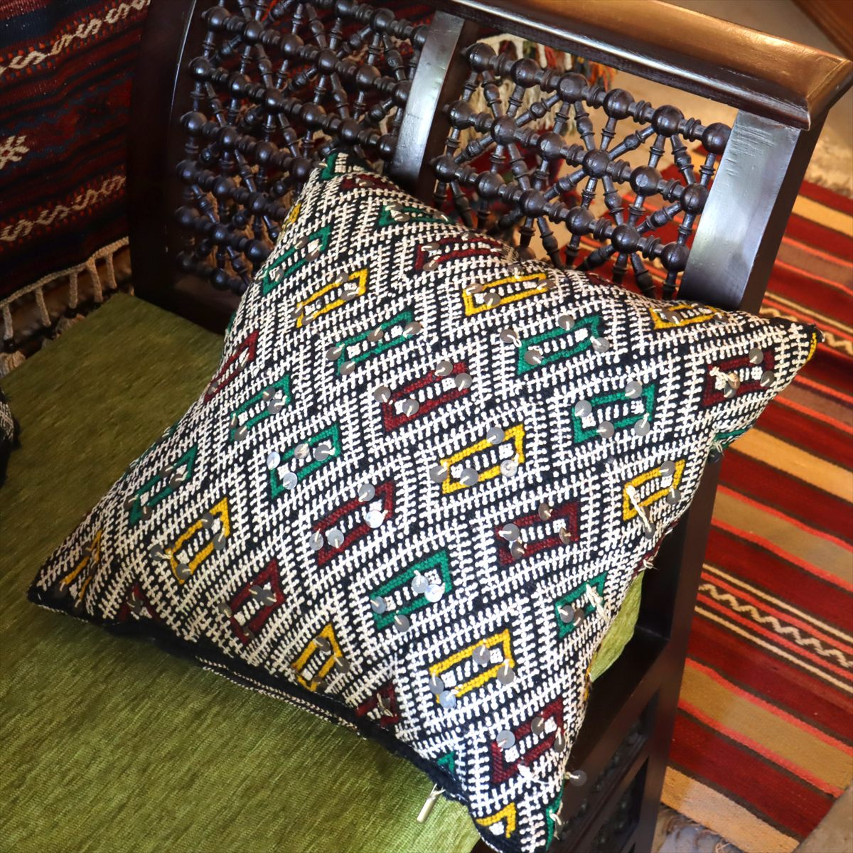 スパンコールで飾られたユニークなジジム織りのキリムが使われています。このクッションは40cm角サイズに縫製されたもので、裏面には黒い無地のキリムがあわせてあります。