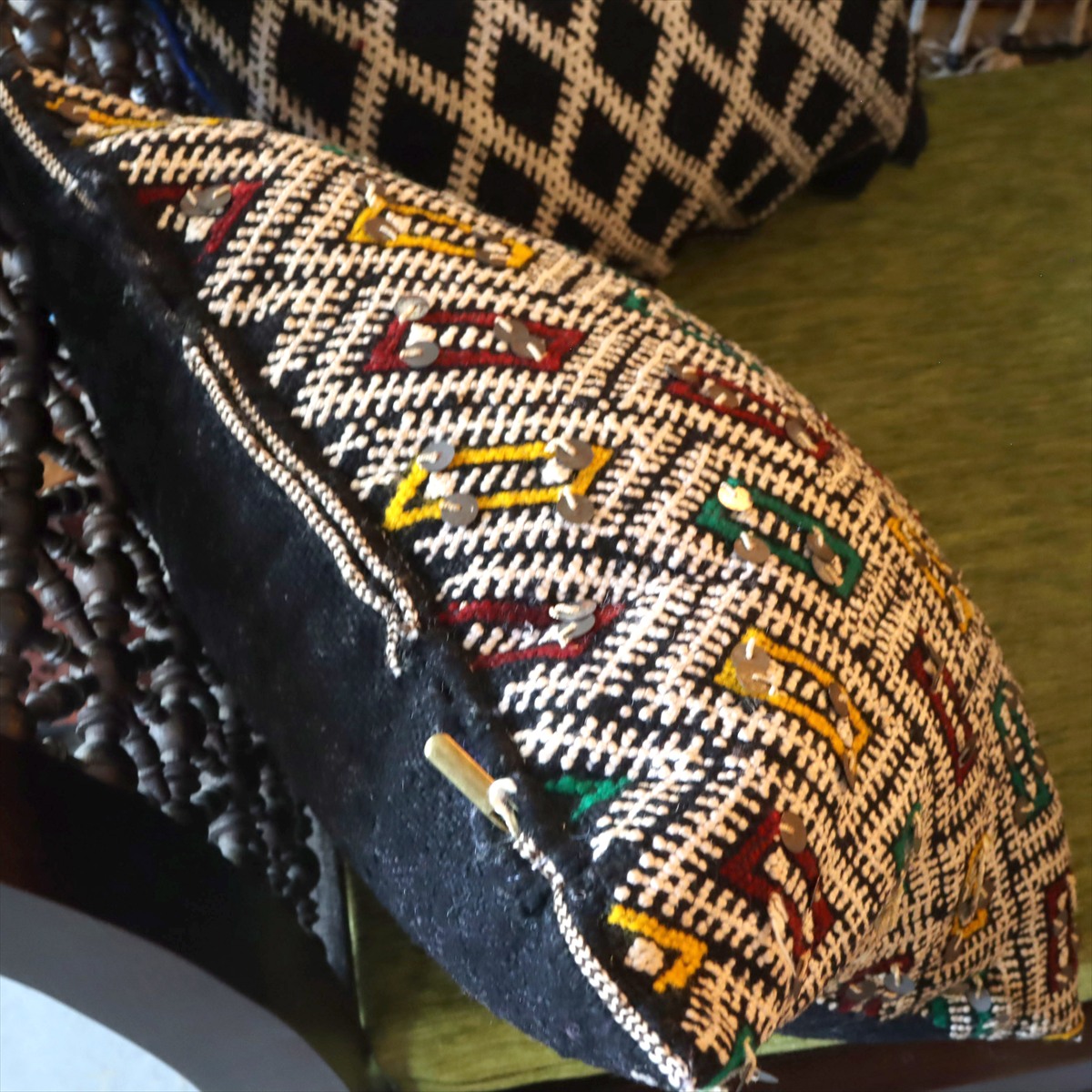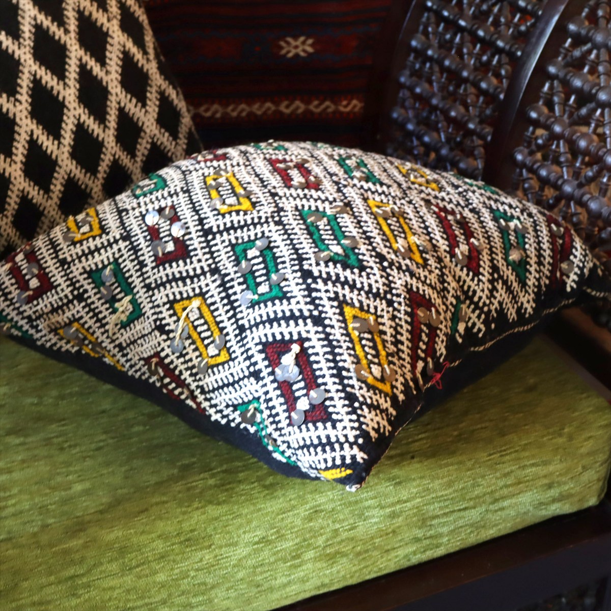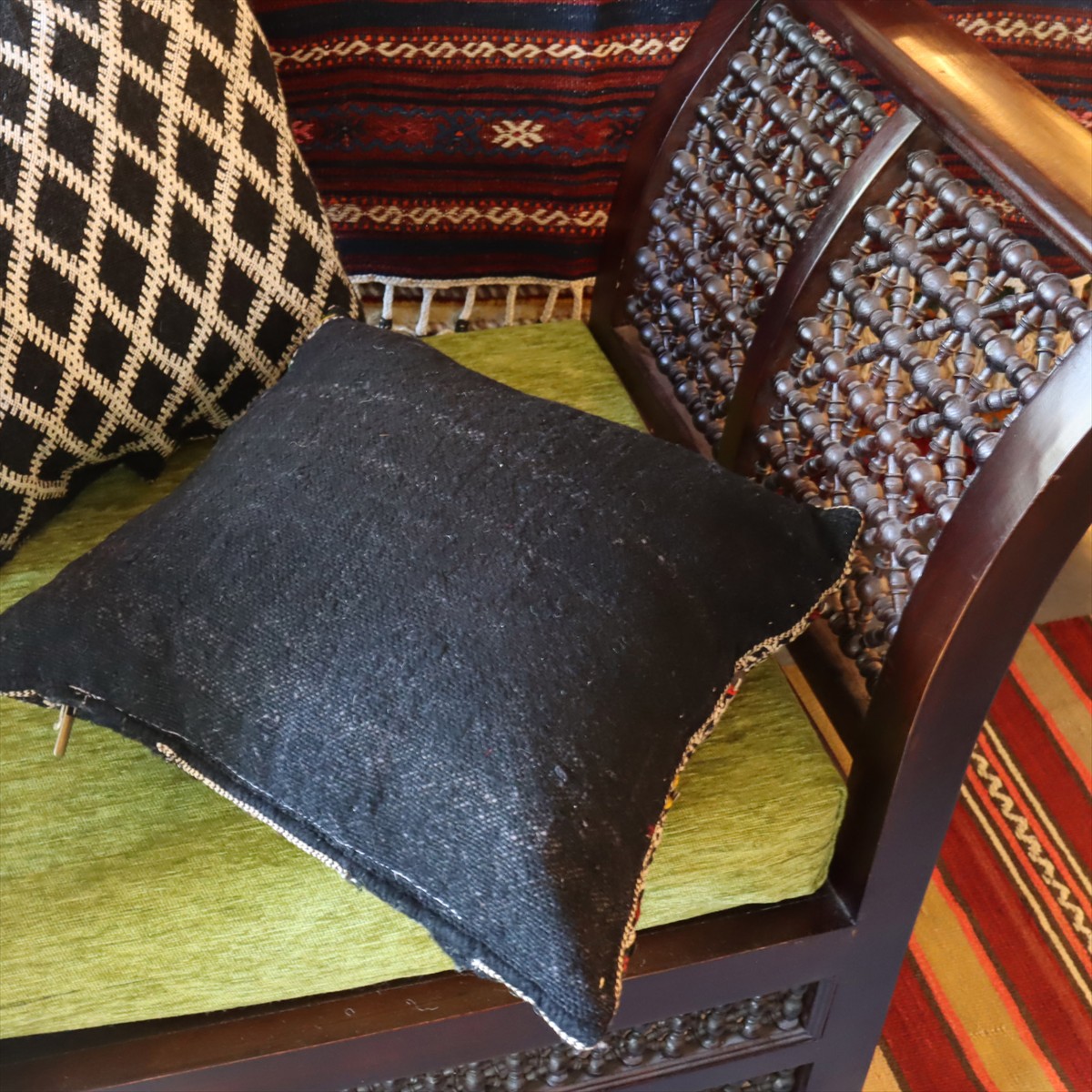 スパンコールで飾られたユニークなジジム織りのキリムが使われています。このクッションは40cm角サイズに縫製されたもので、裏面には黒い無地のキリムがあわせてあります。