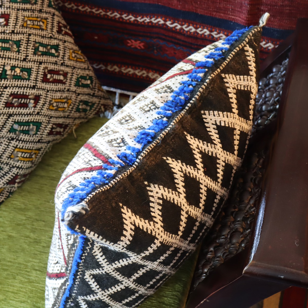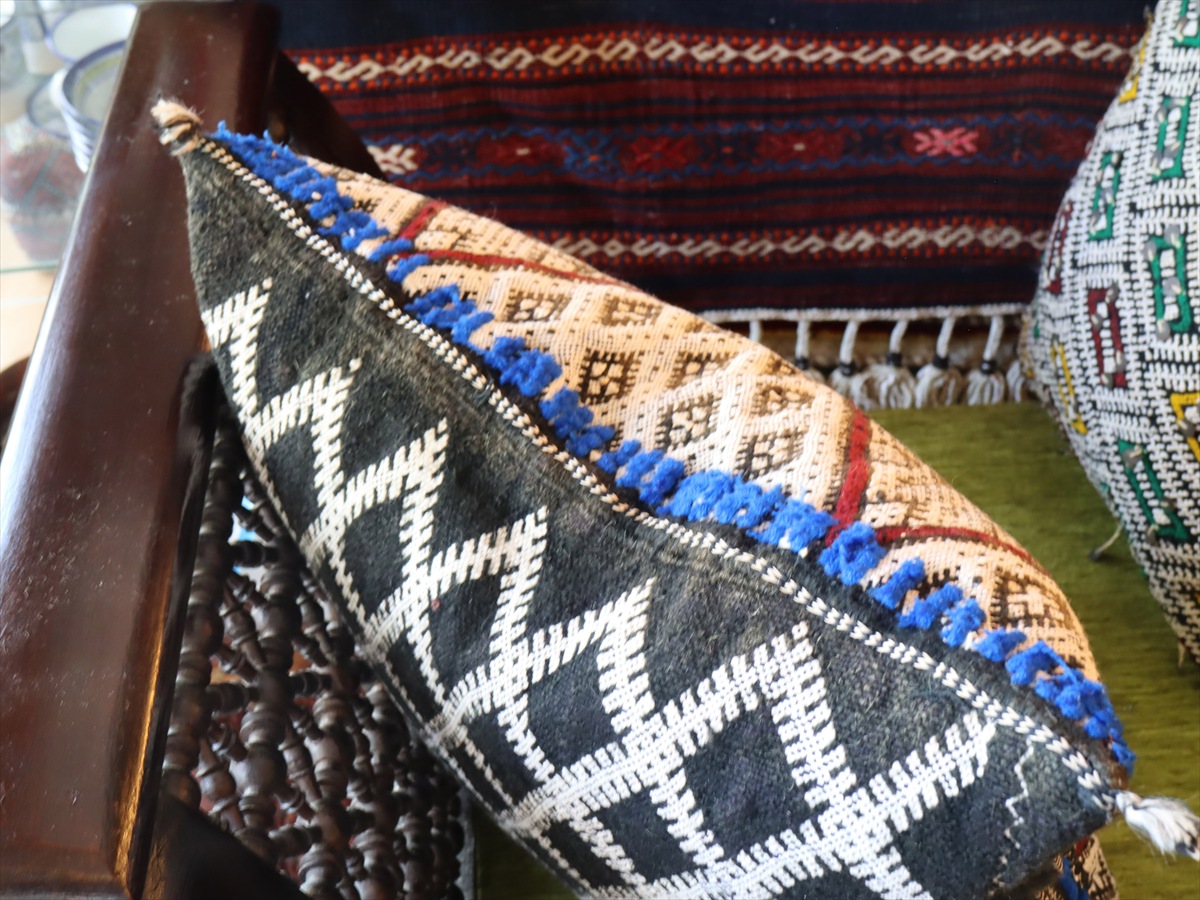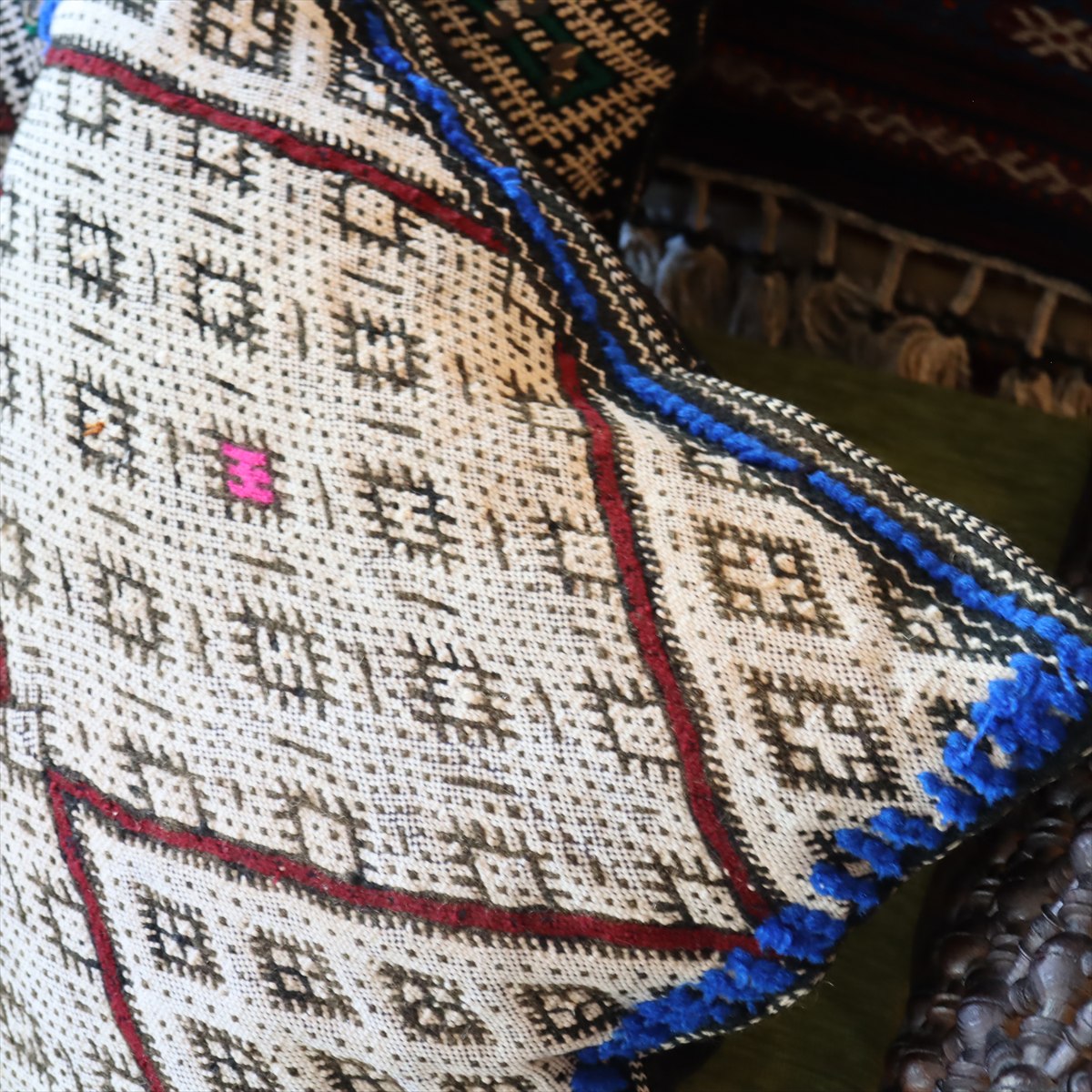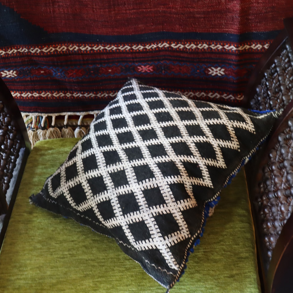 表面のキリムは、ほぼ白に見えていて、全面がびっしりと細かなジジム織りになっていて、立体感のあるテクスチャです。このクッションは45cm角サイズに縫製されたもので、裏面には黒地に白い糸のジジムで格子状のデザイン。両面で違った雰囲気が楽しめます。