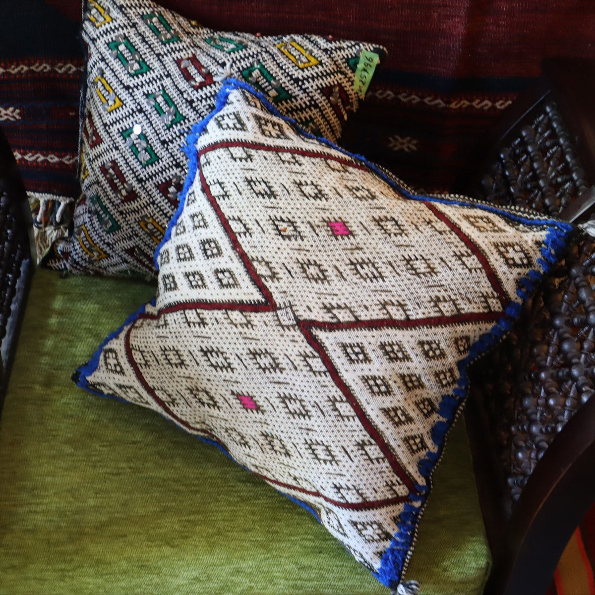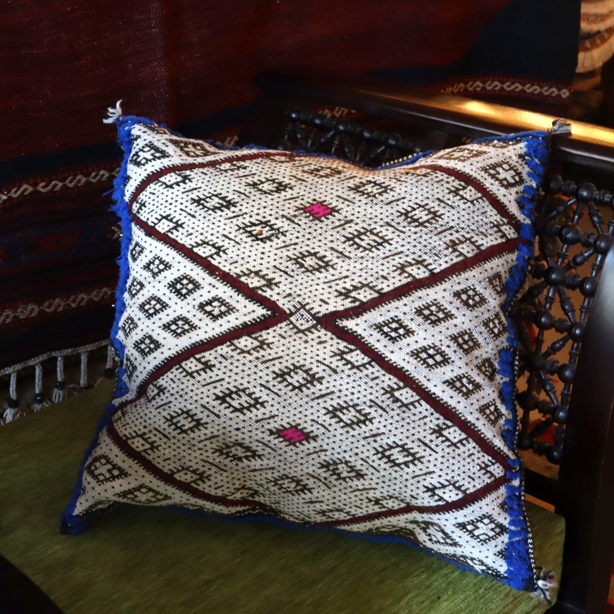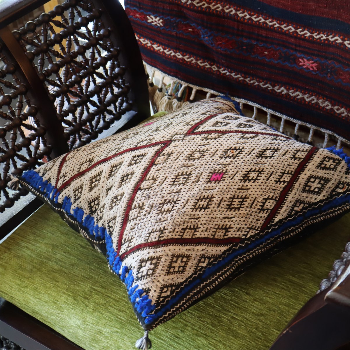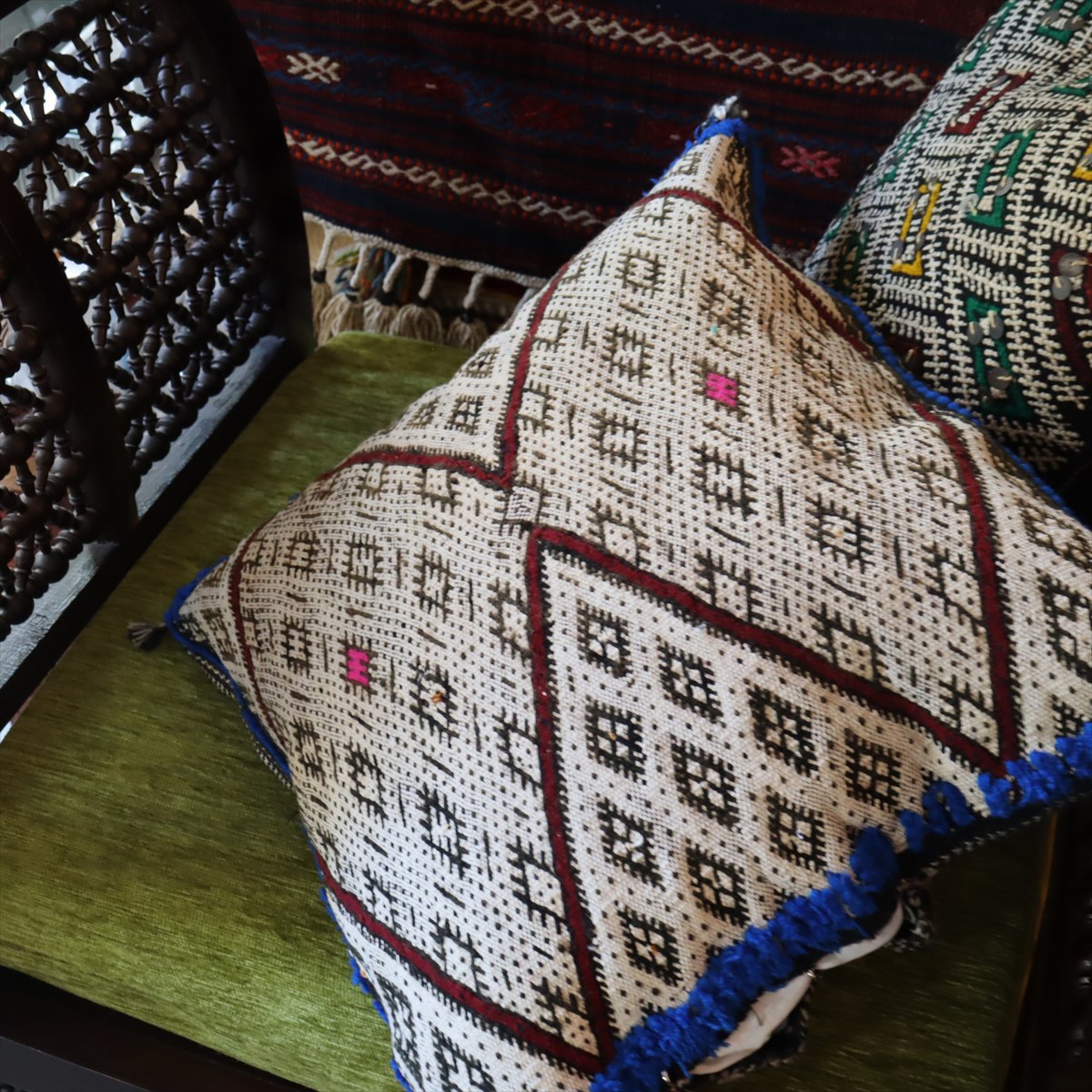 表面のキリムは、ほぼ白に見えていて、全面がびっしりと細かなジジム織りになっていて、立体感のあるテクスチャです。このクッションは45cm角サイズに縫製されたもので、裏面には黒地に白い糸のジジムで格子状のデザイン。両面で違った雰囲気が楽しめます。
