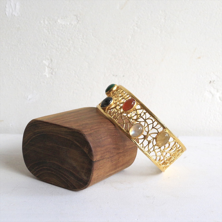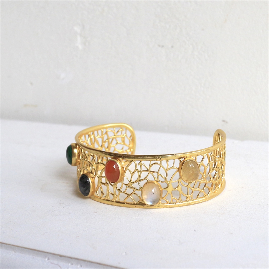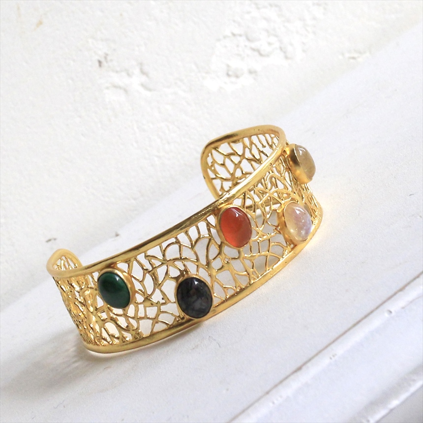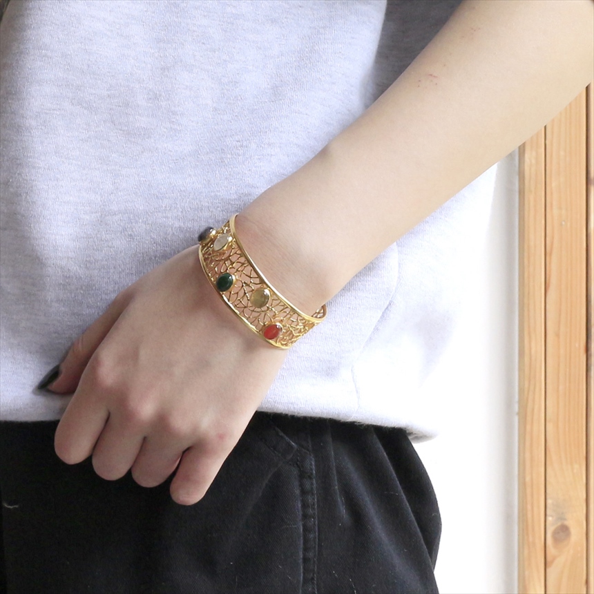 繊細なゴールドモチーフに、異なる天然石が散りばめられたバングル。コロンとしたカボションカットのやわらかな色味の石たちがかわいらしいデザイン。