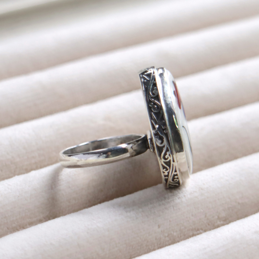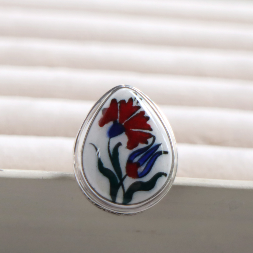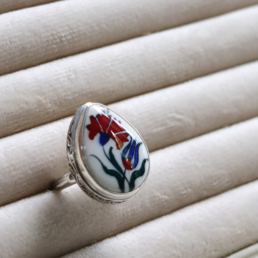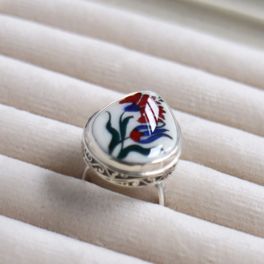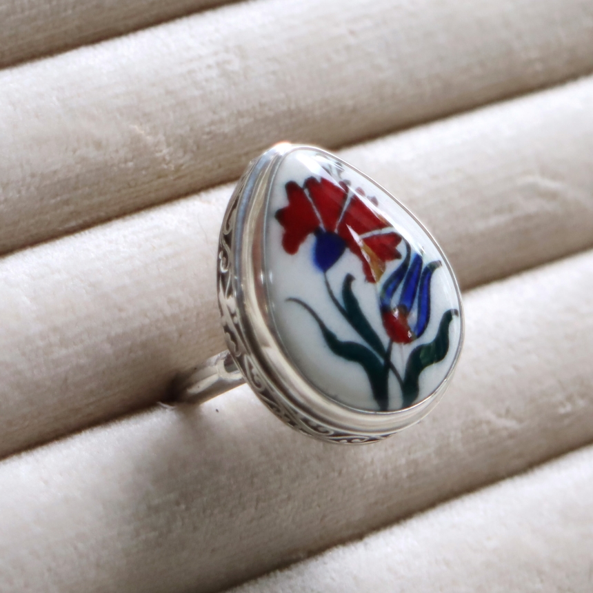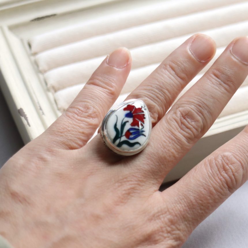 トルコ キュタフヤは陶芸の街!トルコの職人が、ひとつひとつ手描きで絵付けした小さな陶器をモチーフにしたシルバーリングです。
