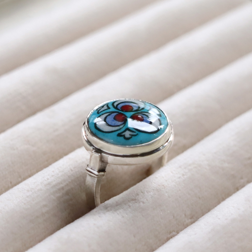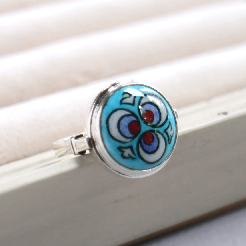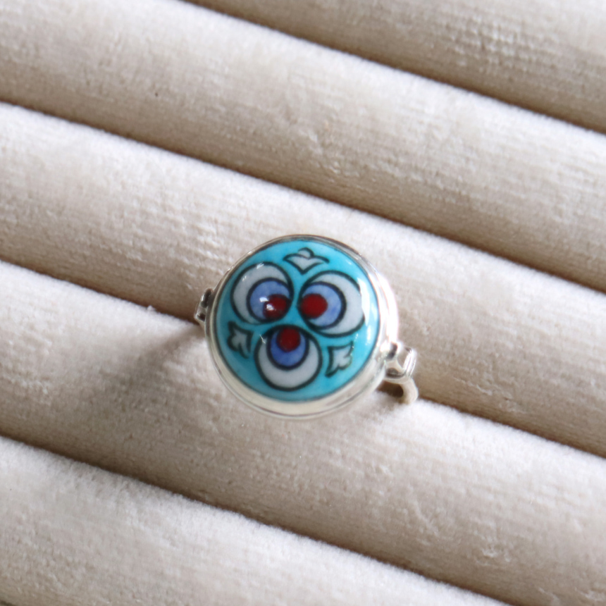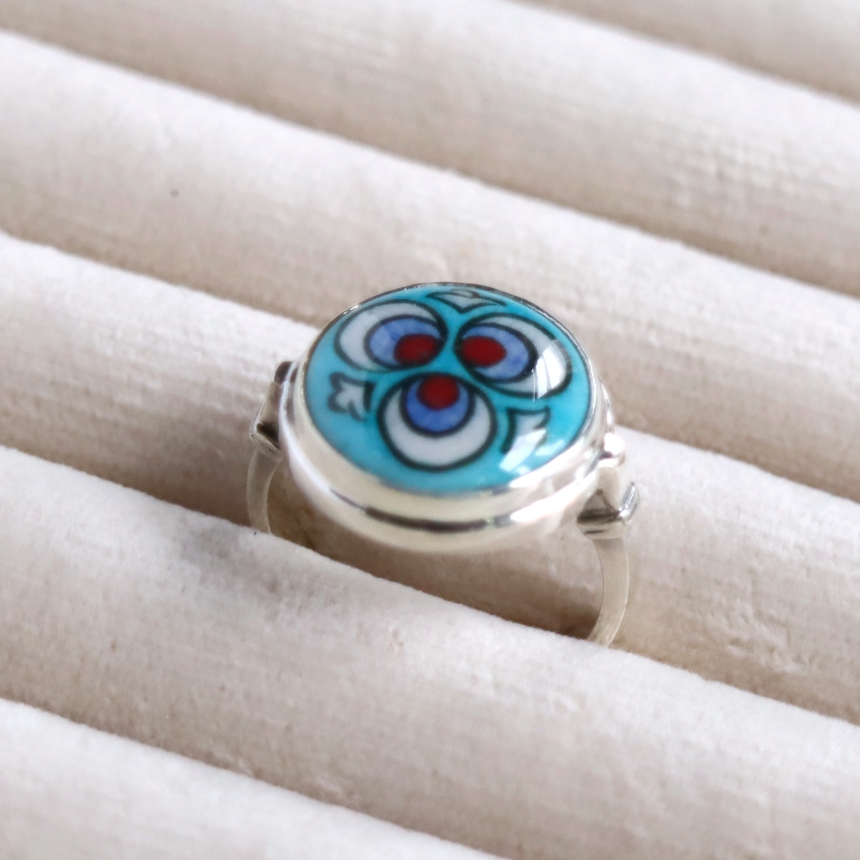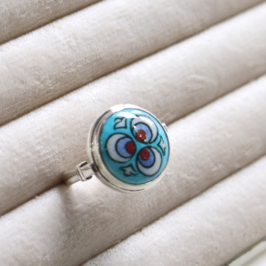 トルコ キュタフヤは陶芸の街!トルコの職人が、ひとつひとつ手描きで絵付けした小さな陶器をモチーフにしたシルバーリングです。