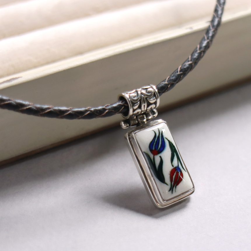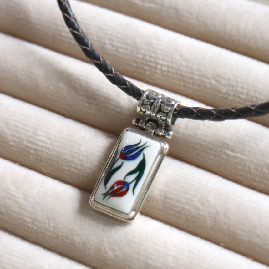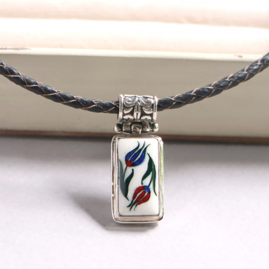キュタフヤ陶器 シルバーペンダント 赤と青のチューリップ レクタングル