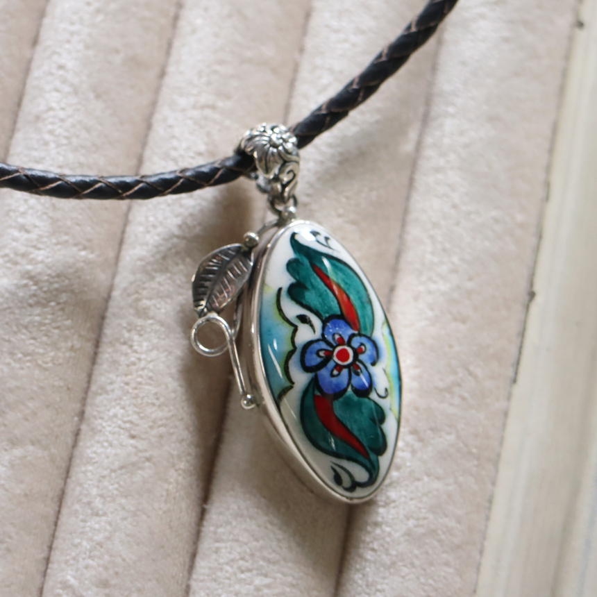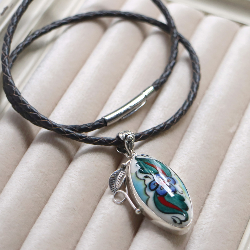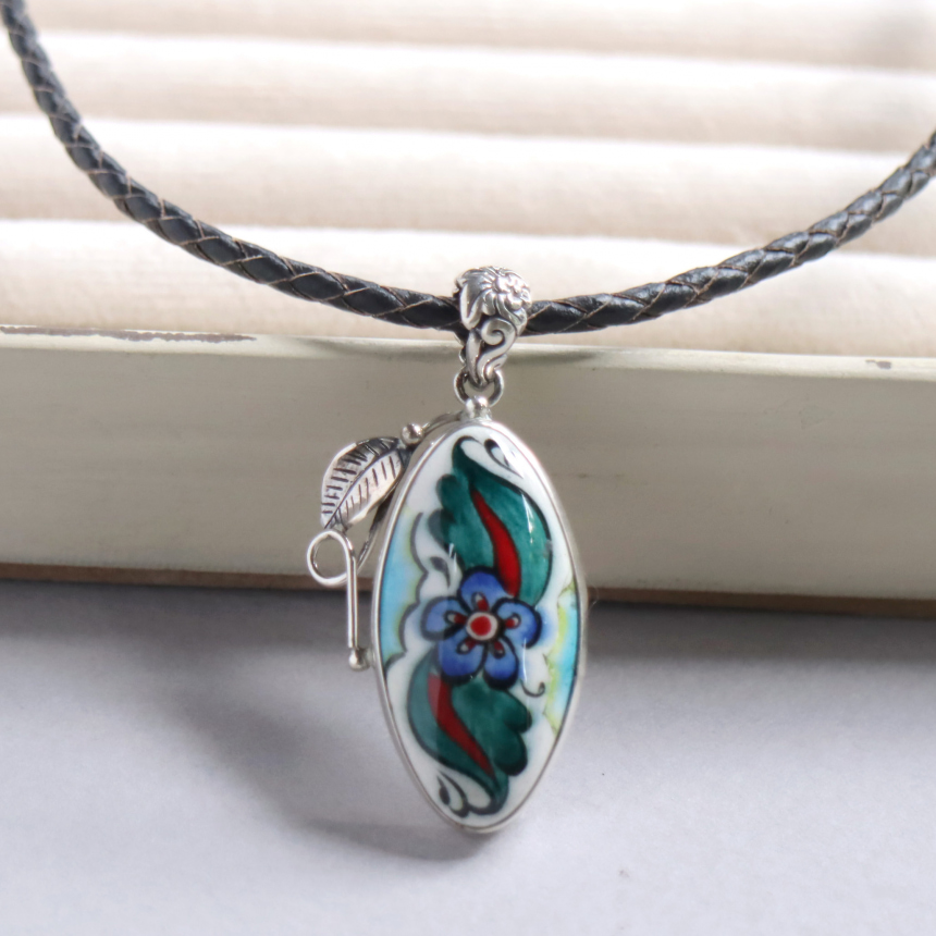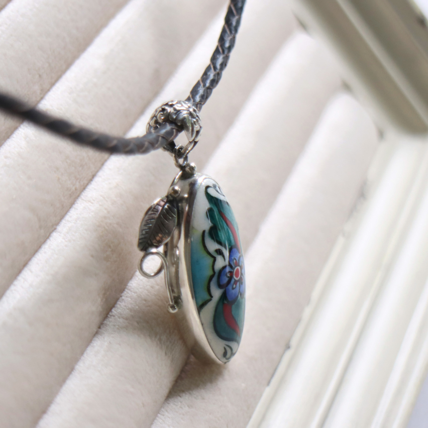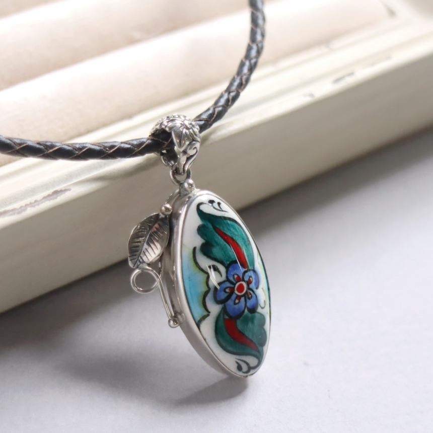 トルコキュターヤは陶芸の街!トルコの職人が、一つひとつ手描きで絵付けしたキュターヤ陶器とシルバー細工のペンダントです。シルバー細工も凝ったデザインで、オーバルモチーフの左側に葉と蔓のレリーフが施されています。