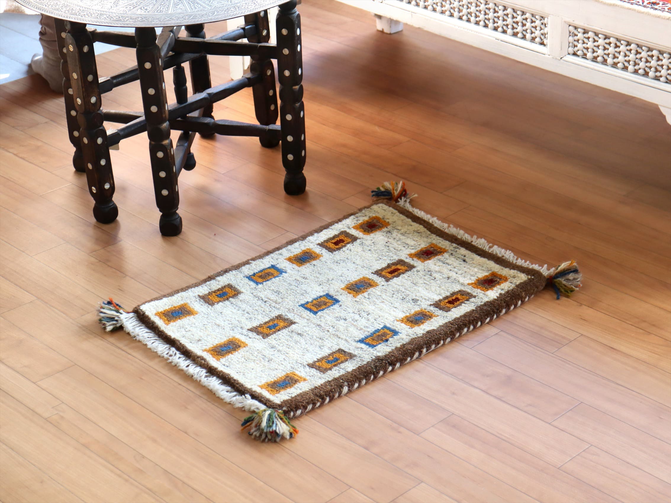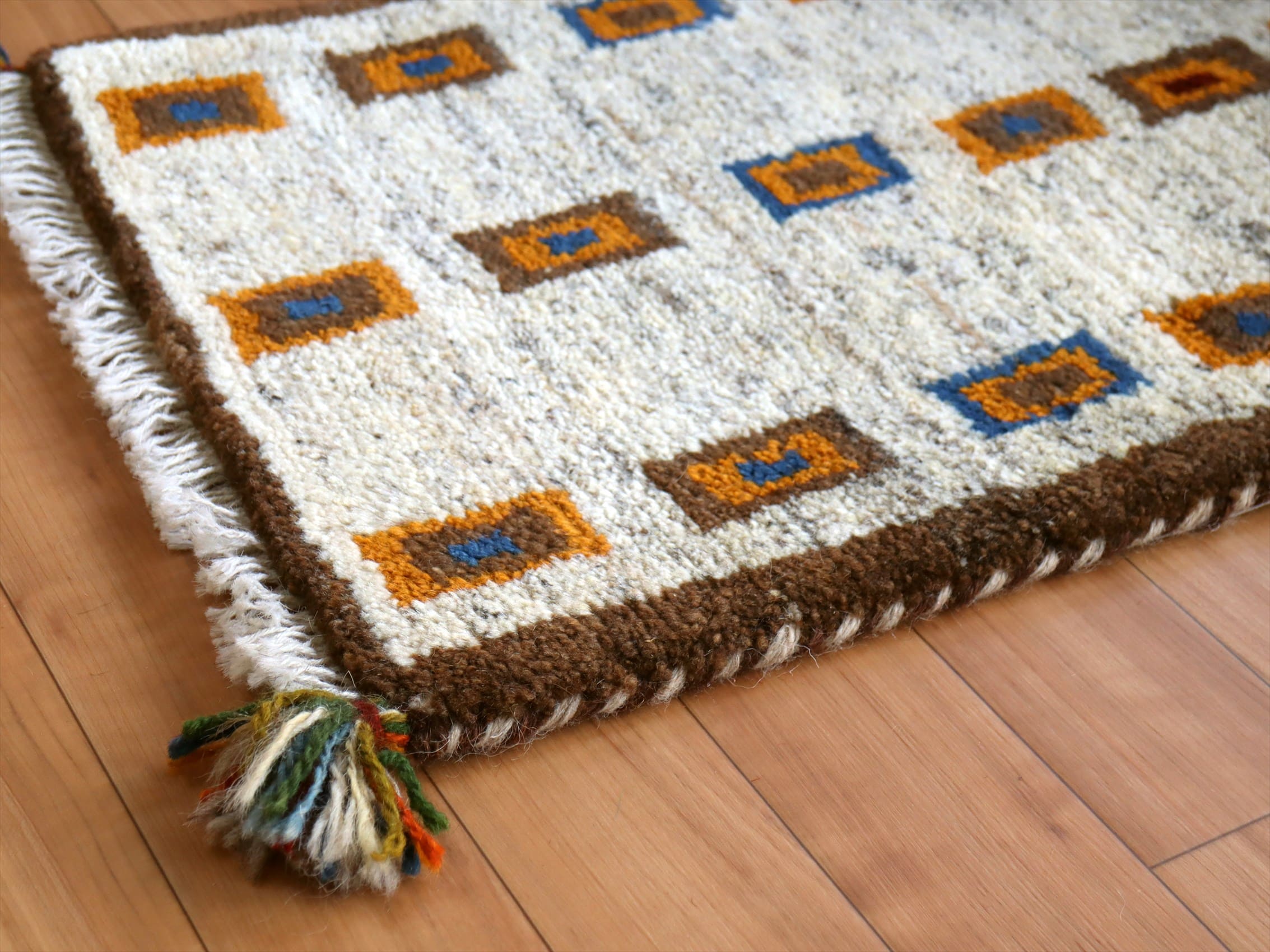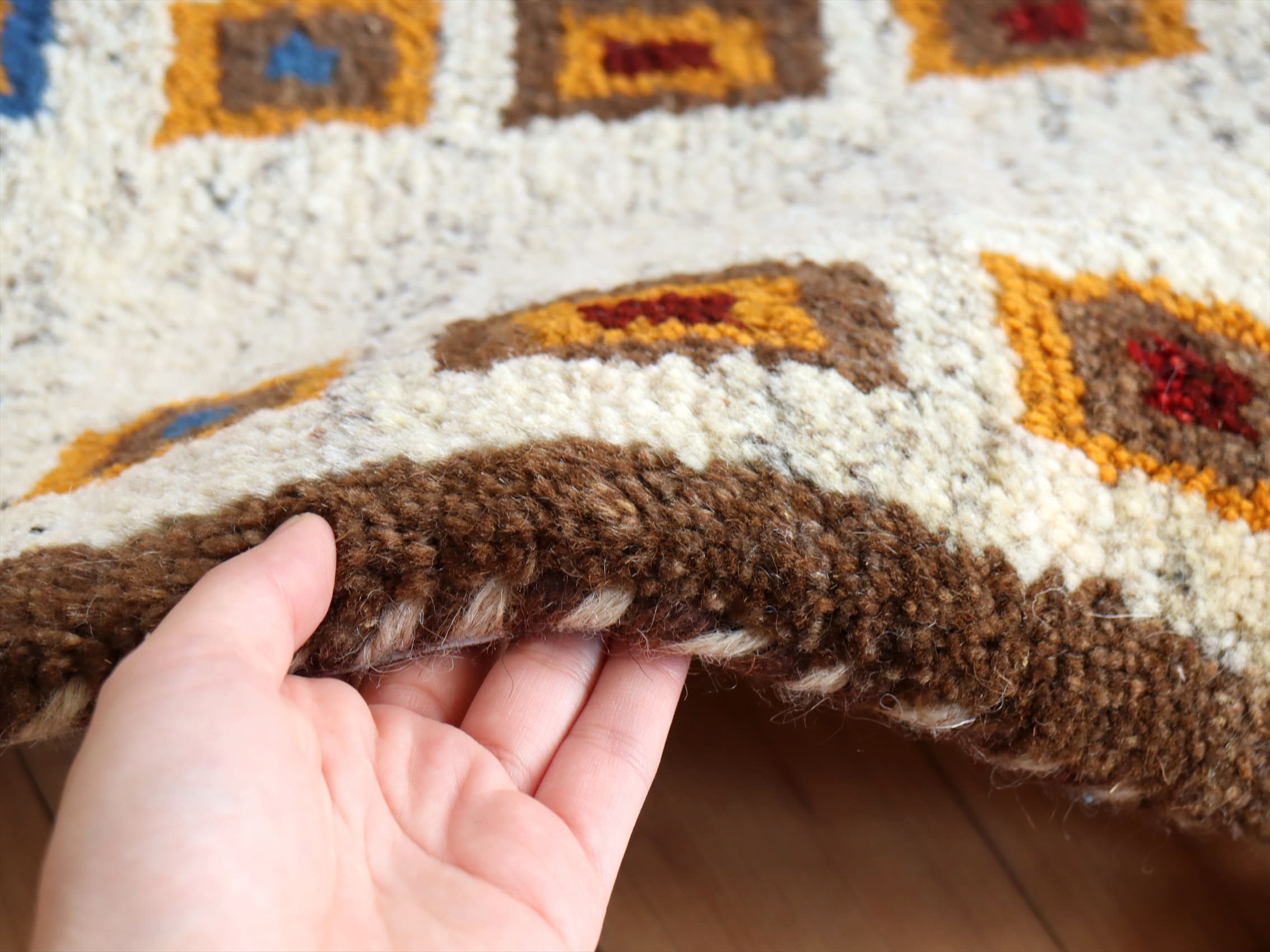 ナチュラルな色合いの素朴なデザインです。どのようなシーンにも馴染みます。他のギャッベと比較すると毛足は若干短めですが、ふかふかとした手触りを十分楽しめます。