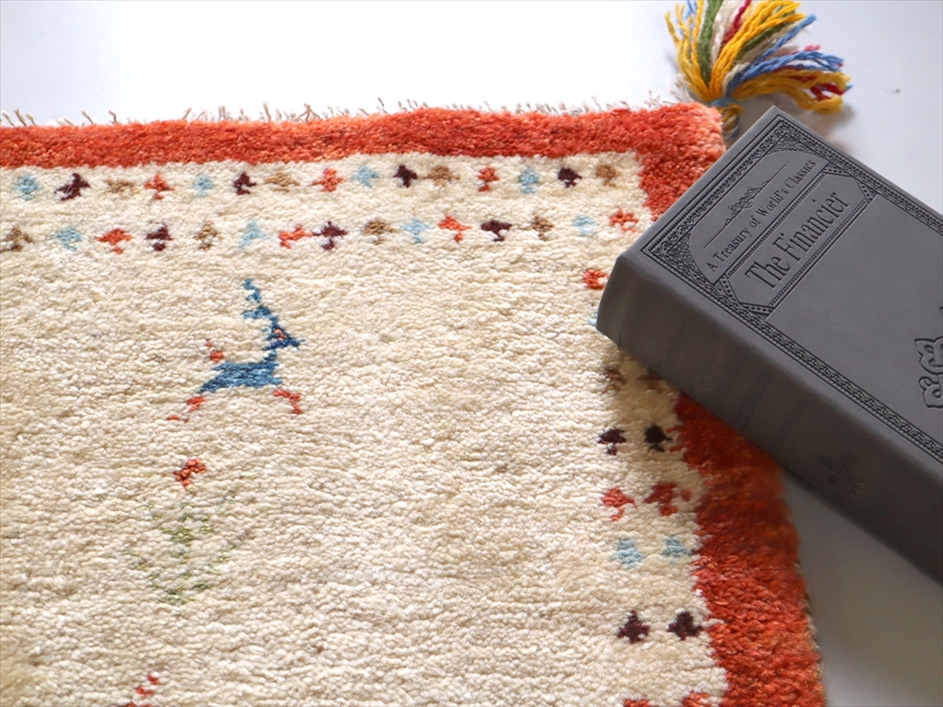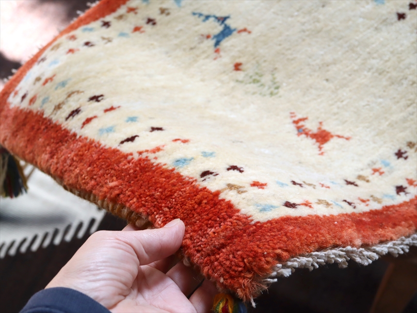 細かなモチーフがくっきり見えるよう、パイルはやや短めの刈り込みになっていて、全体の厚みは1.5cm弱のギャッベ。