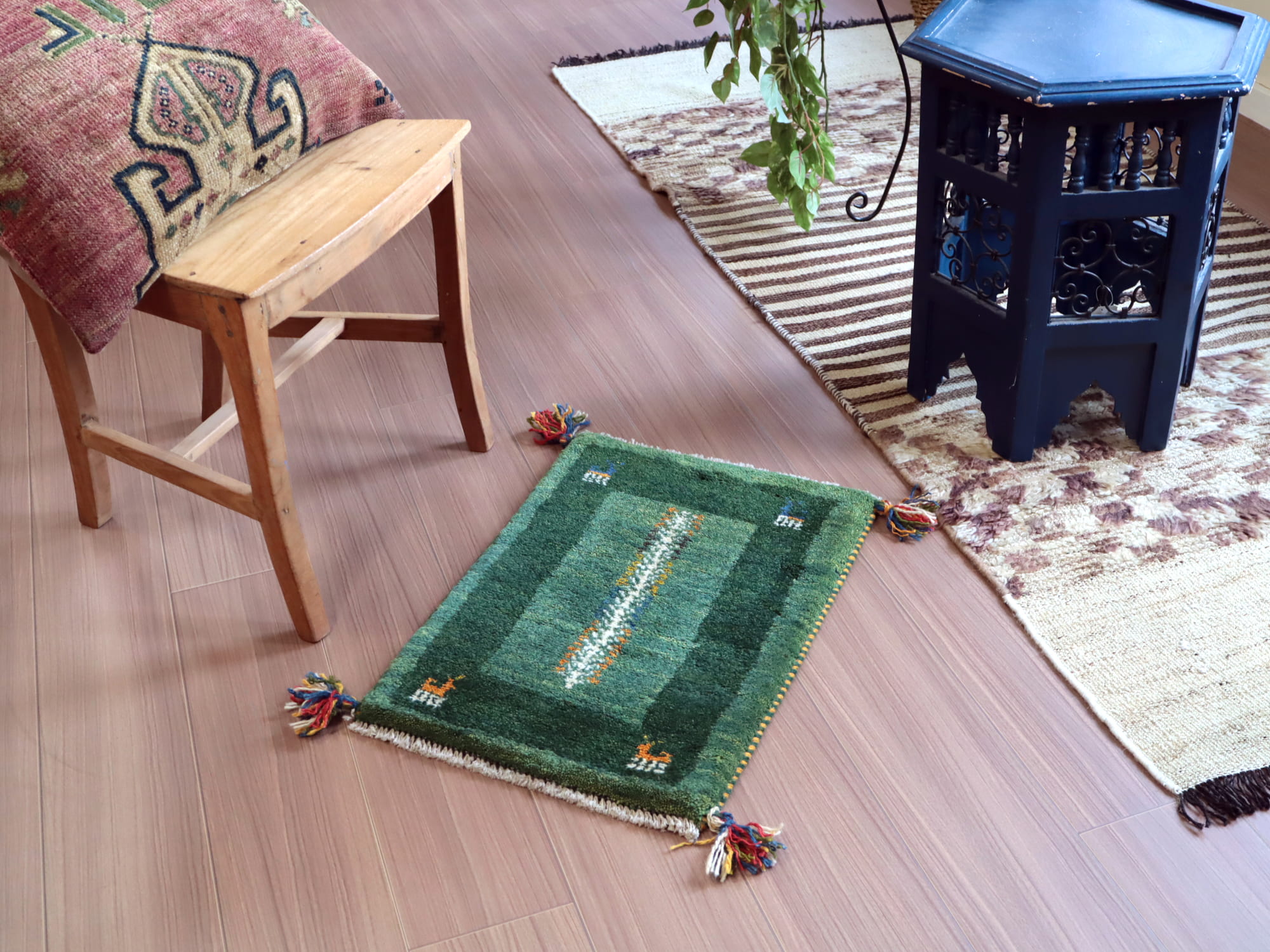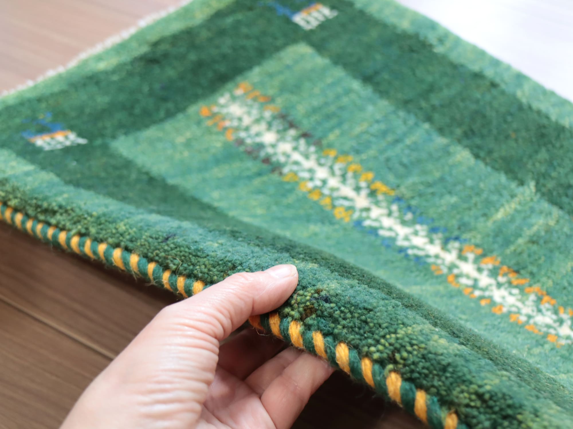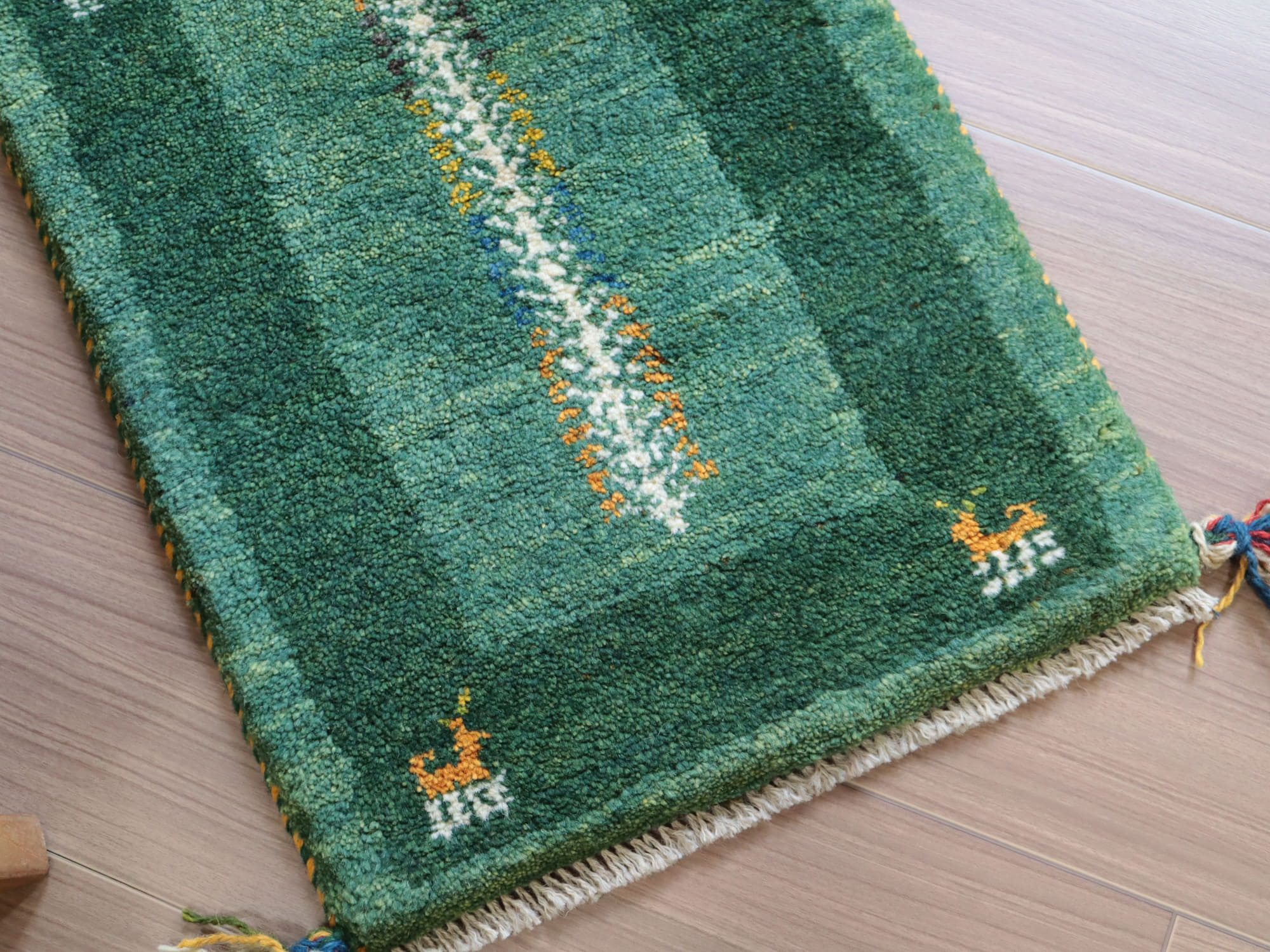 トーンの違う二色のグリーンを使ったボーダーデザインのギャッベ。上のほうの動物モチーフは、グリーンに溶け込んでいますね。