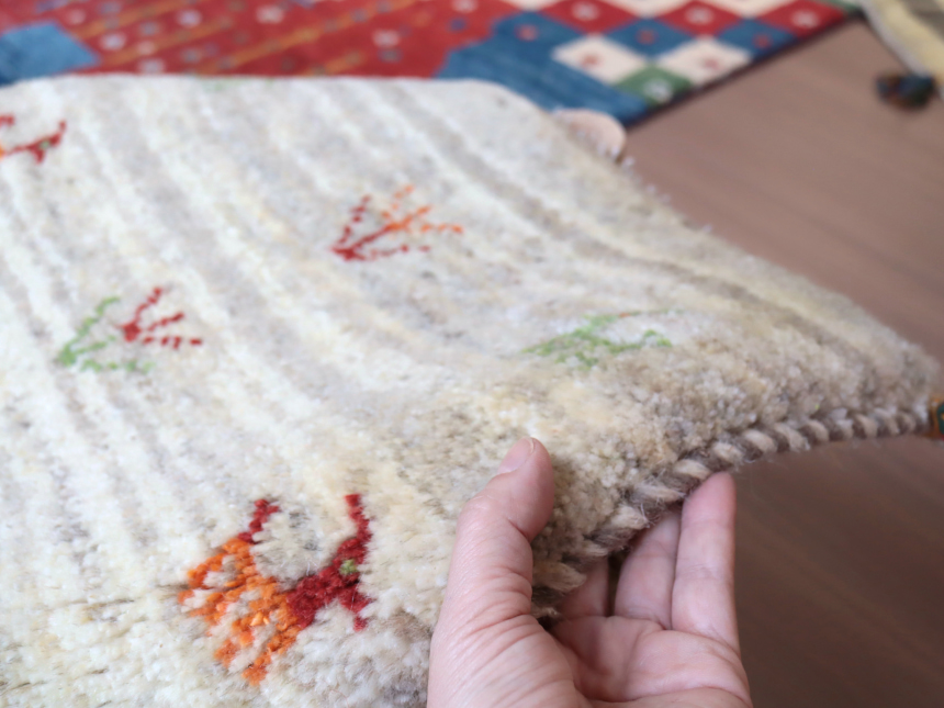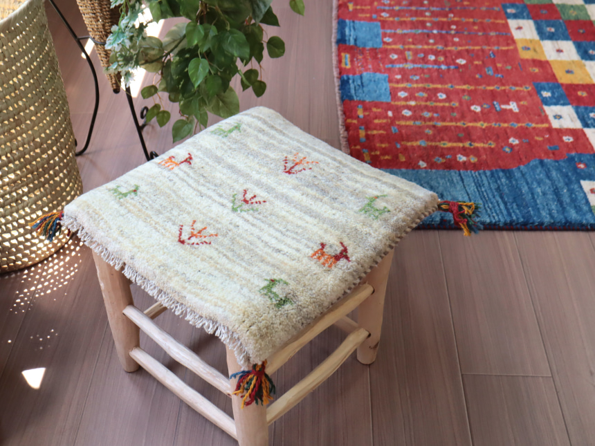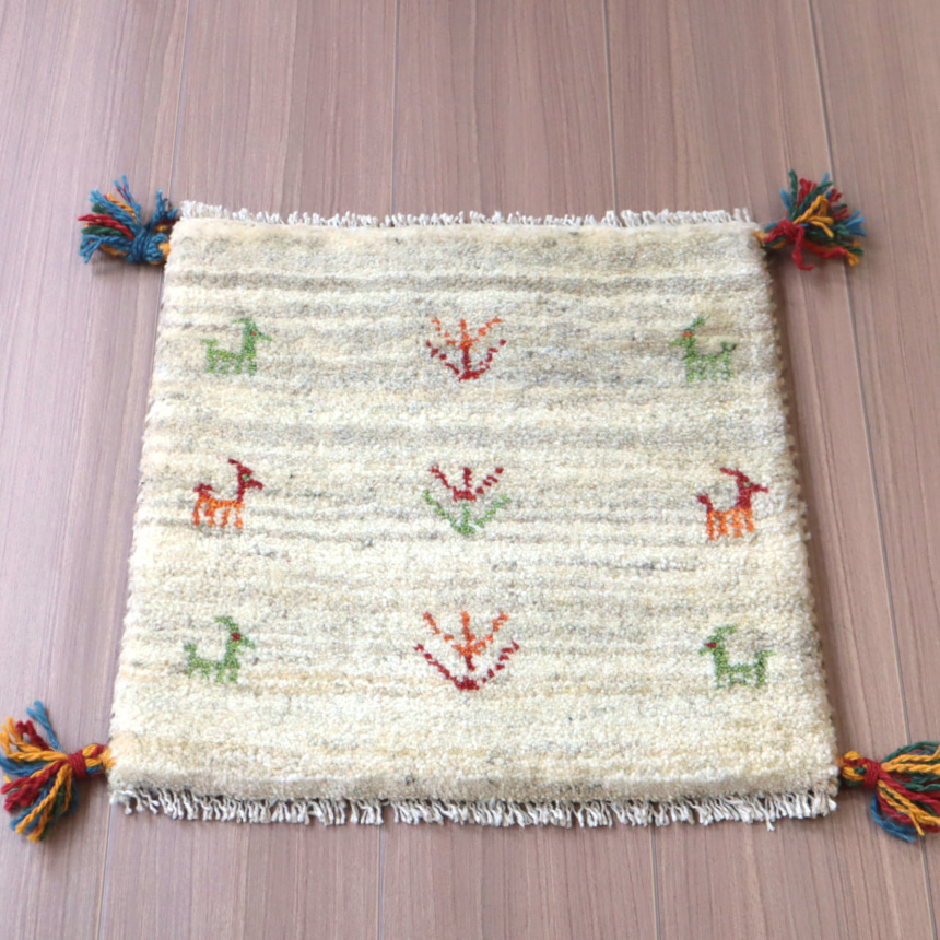 伝統的な技法で手つむぎした毛糸を使って、手織りされたカシュカイ族のギャッベ。40cm角のミニサイズは、座布団代わりにフローリングに並べたり、ダイニングチェアの座面に敷いたり、アレンジいろいろに楽しめます。手織りならではの一枚一枚違ったテイストをお楽しみください。