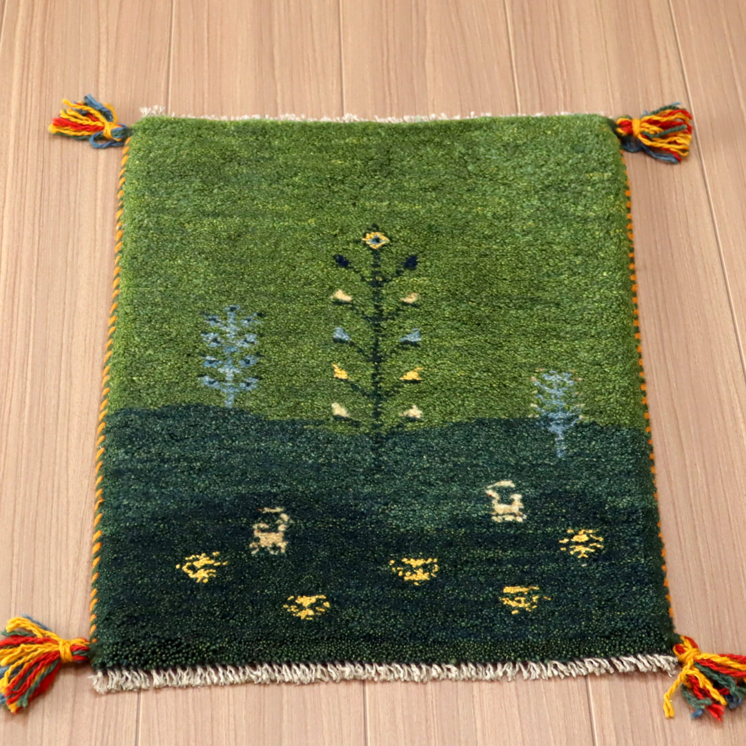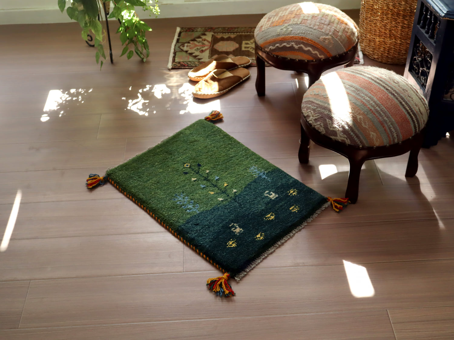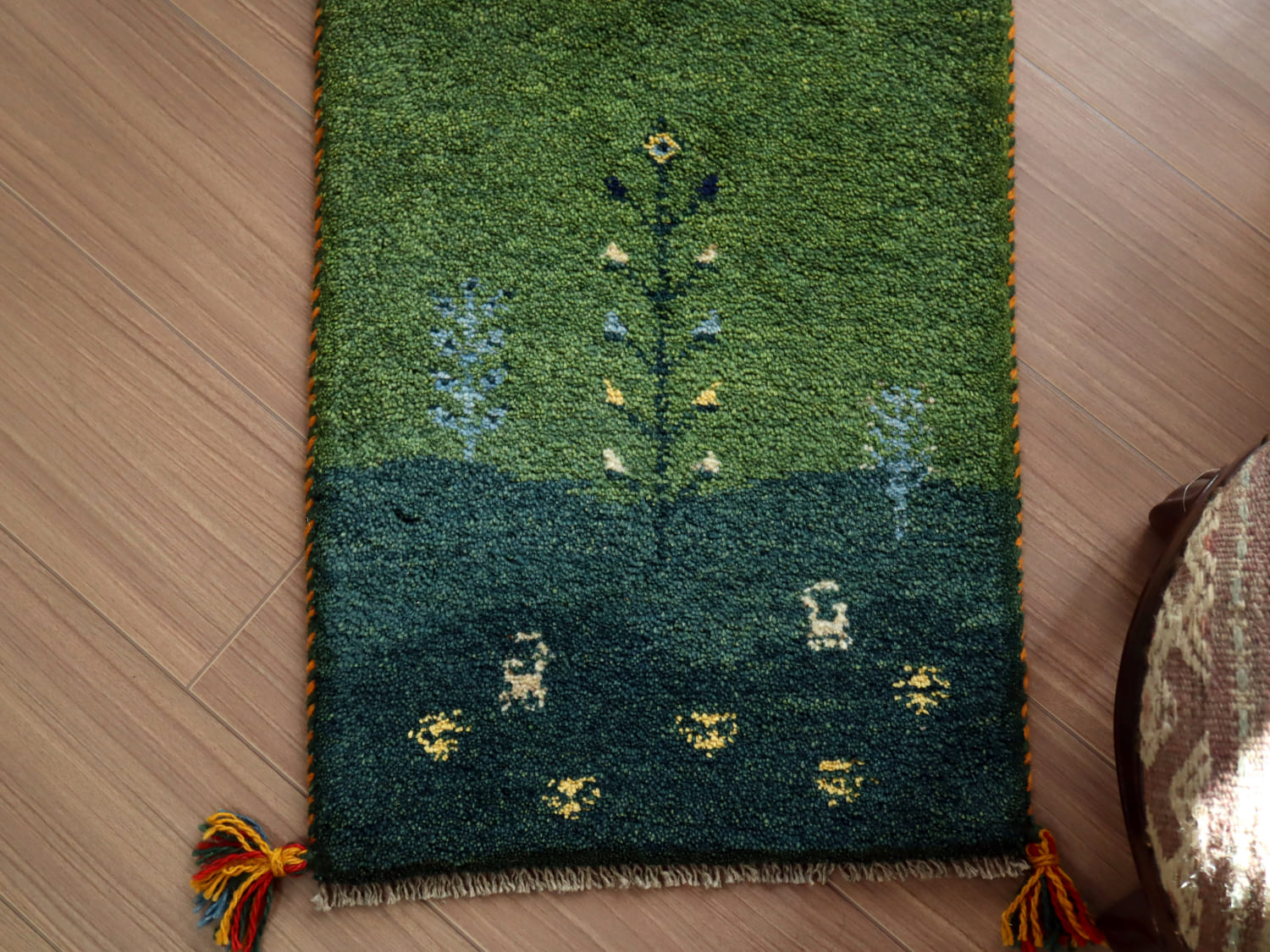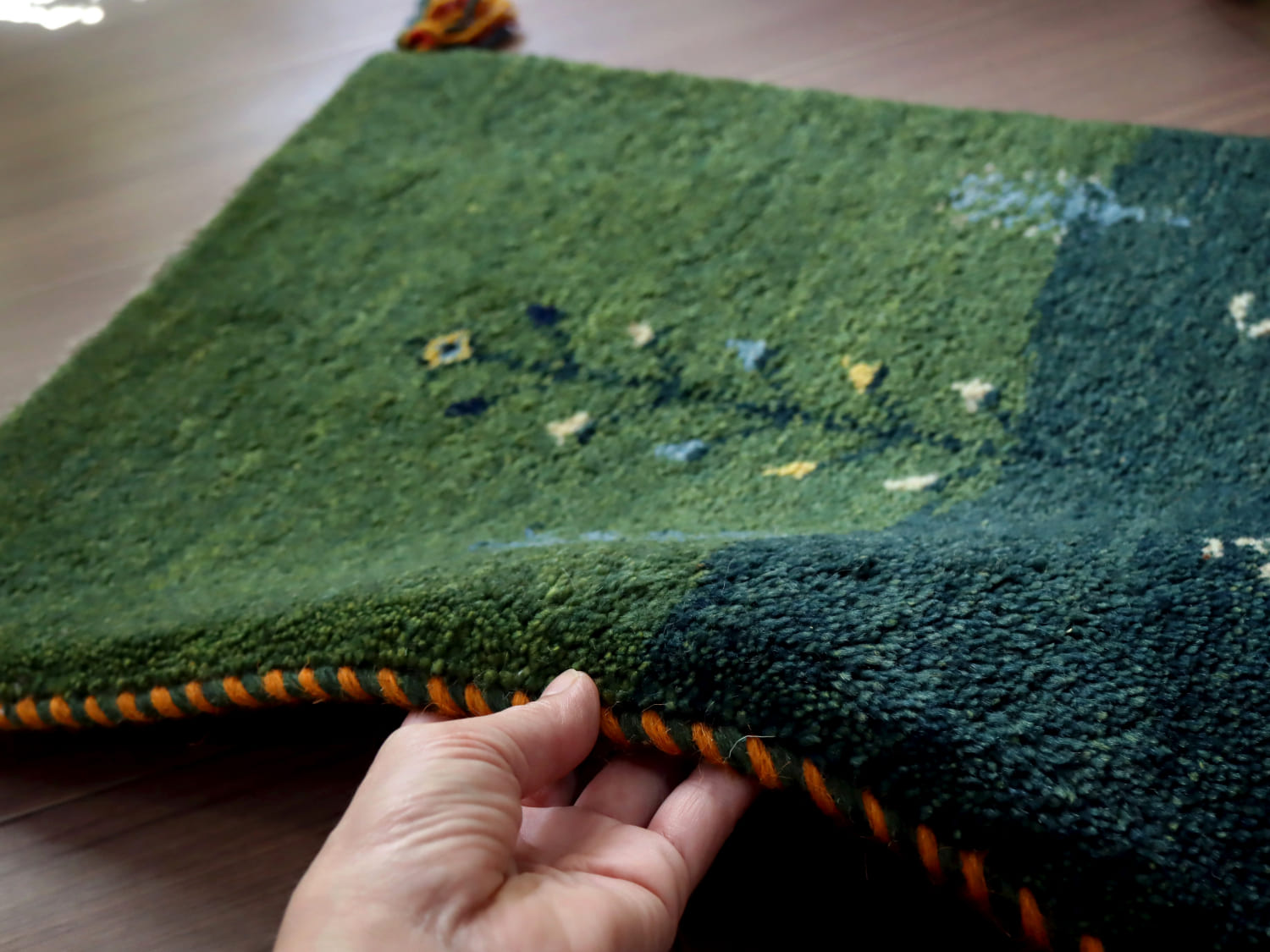 毛足が長くボリュームのある織り。パイル(毛足)を含めた厚みは、2.2-2.3cm程度で、ぎゅっと織り目が引き締まっています。四隅にポンポンのついた定番のギャッベです。