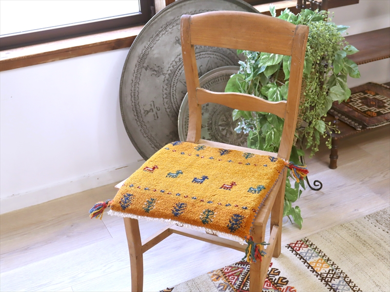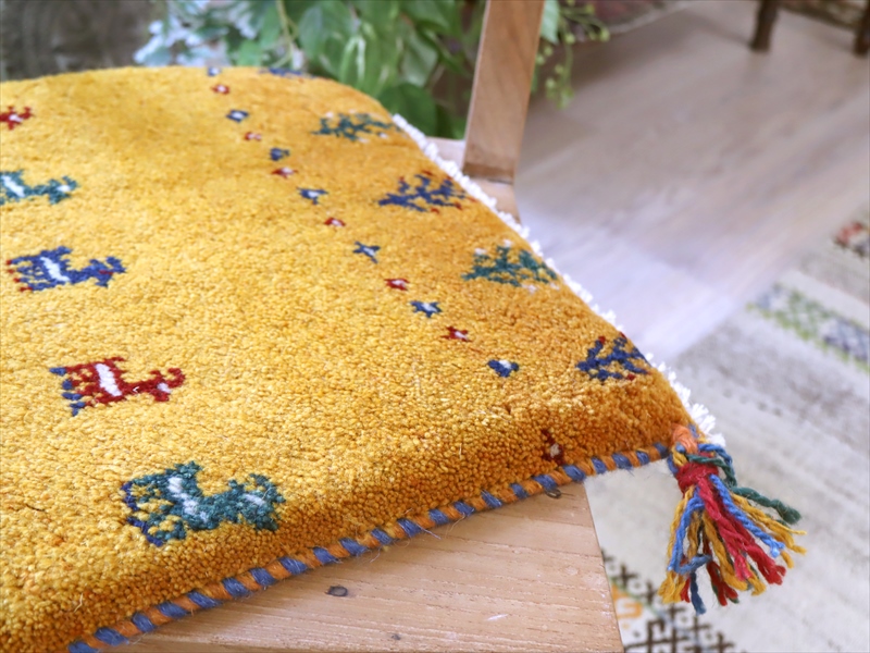 ギャッベ イラン産手織り 座布団サイズ 38x40cm イエローオレンジ