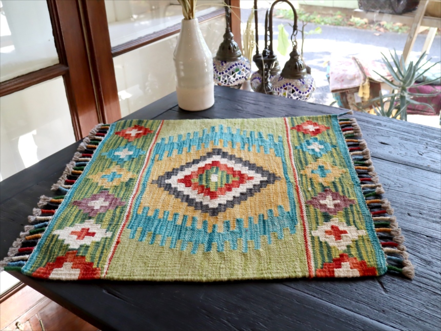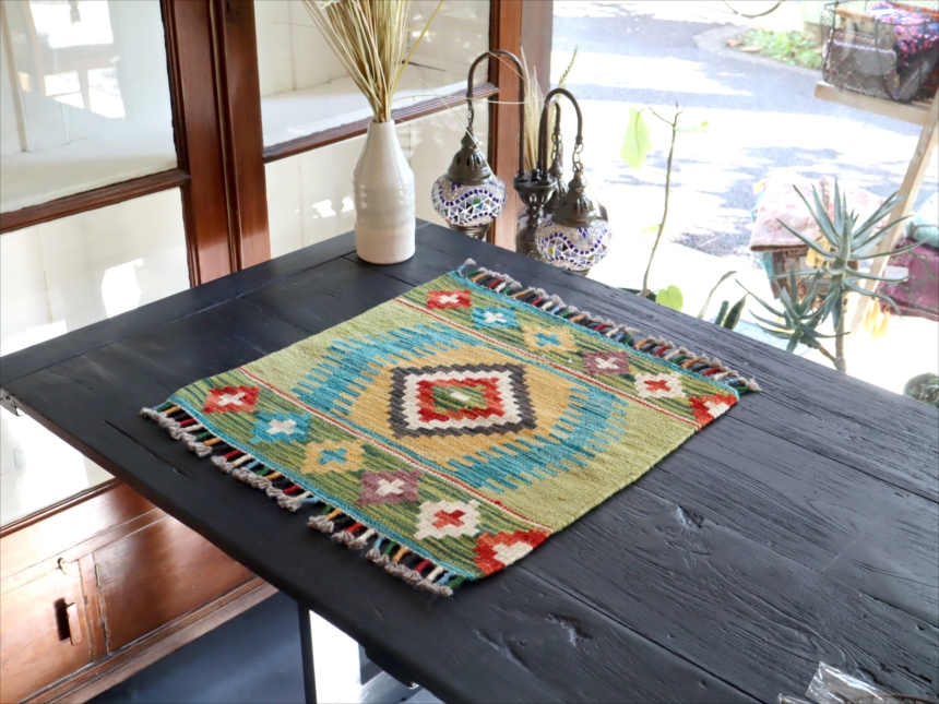 およそ50cm角のミニサイズの手織りキリムです。トルコ、イランの伝統的な幾何学モチーフを再現して、現在はアフガニスタンで織られています。ユニークなカラーコンビネーションには、織り手の自由なアイデアで織られるキリムらしさがでています。