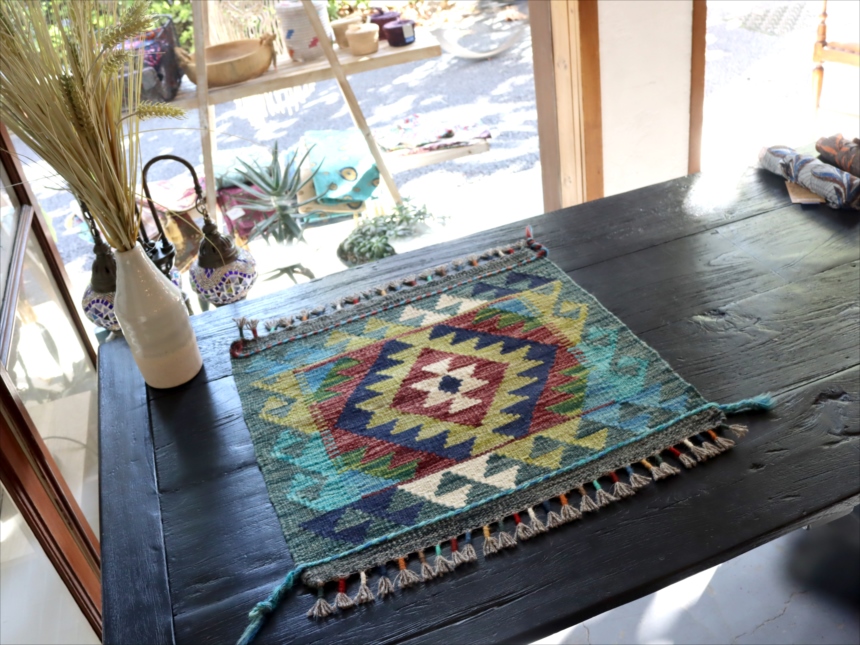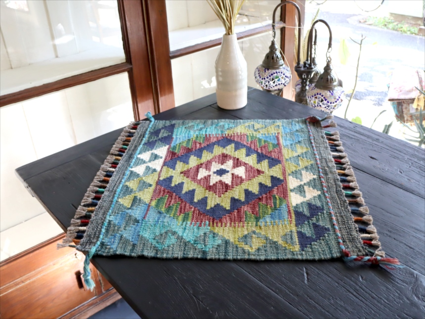 およそ50cm角のミニサイズの手織りキリムです。トルコ、イランの伝統的な幾何学モチーフを再現して、現在はアフガニスタンで織られています。ユニークなカラーコンビネーションには、織り手の自由なアイデアで織られるキリムらしさがでています。