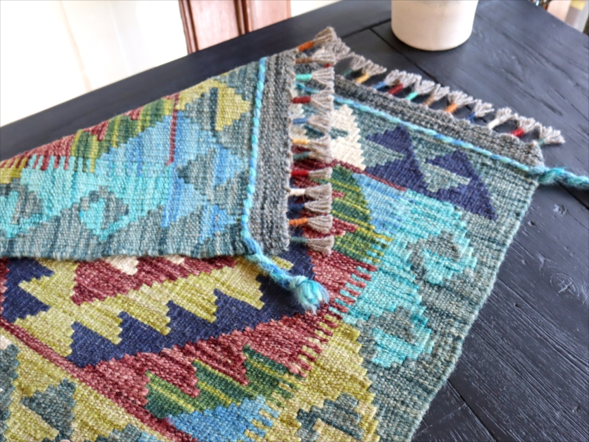 0.6-0.7mmほどの厚みのある平織りのキリムです。飾り糸がフリンジのようにのばしたままになっています。