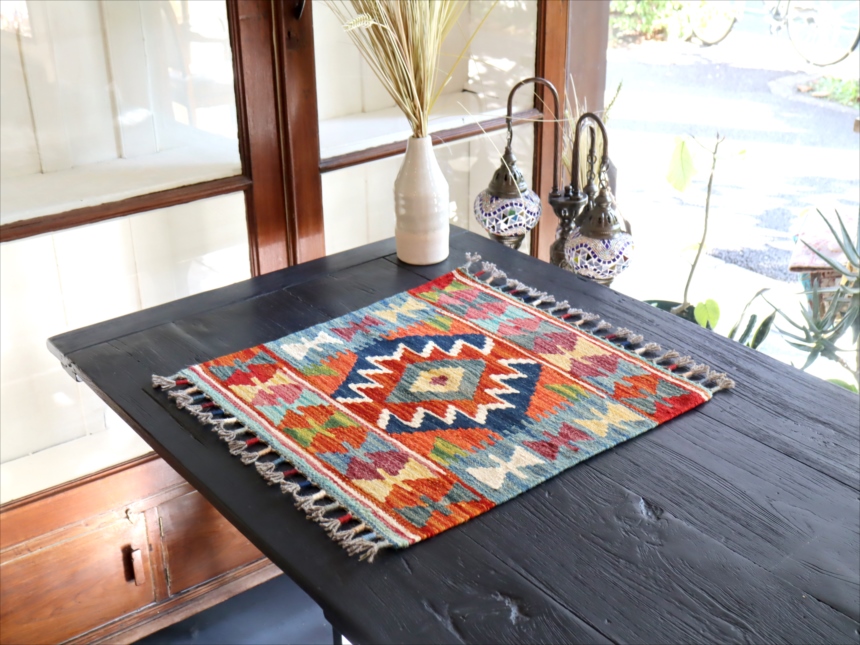 およそ50cm角のミニサイズの手織りキリムです。トルコ、イランの伝統的な幾何学モチーフを再現して、現在はアフガニスタンで織られています。ユニークなカラーコンビネーションには、織り手の自由なアイデアで織られるキリムらしさがでています。