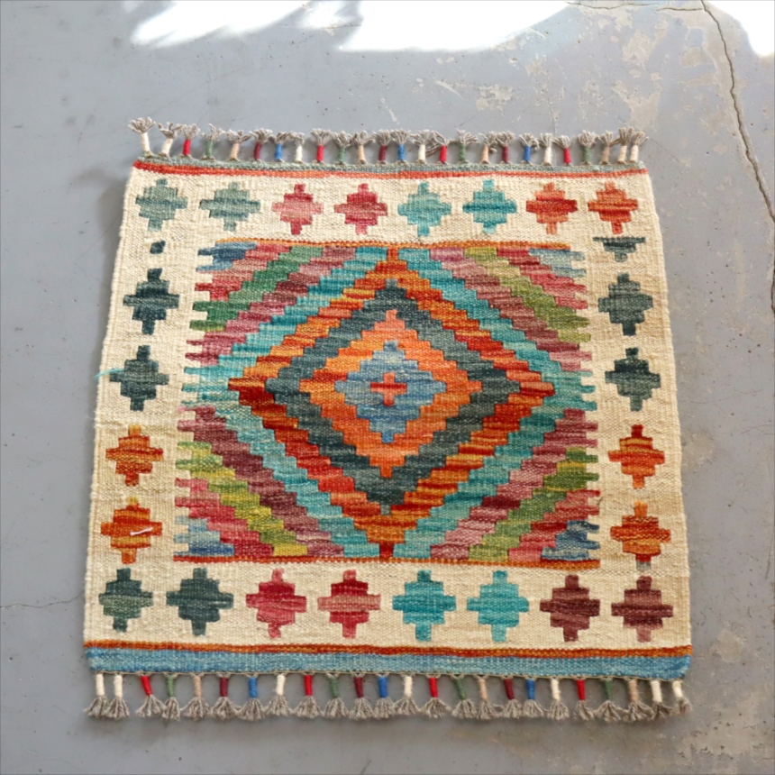 ミニキリム 48×51cm カラフルな幾何学モチーフ手織り ウール アフガンキリム