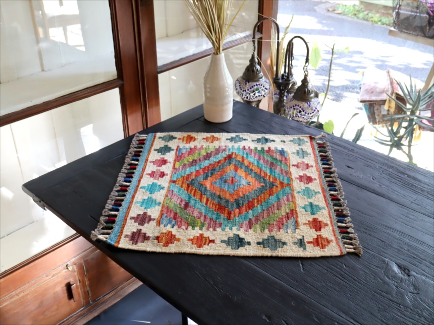 およそ50cm角のミニサイズの手織りキリムです。トルコ、イランの伝統的な幾何学モチーフを再現して、現在はアフガニスタンで織られています。ユニークなカラーコンビネーションには、織り手の自由なアイデアで織られるキリムらしさがでています。