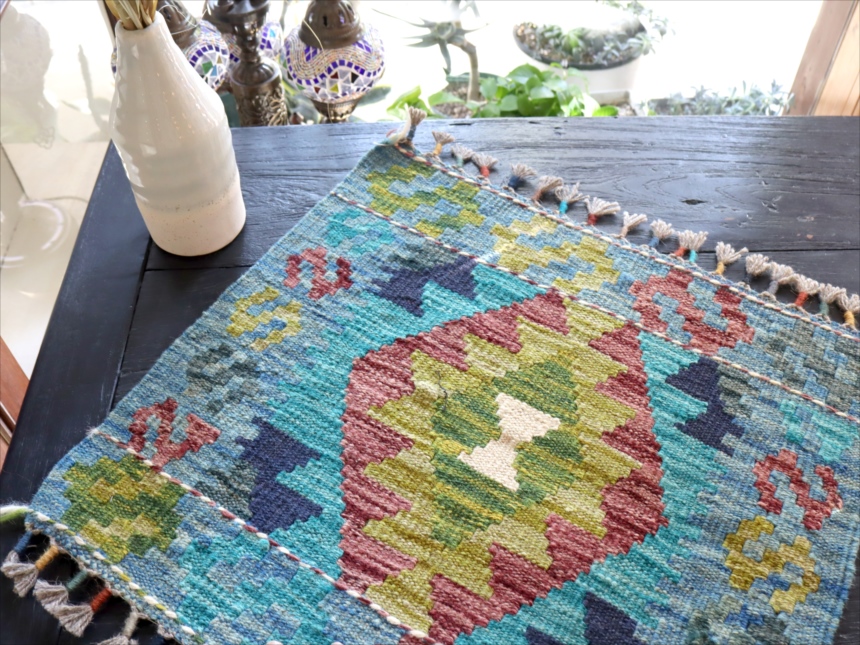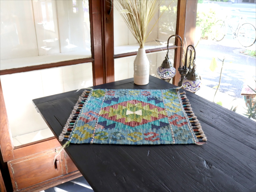 およそ50cm角のミニサイズの手織りキリムです。トルコ、イランの伝統的な幾何学モチーフを再現して、現在はアフガニスタンで織られています。ユニークなカラーコンビネーションには、織り手の自由なアイデアで織られるキリムらしさがでています。