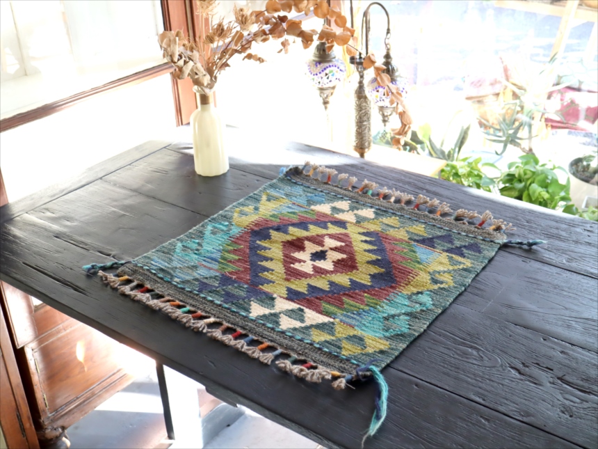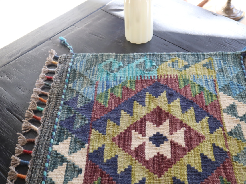 およそ50cm角のミニサイズの手織りキリムです。トルコ、イランの伝統的な幾何学モチーフを再現して、現在はアフガニスタンで織られています。ユニークなカラーコンビネーションには、織り手の自由なアイデアで織られるキリムらしさがでています。