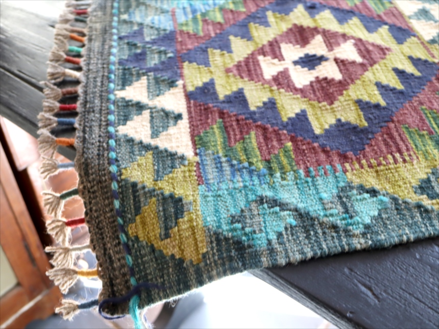 0.6-0.7mmほどの厚みのある平織りのキリムです。飾り糸がフリンジのようにのばしたままになっています。
