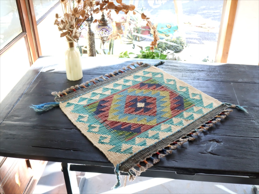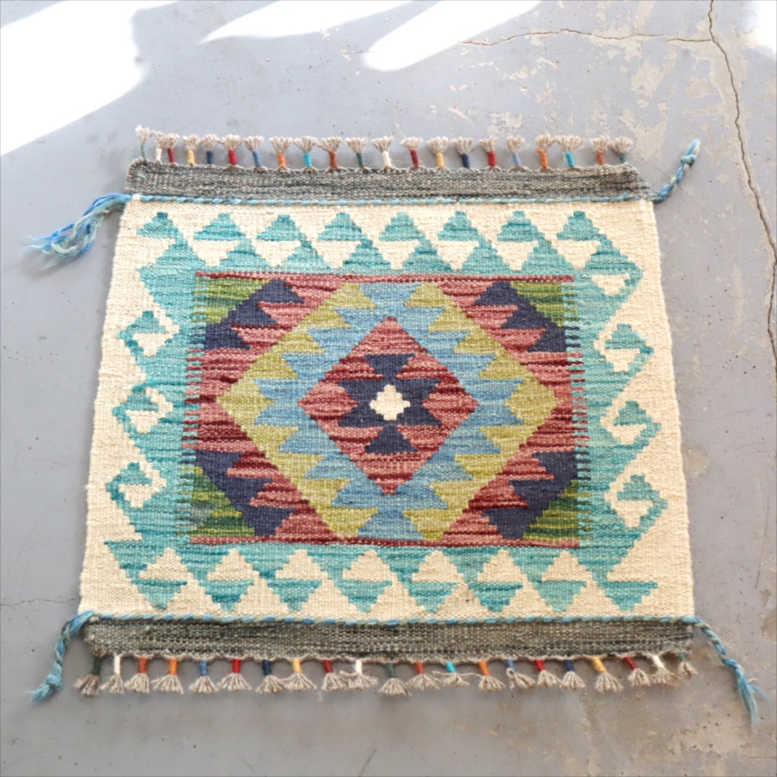 およそ50cm角のミニサイズの手織りキリムです。トルコ、イランの伝統的な幾何学モチーフを再現して、現在はアフガニスタンで織られています。ユニークなカラーコンビネーションには、織り手の自由なアイデアで織られるキリムらしさがでています。