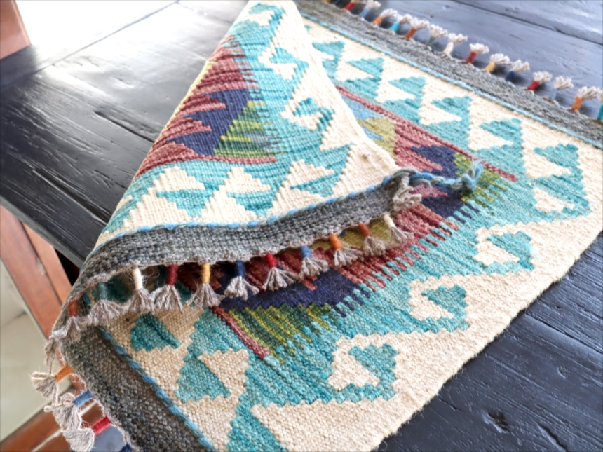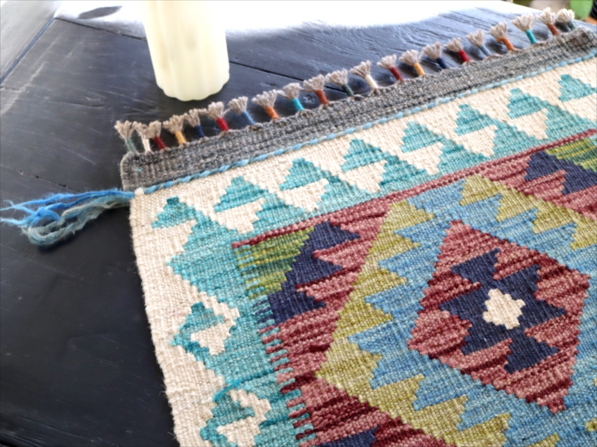 0.6-0.7mmほどの厚みのある平織りのキリムです。飾り糸がフリンジのようにのばしたままになっています。