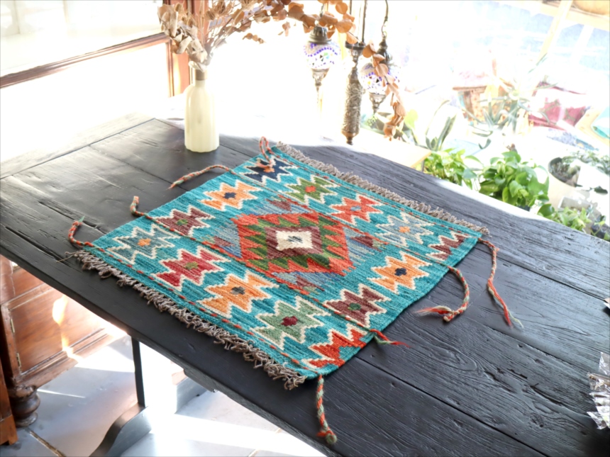 およそ50cm角のミニサイズの手織りキリムです。トルコ、イランの伝統的な幾何学モチーフを再現して、現在はアフガニスタンで織られています。ユニークなカラーコンビネーションには、織り手の自由なアイデアで織られるキリムらしさがでています。
