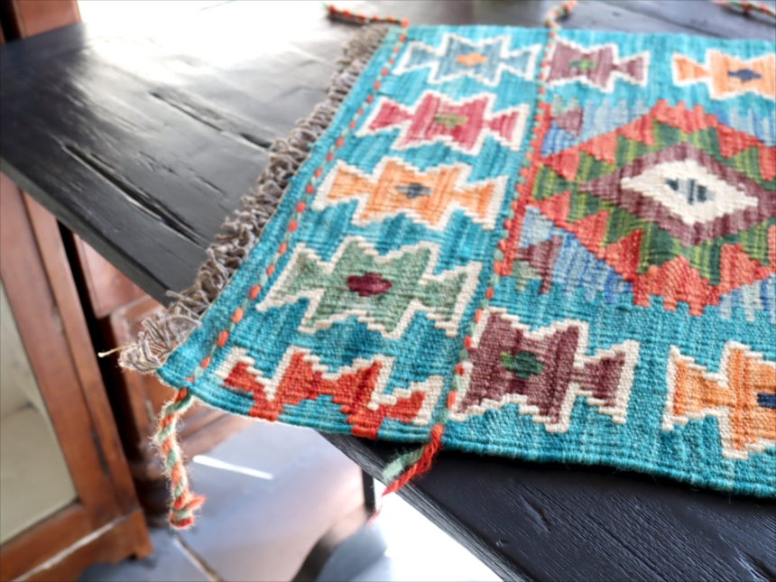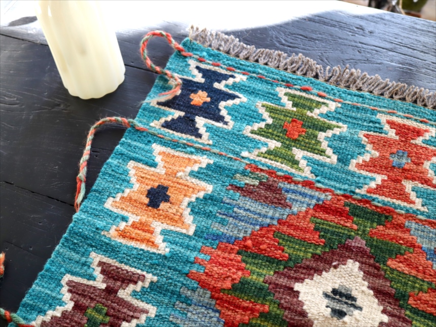 0.6-0.7mmほどの厚みのある平織りのキリムです。飾り糸がフリンジのようにのばしたままになっています。
