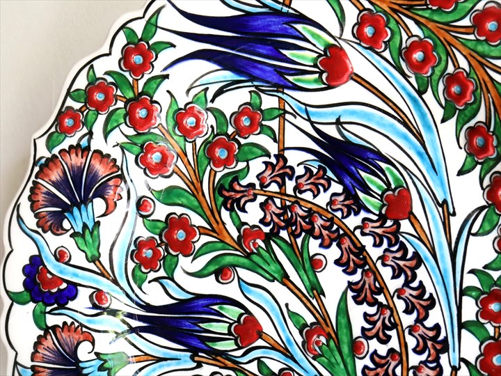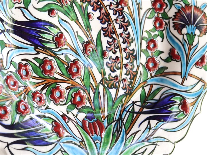 16世紀後半から末にかけて制作された、華やかなオスマントルコスタイルのデザインです。チューリップやカーネーションなどが広がりながら伸びゆく様子が描かれています。赤色の花びら箇所には、立体的に盛り上がった釉薬を使い、凹凸のある豪華な絵付けが楽しめます。