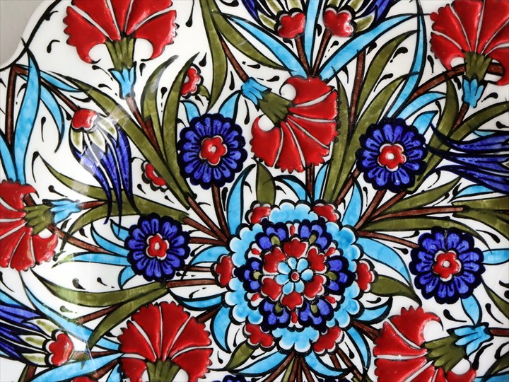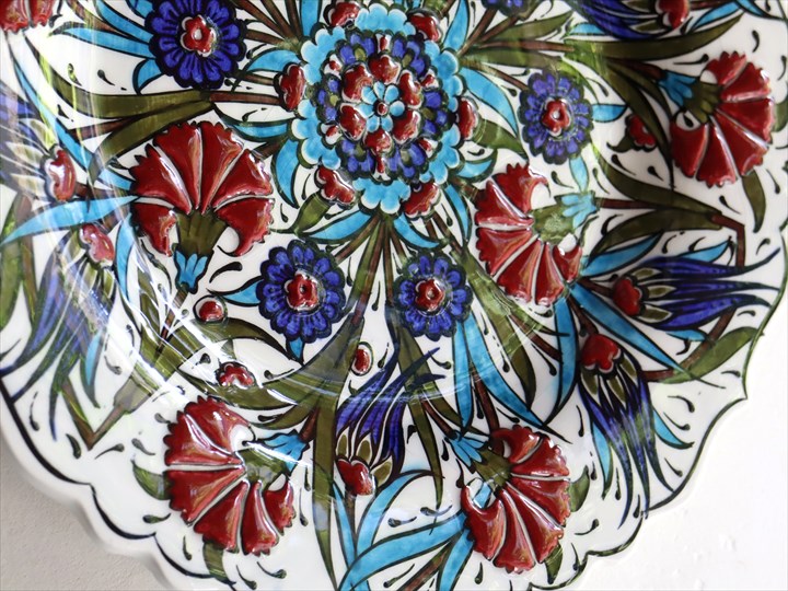16世紀後半から末にかけて制作された、華やかなオスマントルコスタイルのデザインです。チューリップやカーネーションなどが広がりながら伸びゆく様子が描かれています。赤色の花びら箇所には、立体的に盛り上がった釉薬を使い、凹凸のある豪華な絵付けが楽しめます。