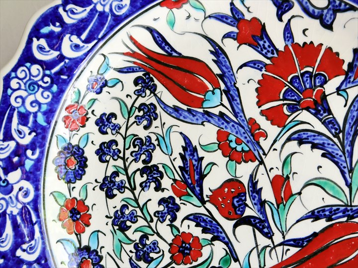 16世紀後半から末にかけて制作された、華やかなオスマントルコスタイルのデザインです。チューリップ、カーネーションなどが広がりながら伸びゆく様子が描かれています。縁にもフラワーデザインが施されており豪華な印象。