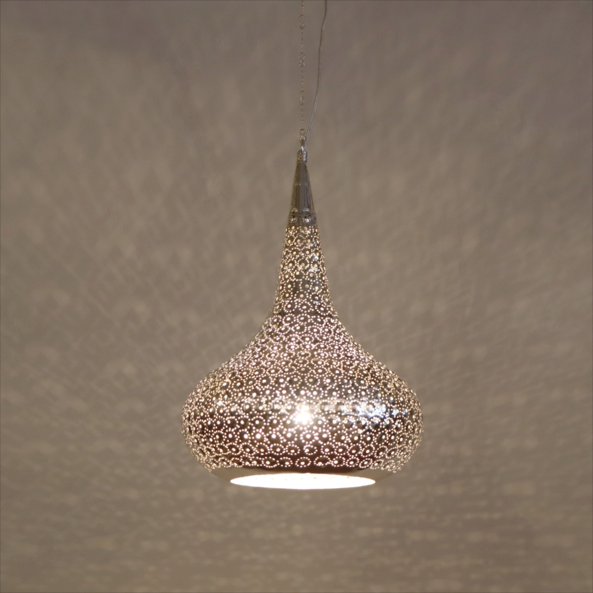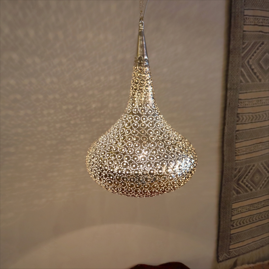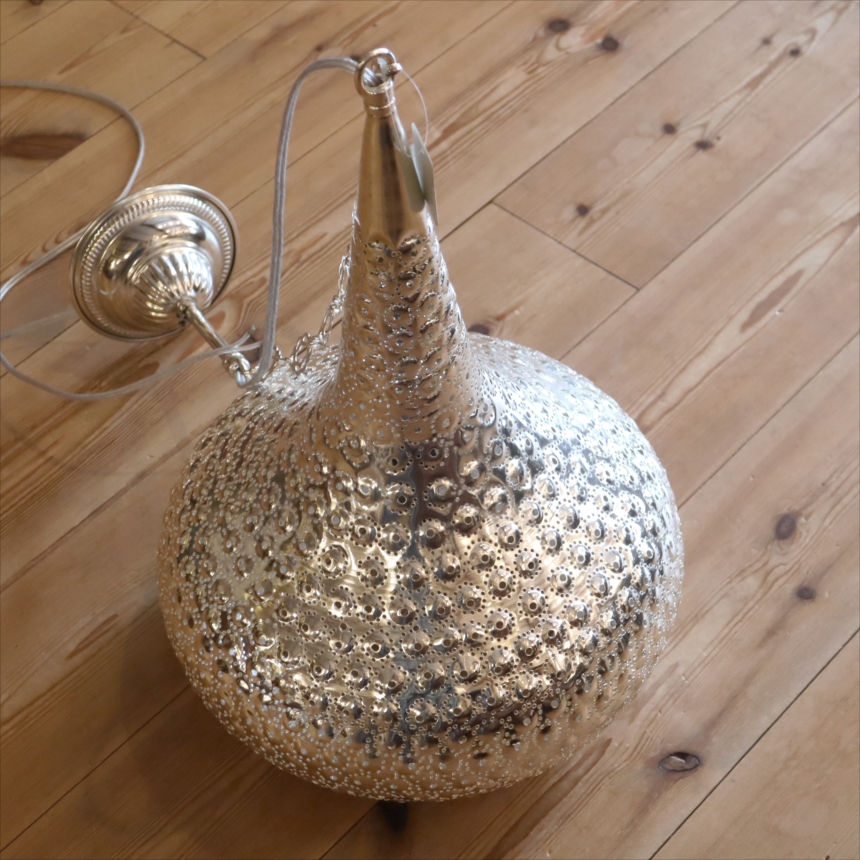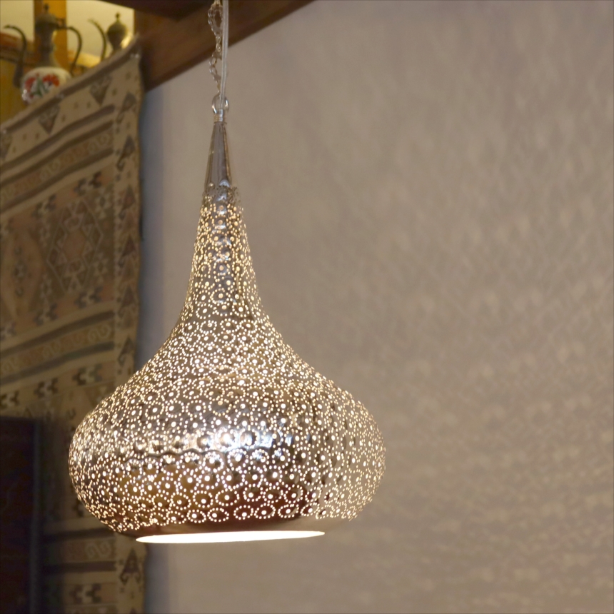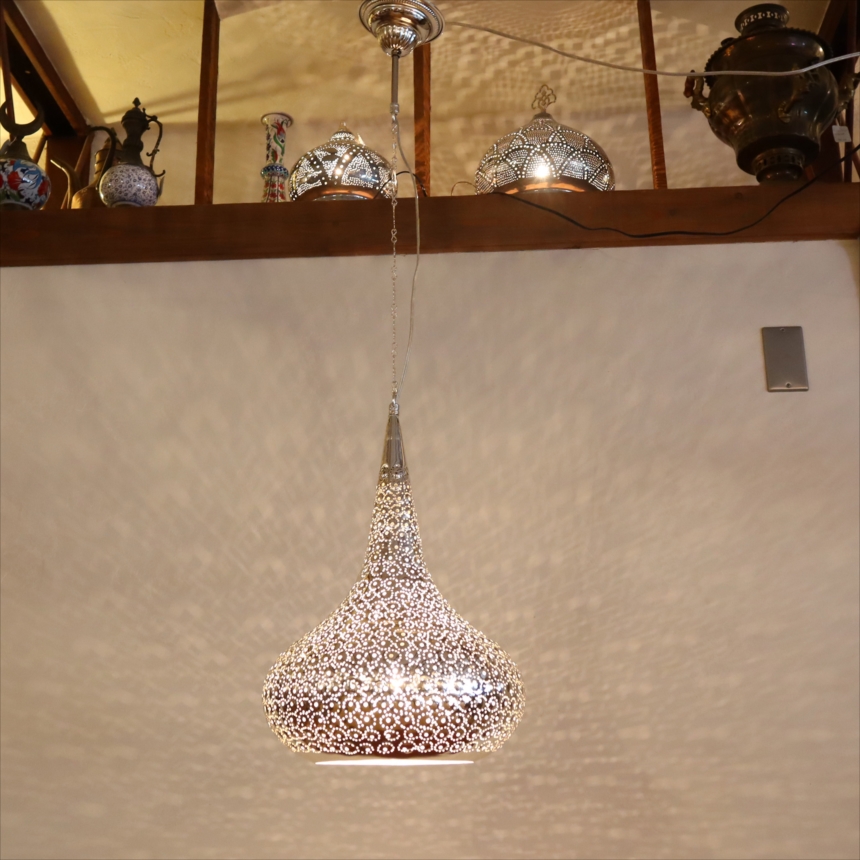 メタルを薄く加工し、コンコンと小さな穴をあけて光をデザインするランプシェードを作りました。中世から作られて来た伝統的な技法で、細工からこぼれる光が壁に映り、エキゾチックな雰囲気を楽しめます。