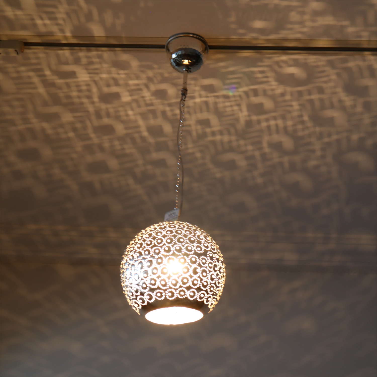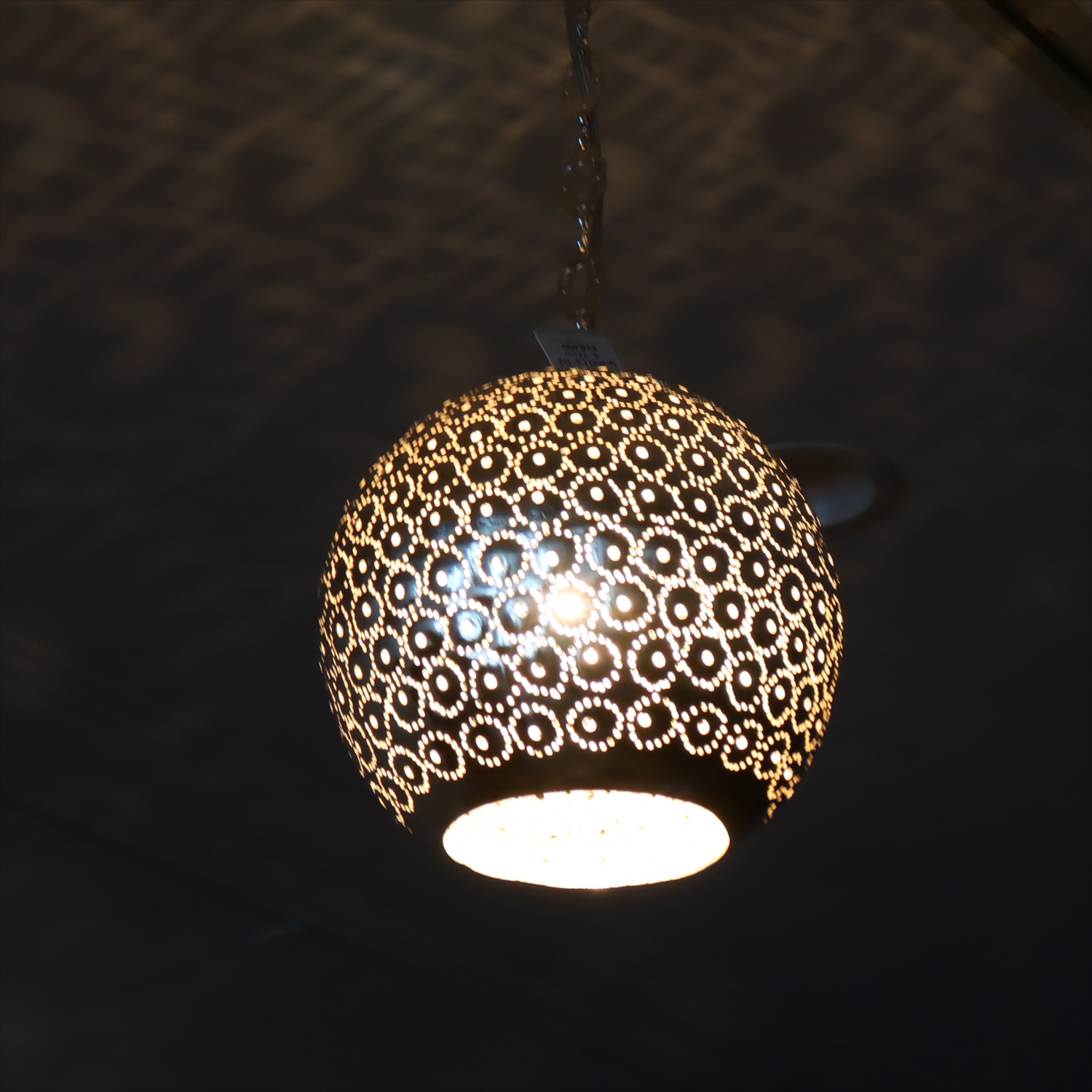 メタルを薄く加工し、コンコンと小さな穴をあけて光をデザインするランプシェードを作りました。中世から作られて来た伝統的な技法で、細工からこぼれる光が壁に映り、エキゾチックな雰囲気を楽しめます。