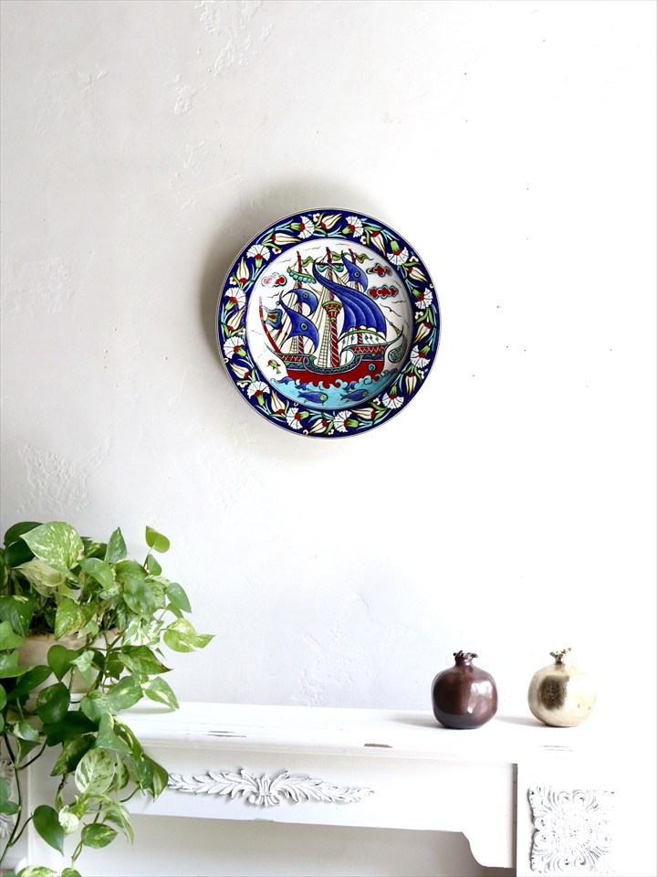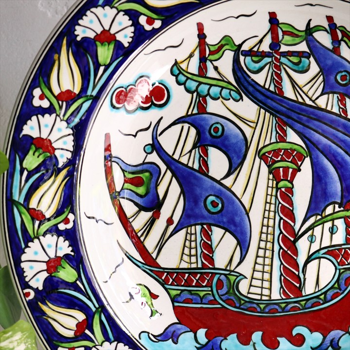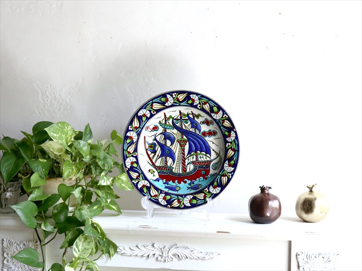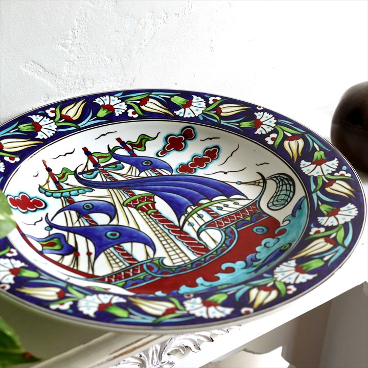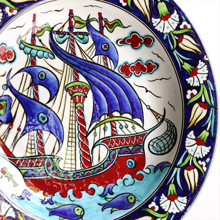 トルコの陶器産業の中心地・キュタフヤで作られる伝統柄の手書き絵皿。オスマントルコ時代の後期、アナトリア西部の港チャナッカレから、ベネチア帝国へ向けて出港する帆船を描いたデザイン。ヨーロッパへの交易品として人気があったそうです。