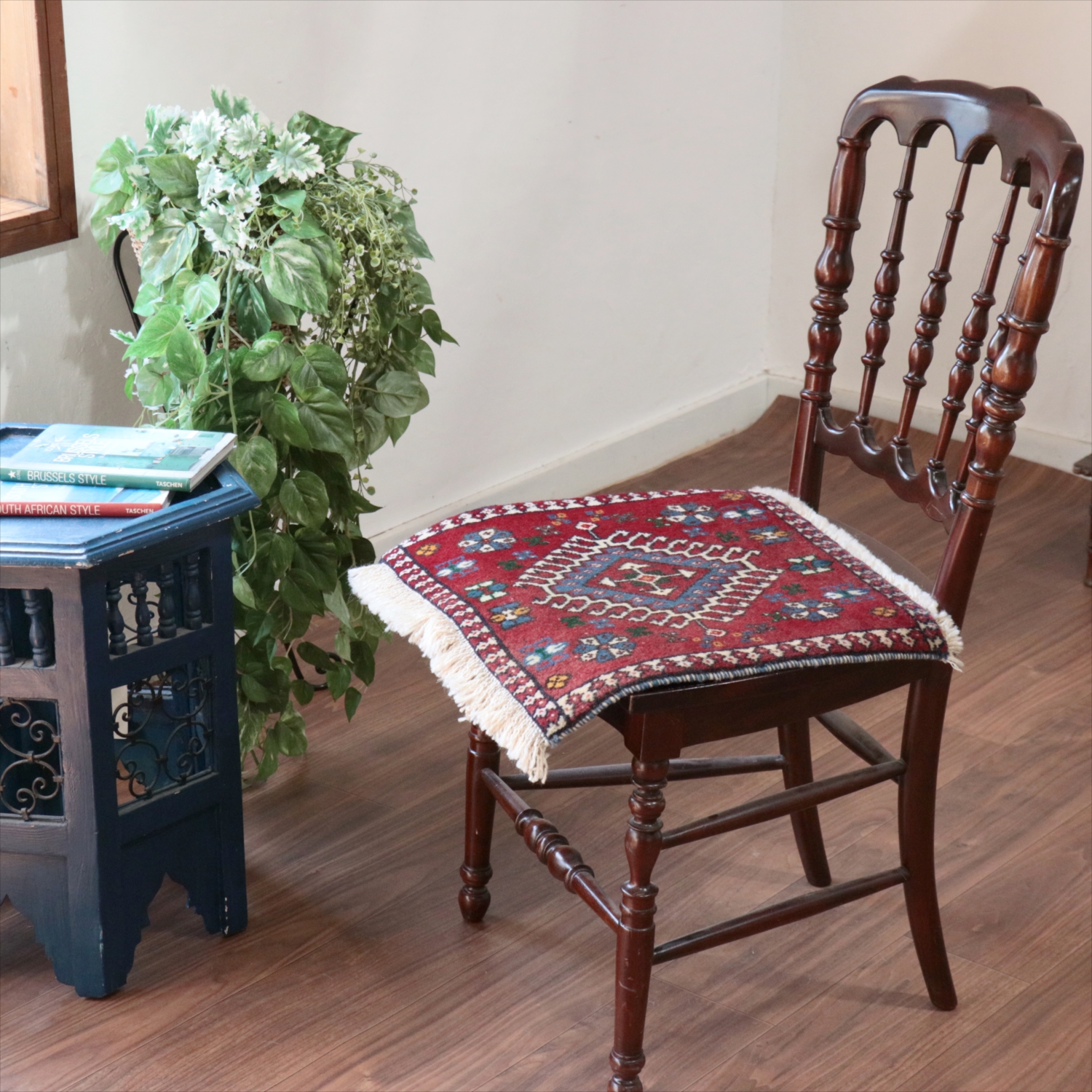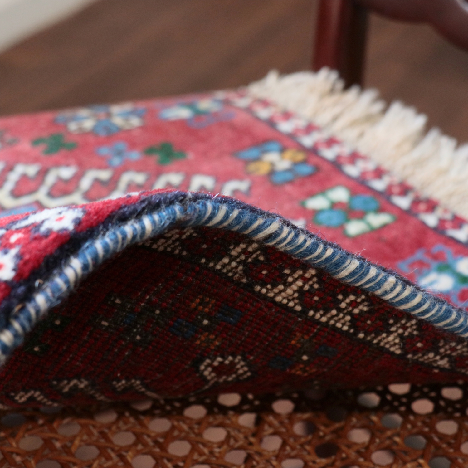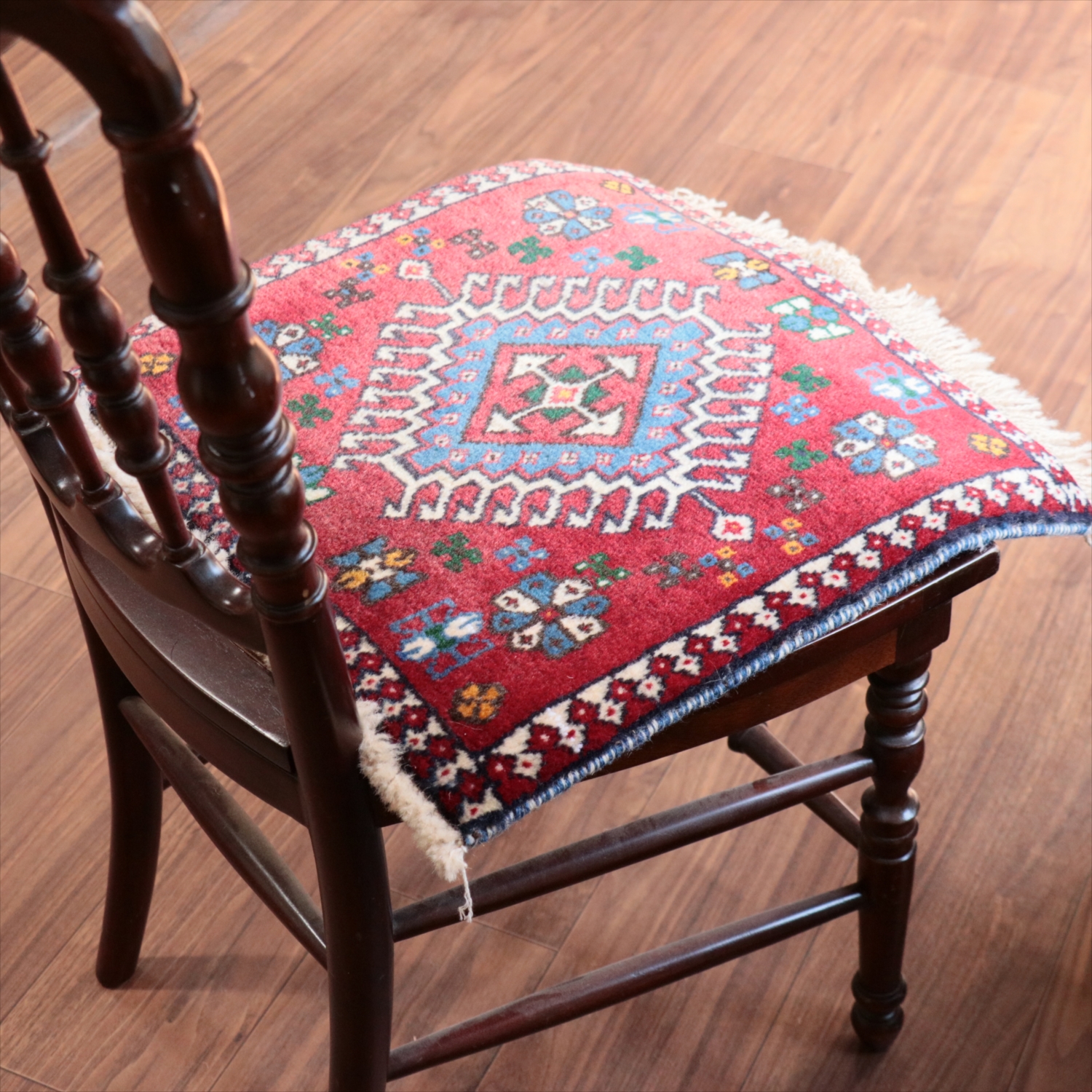 40cm角のミニサイズのラグ。小さいながらも、織りはしっかりしていて本格的です。多少ゆがみが気になりますが、ゆがみも含めて素朴な感じをお楽しみいただければと思います。