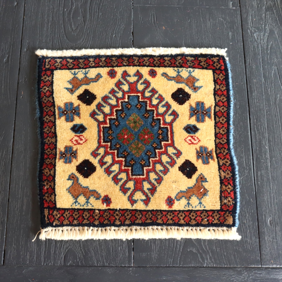 30cm角のミニサイズのラグ。小さいながらも、織りはしっかりしていて本格的です。多少ゆがみが気になりますが、ゆがみも含めて素朴な感じをお楽しみいただければと思います。