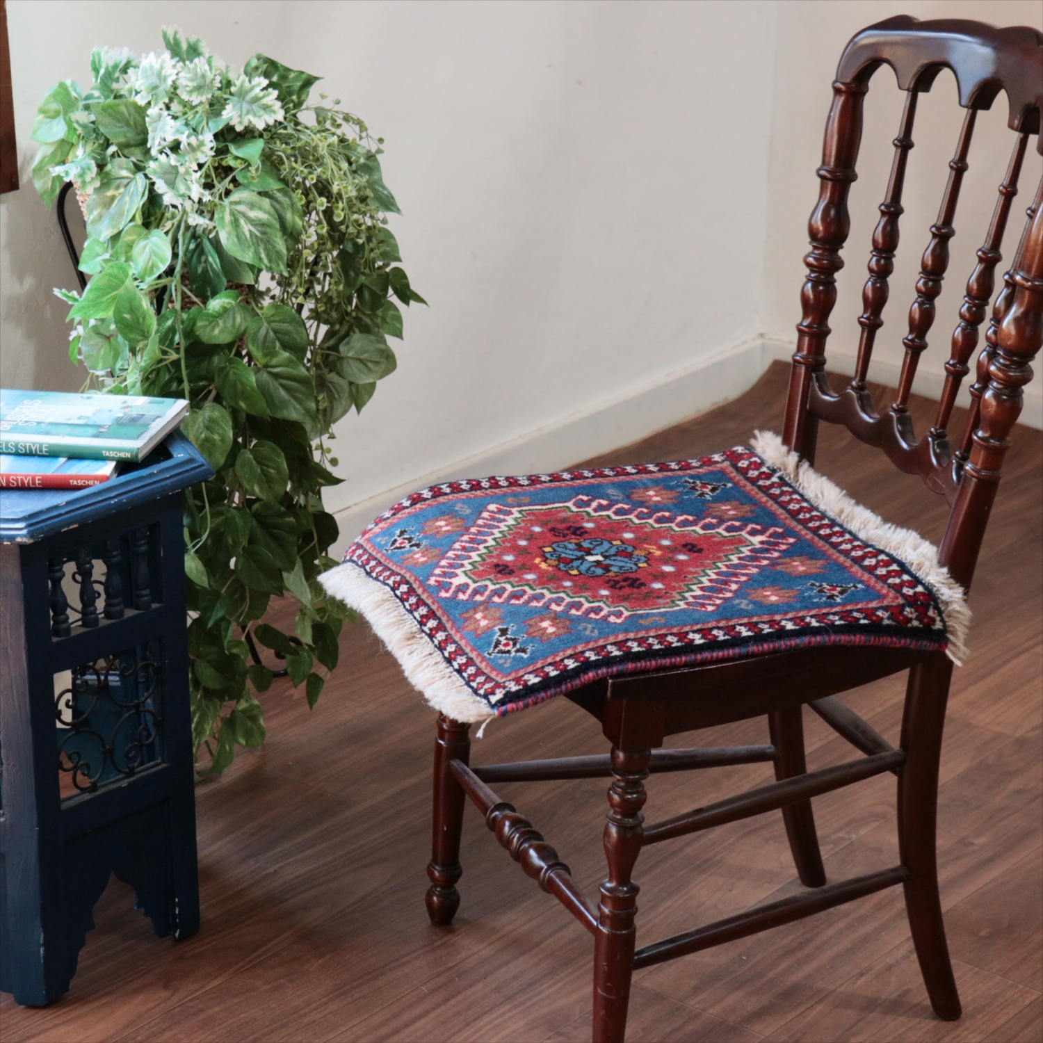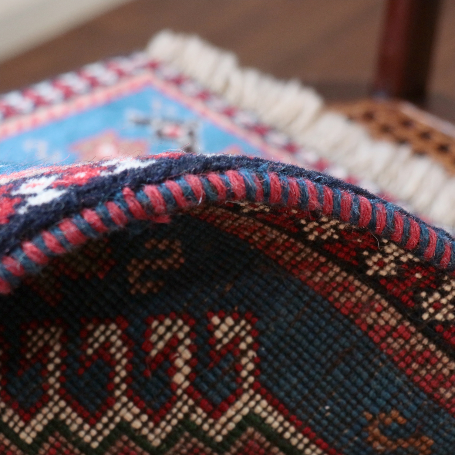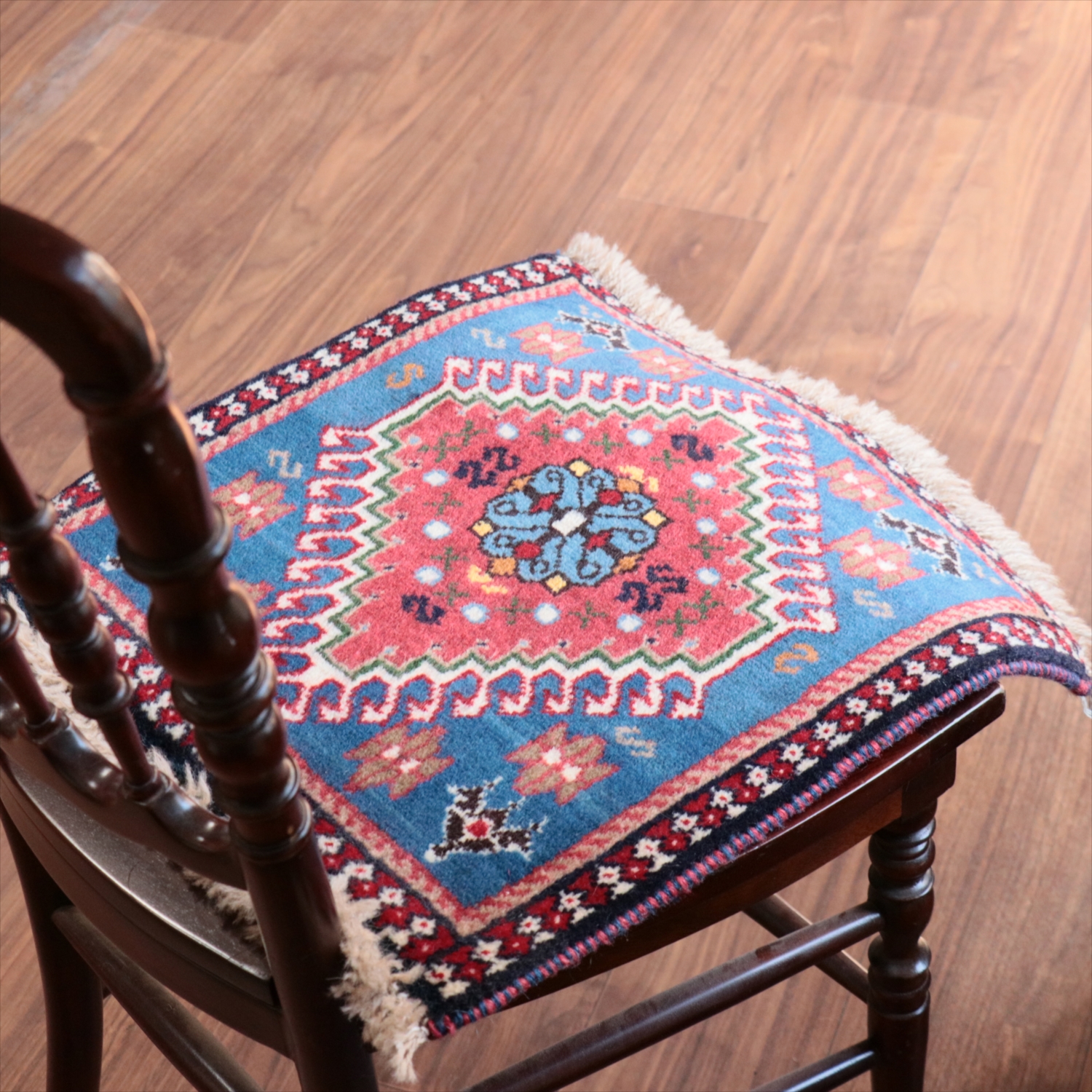 40cm角のミニサイズのラグ。小さいながらも、織りはしっかりしていて本格的です。多少ゆがみが気になりますが、ゆがみも含めて素朴な感じをお楽しみいただければと思います。