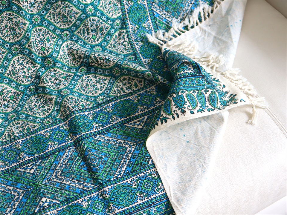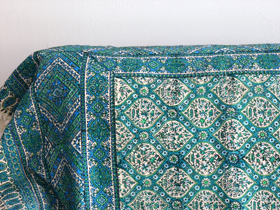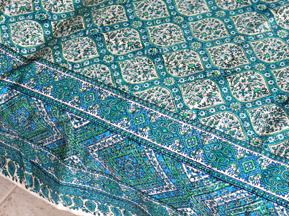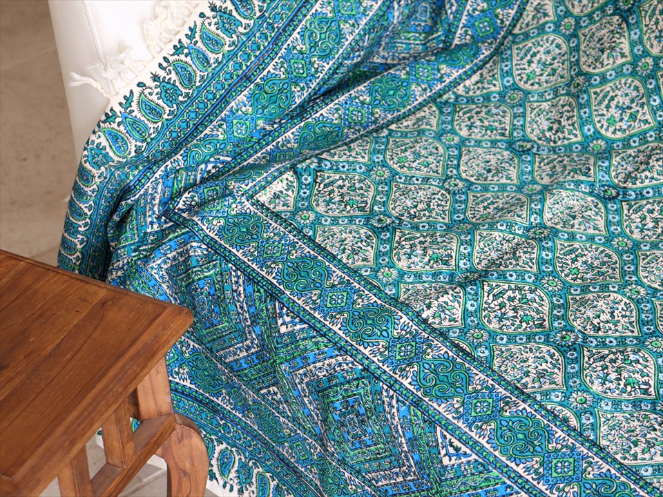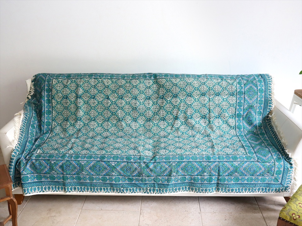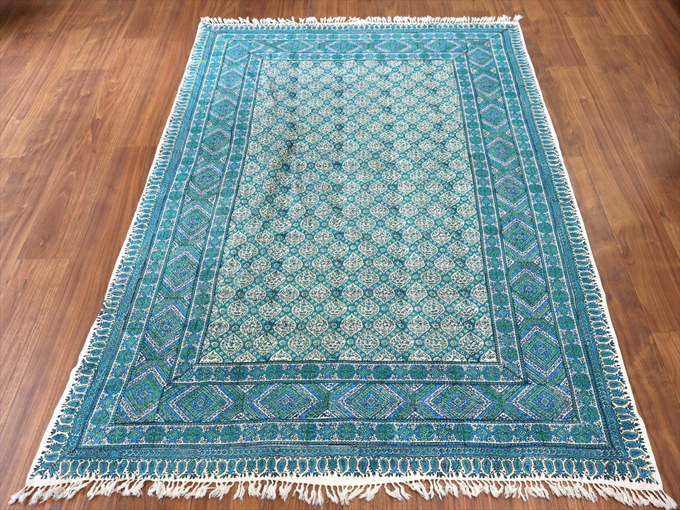 ペルシャ更紗 イラン手染め布 197x133cm アンティークデザイン ブルーグリーン トレリス テーブルクロス ソファカバー