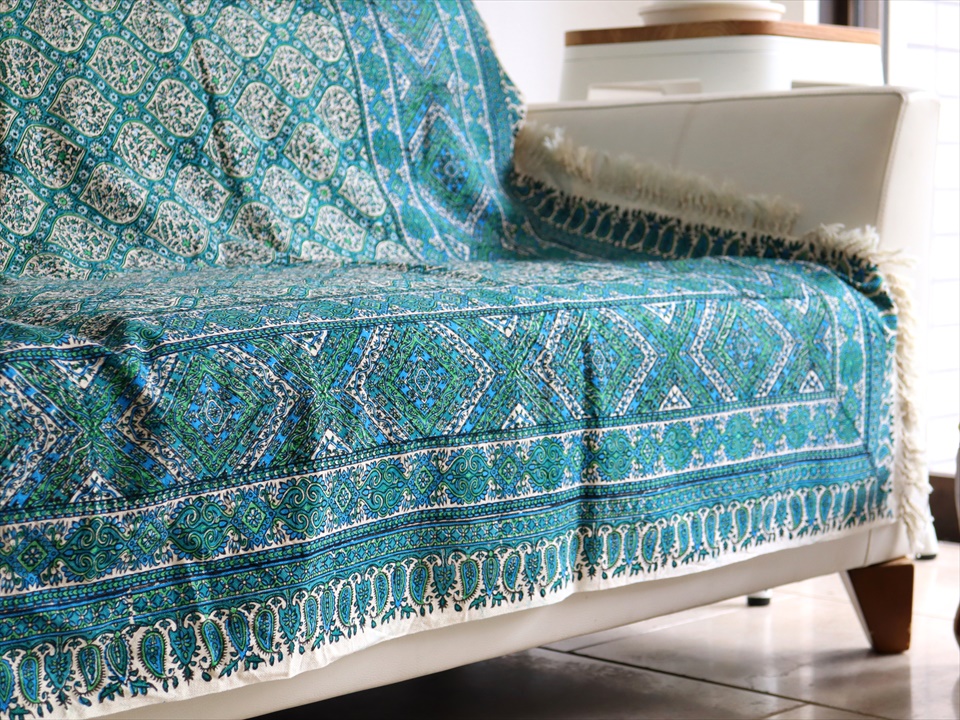 Key:コットン 染色 ブロックプリント 木版 捺染 伝統工芸 ペルシャブルー ペイズリー フリークロス マルチカバー ベッドスプレッド ベッドカバー ソファカバー カーテン タペストリー ファブリック インテリアファブリック クラフト インテリア ペルシャ ペルセポリス イラン 中東 シルクロード アジアン エスニック 200cmサイズ