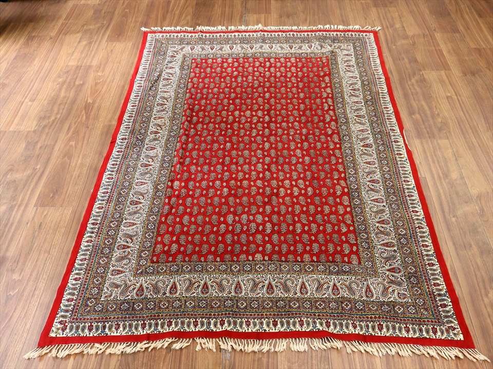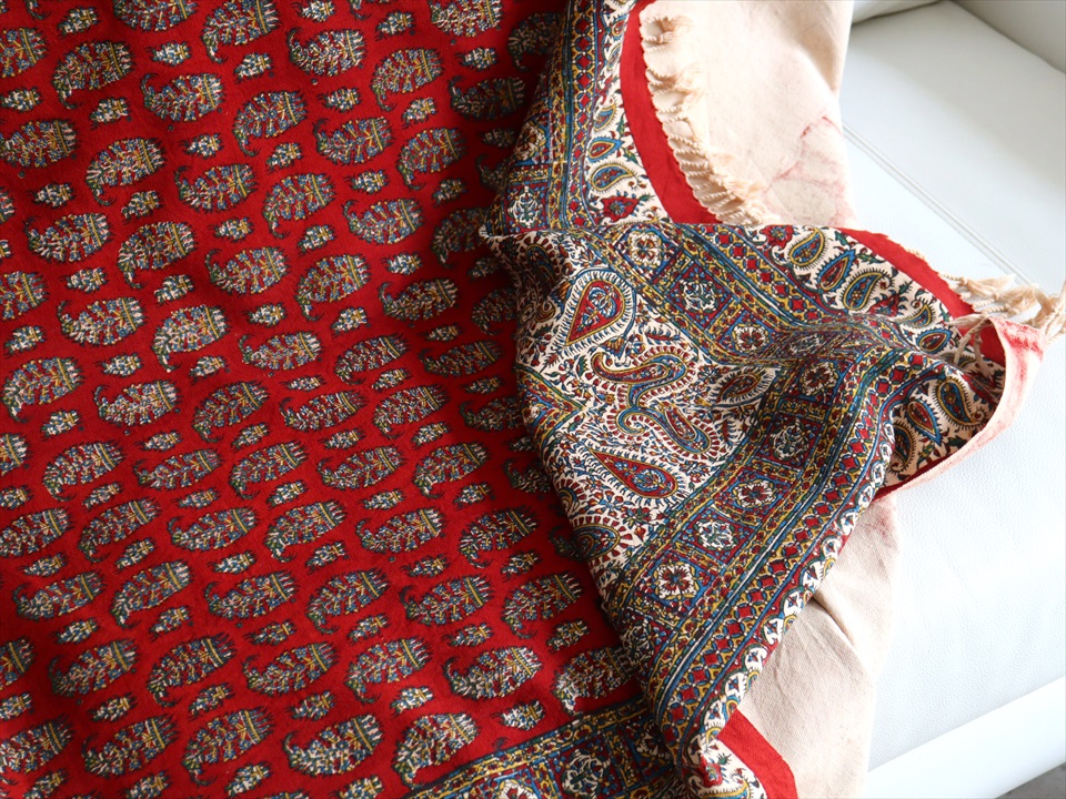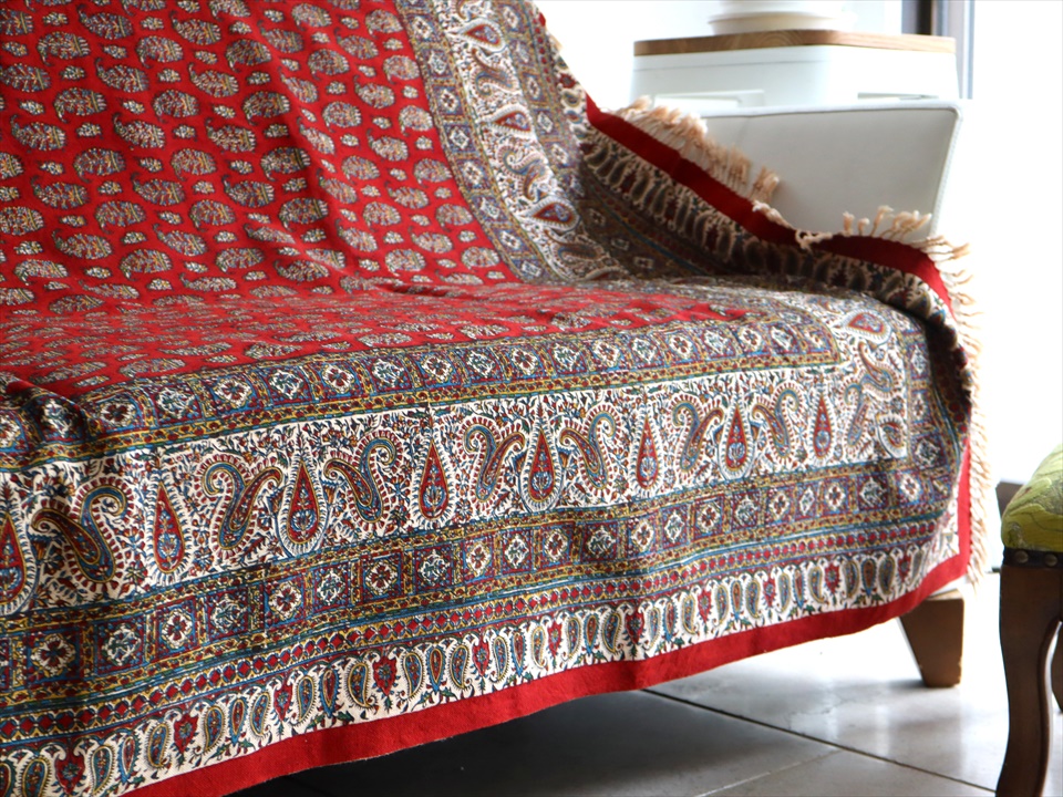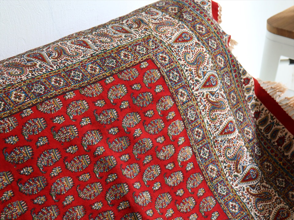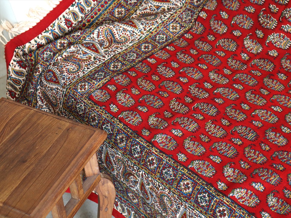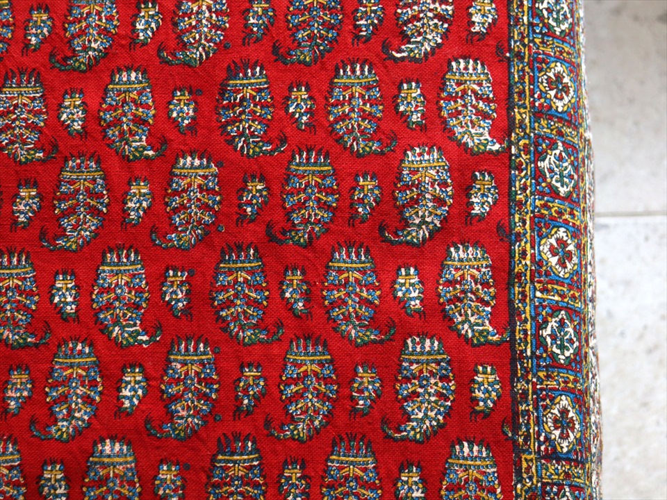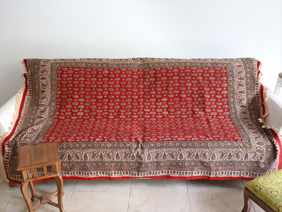 ペルシャ更紗 イラン手染め布 194x131cm アンティークデザイン レッド テーブルクロス ソファカバー