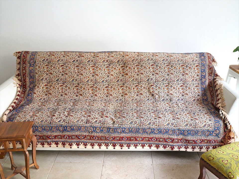 ペルシャ更紗 イラン手染め布 195x132cm アンバー系 フラワー柄 テーブルクロス ソファカバー